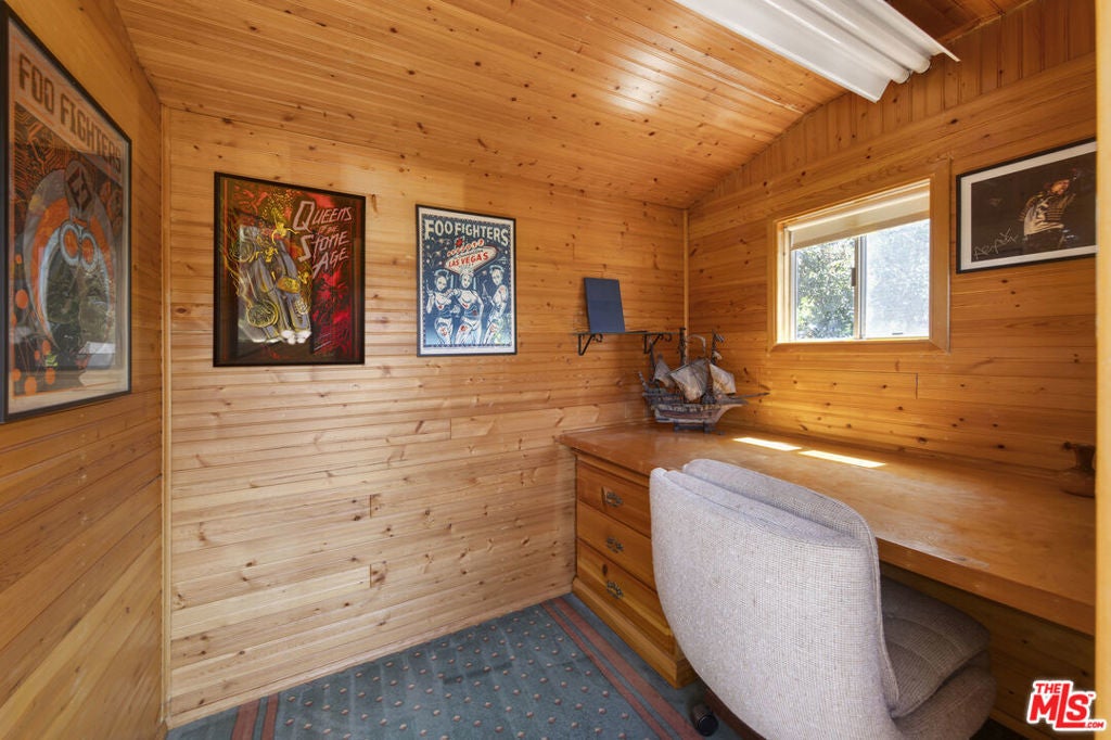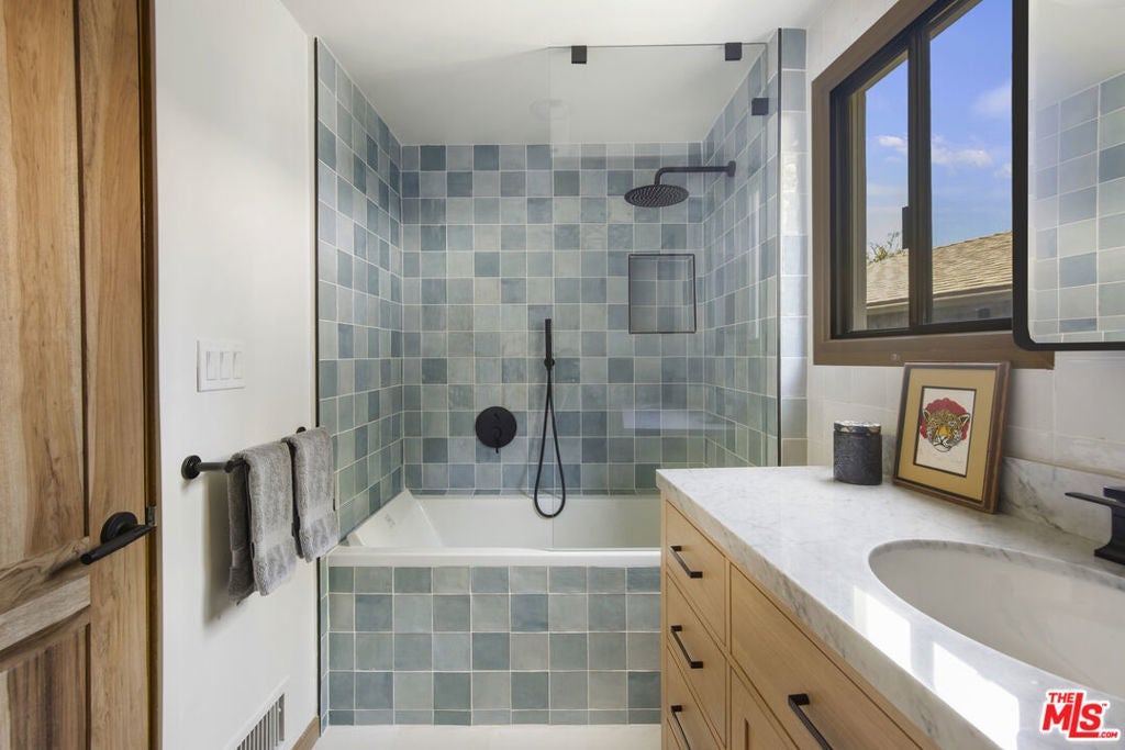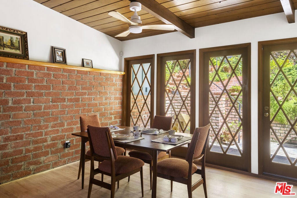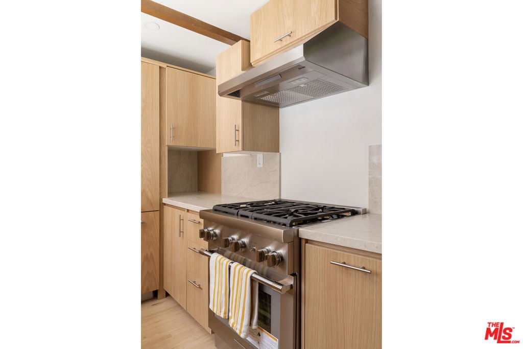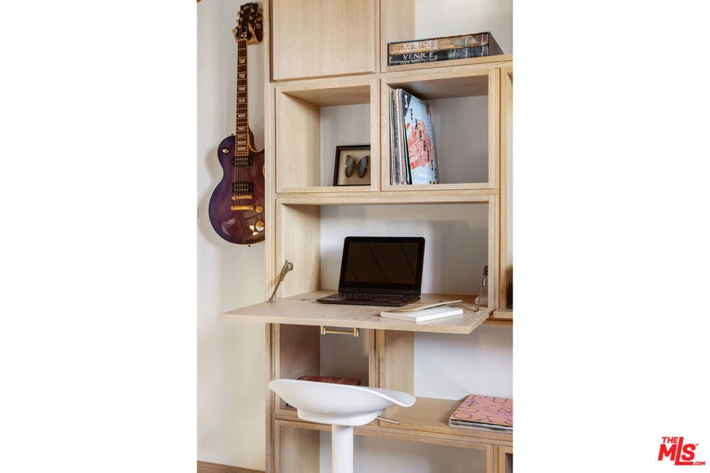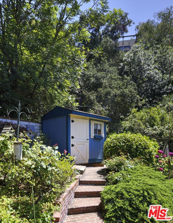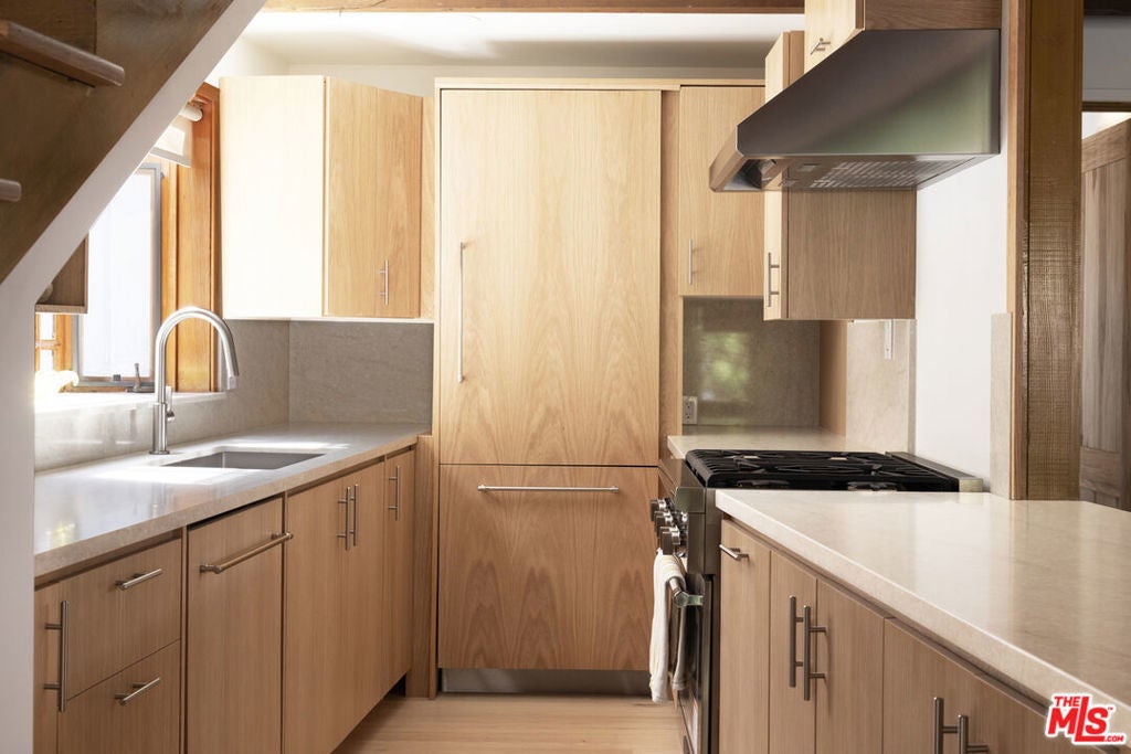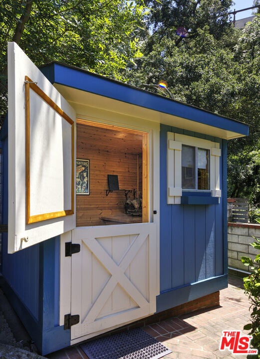 La Maison Bleue is a Mid-Century 1956 Storybook Cottage, perfectly sited in the Hollywood Hills. This Single Family Home has 3+ parking spaces, including a garage! Thoughtfully and completely remodeled to suit contemporary living while honoring its original charm. One bedroom plus a large **loft or second bedroom**. Warm, soft, and grounded in neutral tones, this home radiates tranquility. One must see in person to truly feel the magic. The brand-new kitchen is a chef's dream, featuring brand new high-end appliances, handmade custom White Oak cabinetry, and stunning Taj Mahal quartz countertops. Solid Oak floors flow seamlessly throughout the home. The primary bedroom includes a brand-new en-suite bathroom and a generous walk-in closet. A second full bathroom is conveniently located just off the living room. The laundry area, outfitted with a new LG Wash-tower system, is thoughtfully placed inside the home for ease and comfort. The second bedroom is a versatile loft space complete with a new closet and custom White Oak shelving units. It can easily be enclosed or enjoyed in its current open format, ideal as a guest room, office, or creative studio. Anchoring the living space is a striking brick fireplace wall, adding warmth and character. Step outside into a private Zen retreat: a blooming, auto-irrigated garden that's both enchanting and easy to maintain. At the top of the garden, a whimsical He-She Shed invites imagination and inspiration. Additional features include copper plumbing throughout, a brand-new 200-amp electrical panel, plus another 100-amp panel setup for a hot tub and sauna. This single-family residence offers the rare charm of a canyon cottage with the price tag of a WEHO condo but without the high monthly fee! Completely turn-key and ready to move in. This home is gorgeous!