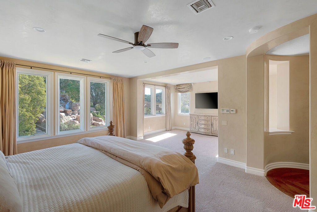 Also listed for lease at $28,000/month. Located behind the iconic guard gates of The Oaks of Calabasas, this estate sits on a rare double cul-de-sac on an approximately 20,000 sq ft corner lot, offering exceptional seclusion. The residence spans approximately 6,255 sqft and is designed for seamless indoor-outdoor living. The home features a grand foyer with soaring ceilings, solid hardwood floors, and a sweeping staircase. Multiple formal and informal living spaces flow around a private interior courtyard, creating an efficient and functional layout for everyday living, entertaining and relaxing. The residence offers 5 en-suite bedrooms, 4 upstairs and 1 downstairs. The primary suite was designed as a luxurious private sanctuary complimented by a spa-inspired his-and-her bathroom featuring separate toilets and a bidet, dual vanities, oversized soaking spa tub, walk-in closet, private gym, enclosed office space, and peaceful views. Additionally Upstairs, 3 en-suite bedrooms surround a large bonus room ideal for children's own play space or movie watching with friends..At the heart of the home is the chef's kitchen and breakfast nook opening directly to the family room to serve as the central gathering place. This open-concept design features professional-grade Viking appliances, a Sub-Zero refrigerator with ice and water dispenser, 3 dishwashers, custom cabinetry, a butler's pantry, 2 walk-in pantries, and an oversized island with vegetable sink. The backyard is a true showpiece. Designed for resort-style enjoyment the grounds feature a built-in BBQ, stovetop burners, a real wood-burning pizza oven imported from Italy, dramatic rockscape, beach-entry pool and spa with cascading waterfalls and waterslide, expansive patio areas, and lush landscaping. Completing the estate include two garages, rooftop solar panel system, EV-charger, tankless water heater, 4 independent A/C units, whole-house central vacuum system, French doors with Phantom screens and plantation shutters..Residents enjoy exclusive 24-hour guard-gated security and access to The Oaks' amenities, including a clubhouse, fitness center, tennis and pickleball courts, sport courts for basketball, and an Olympic-size community pool. The home is minutes from The Commons at Calabasas offering premier dining and shopping, top-rated schools and scenic & hiking trails.