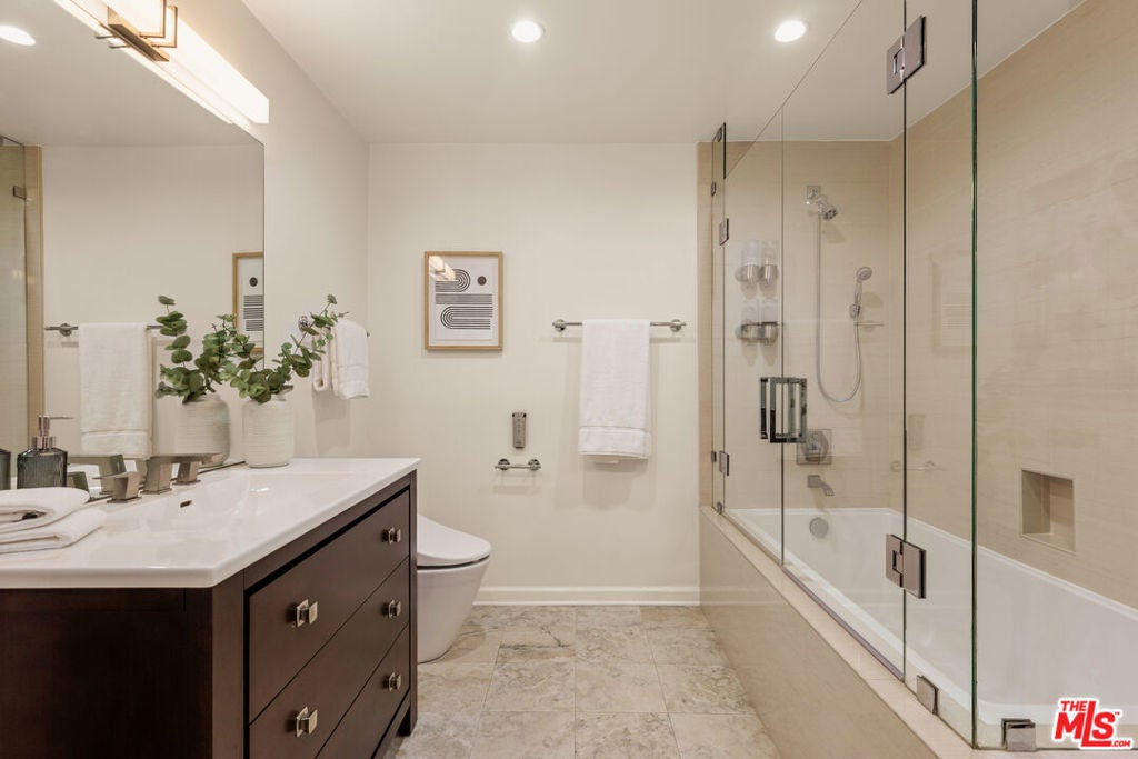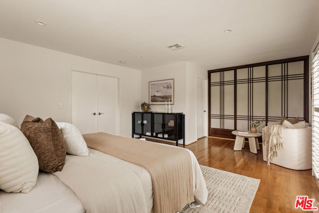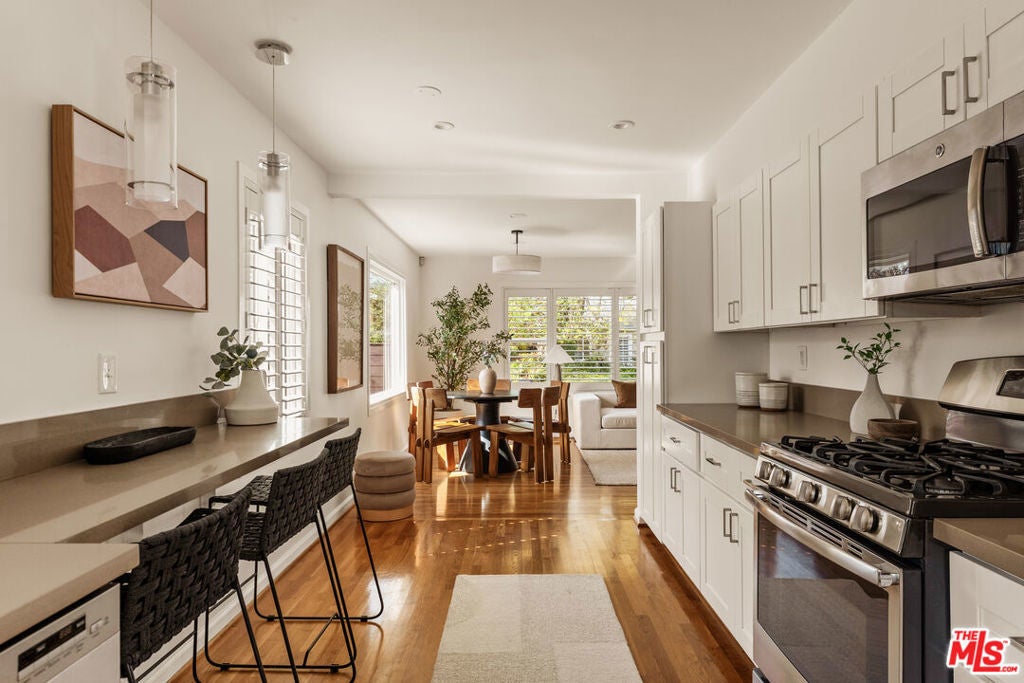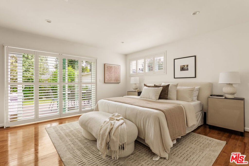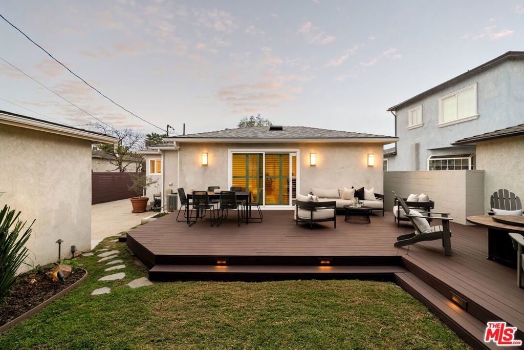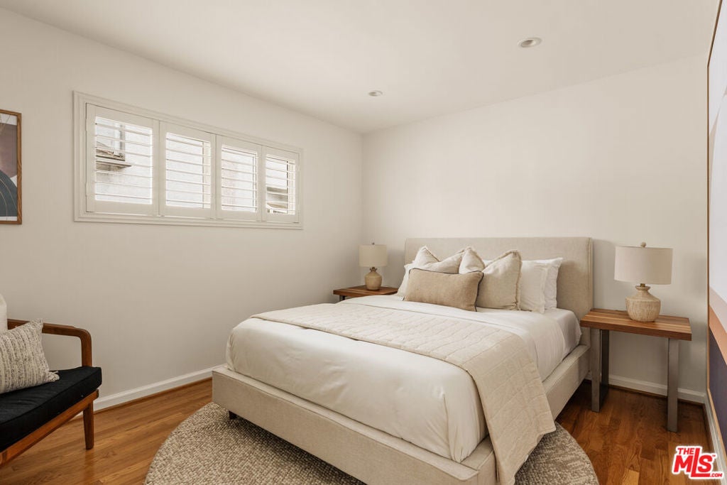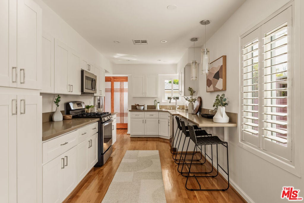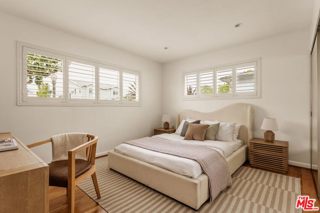 This light-filled residence is ideally situated in the highly sought-after Kentwood neighborhood of Westchester, offering an exceptional blend of refined design and comfortable family living. A beautifully landscaped, terraced front entry sets the tone, welcoming you into a thoughtfully curated interior featuring white oak hardwood floors, fresh designer paint, plantation shutters throughout, and an effortless, open flow. The spacious living areas are both inviting and sophisticated, while the remodeled bathrooms showcase high-end finishes, including updated flooring, elegant fixtures, and a beautifully reimagined tub and shower. The kitchen is conveniently located just off the living room and features a door leading directly to the backyard, creating an easy flow for indoor-outdoor living and everyday functionality. Two generously sized secondary bedrooms are filled with natural light and provide ideal space for family, guests, or a home office. A wide, extended hallway leads to the private primary suite, thoughtfully positioned for maximum tranquility. This serene retreat features dual closets, including a walk-in, and a spa-inspired bathroom with floating vanities, a glass-enclosed shower, and a solar tube that fills the space with soft, natural light. A sliding glass door offers seamless indoor-outdoor living with direct access to the backyard. Designed for both entertaining and everyday enjoyment, the backyard features a spacious deck perfect for al fresco dining, a lush grassy yard ideal for play, and a tranquil waterfall that creates a peaceful, retreat-like setting. Completing the property is a detached two-car garage with abundant storage and exciting potential for a future guesthouse, ADU, or flexible living space. This is a rare opportunity to own a home that effortlessly combines style, function, and warmth in one of Westchester's most desirable neighborhoods.