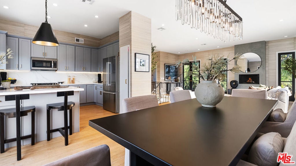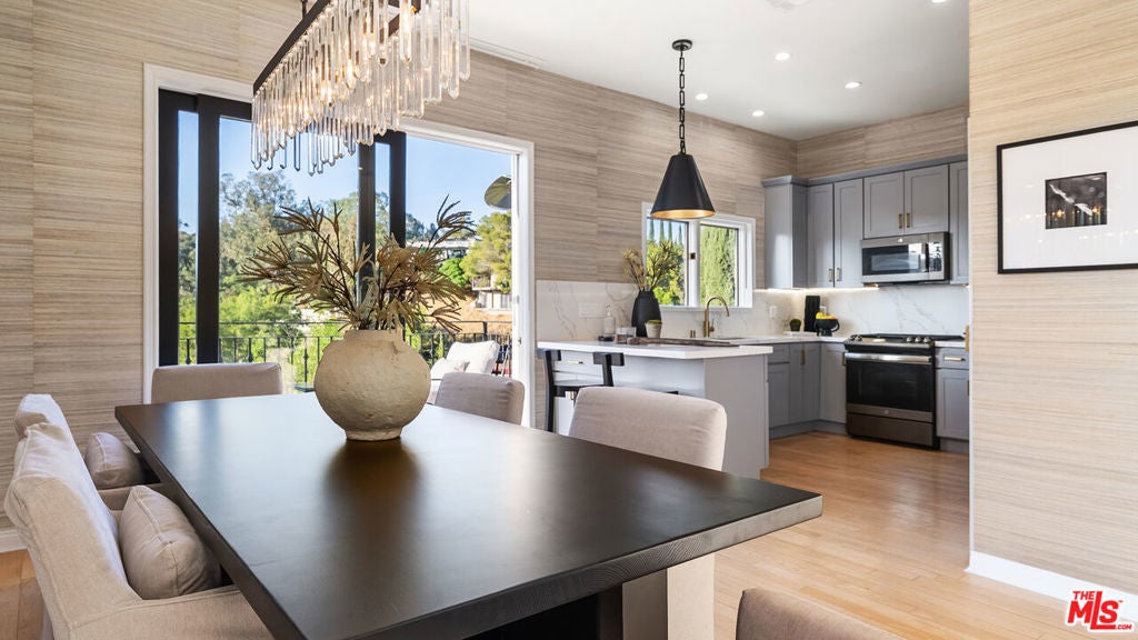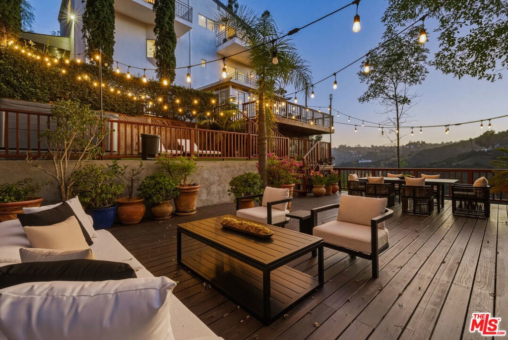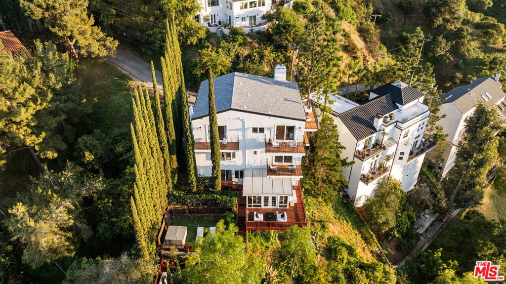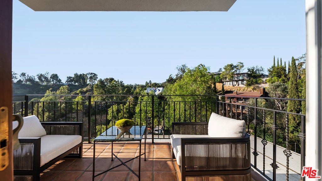 Tucked away in the privacy of Laurel Canyon, this thoughtfully updated contemporary art-deco retreat offers sweeping views of rolling hills and a true sense of calm, all while remaining just minutes from the heart of Los Angeles. Framed by mature cypress trees and filled with natural light, the home feels like a private escape with a strong connection to its canyon setting. The main residence features four bedrooms and four bathrooms with refined finishes and a highly functional layout ideal for both everyday living and entertaining. Two distinct living areas flow seamlessly into a gourmet kitchen, while multiple balconies invite indoor outdoor living and showcase serene canyon views from nearly every angle. The primary suite serves as a private sanctuary with expansive views, custom closets, and a spa inspired bathroom featuring marble finishes, a soaking tub, heated floors, and a glass enclosed shower. Below the main home, a separate one bedroom guest residence offers its own private entrance, full kitchen, in unit laundry, sunroom, and wrap around deck, making it ideal for guests, extended family, or a home office. Outdoor living is exceptional with multiple tiered decks designed for lounging, dining, and entertaining, along with a spa perfect for relaxing day or night. Additional amenities include a two car garage, private carport, ample parking, and a quiet cul de sac location, delivering a rare blend of privacy, comfort, and refined canyon living in one of the most sought after enclaves of the Hollywood Hills.