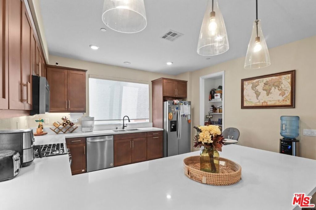 Welcome to this beautiful and elegant three-level townhome ready for its next owner, ideally situated in the heart of Gardenaone of the South Bay's most vibrant and culturally rich cities, known for its more than 240 restaurants offering wonderful cuisine from around the world. This thoughtfully designed 3-bedroom, 3.5-bath townhome offers exceptional versatility and modern comfort. Entry through the front patio or directly from the spacious side-by-side two-car private garage into the foyer. There you will find a versatile bedroom and bathroom, perfect for guests, a home office, gym, or cozy den. The bedroom opens into the patio for that indoor/outdoor experience perfect for BBQs, morning coffee, or unwinding after a long day. The second level is the heart of the home, featuring an open-concept living room, dining area, and kitchen with high ceilings and abundant natural light. The magnificent kitchen showcases quartz countertops, stainless steel appliances, ample wood cabinetry, a large pantry, recessed lighting, and an oversized quartz island that functions beautifully as a breakfast bar or entertaining hub. A conveniently located powder room sits near the stairs, ideal for guests. The third level hosts two spacious en-suite bedrooms. The luxurious primary suite features a large walk-in closet and a spa-inspired bathroom with dual sinks, a separate soaking tub and shower, and a private toilet room. The secondary bedroom includes its own full bathroom, offering privacy and comfort for family or guests. Here you will also find side by side washer dryer hookups. Located just minutes from the beach cities, SoFi Stadium, Intuit Dome (Clippers Arena), LAX, and Downtown Los Angeles, this home also provides quick access to Del Amo Fashion Center, Target, Albertsons, Sam's Club, and countless local coffee shops and eateries. Commuters will appreciate the proximity to the 110, 405, 105, and 91 freeways. Set within a desirable gated community featuring low HOA fees, a children's play area, and ample guest parking, this beautiful and cozy townhome presents a rare opportunity to own in one of Gardena's most sought-after neighborhoods. Don't miss your chance to make this exceptional property your next home.
