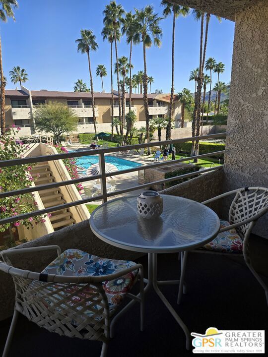 Charming and clean, this 1 bedroom 1 bath condo is in a great location in the popular Palm Springs Biarritz community. One of two balconies overlooks the community pool and spas. A dedicated parking spot in the gated community garage is conveniently located near the stairs. Beautiful resort style grounds invite you to relax and enjoy the sparkling pool and tennis courts. Convenient onsite laundry facilities and only blocks from downtown with shops, dining and night life. Offered Turnkey furnished, so it's move-in ready for a full time residence or your vacation get away. No rental restrictions offers you a unique opportunity for an investment property at a very attractive price. Many possibilities...don't miss out!