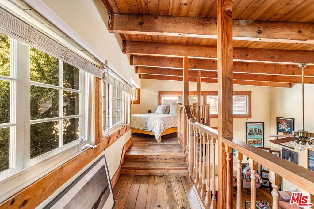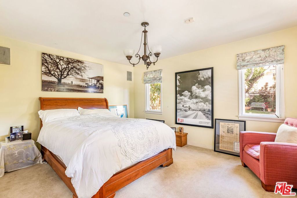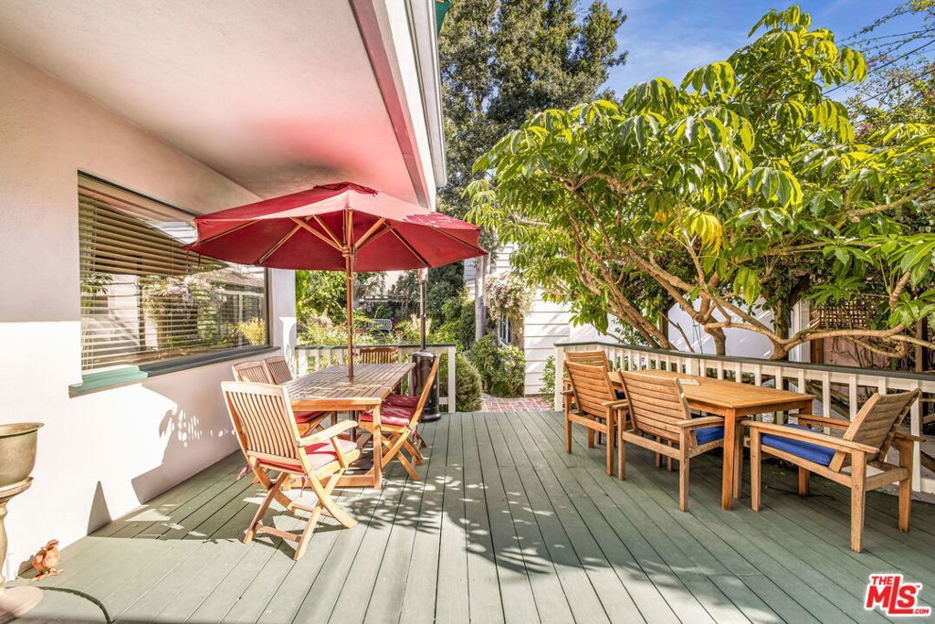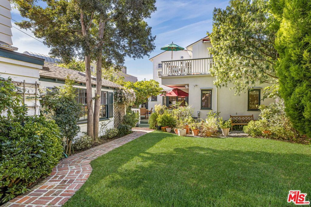 Situated behind a lush privacy hedge in the coveted North of Montana neighborhood, this captivating 3-bed, 4-bath home with remarkable guesthouse blends timeless architectural charm with effortless indoor-outdoor living. The welcoming entry opens to a spacious living room with a vaulted, beamed ceiling, fireplace, and French doors that lead to a wide, covered front porch -- an idyllic spot for morning coffee or evening relaxation. The elegant dining room, which features a beautiful coffered ceiling, is adjacent to the well-appointed kitchen, complete with a Bertazzoni range, stainless steel appliances, and breakfast area. A light-filled garden room at the rear of the home opens to a tranquil patio -- the perfect setting for alfresco dining and entertaining. Beyond, the grassy backyard provides a serene and usable outdoor escape with mature landscaping. Upstairs, two additional bedroom suites are anchored by a bright family room with beamed ceilings that opens to a generous balcony. The expansive primary suite is a true retreat, filled with natural light and featuring vaulted ceilings, a luxurious spa-like bath, and access to the balcony overlooking the backyard's mature treescape. A private first-floor bedroom suite, ideal for guests or flexible living, offers direct access to the garden. A truly one-of-a-kind, open plan 600 sqft. guesthouse with additional loft space, wide plank wood floors, and a full kitchen and bath rounds out the offering and provides exceptional versatility -- perfect for guests, a home office, or creative studio. The two-car garage is currently being used as a gym. Centrally located near all the best restaurants and coffee shops on Montana Avenue.