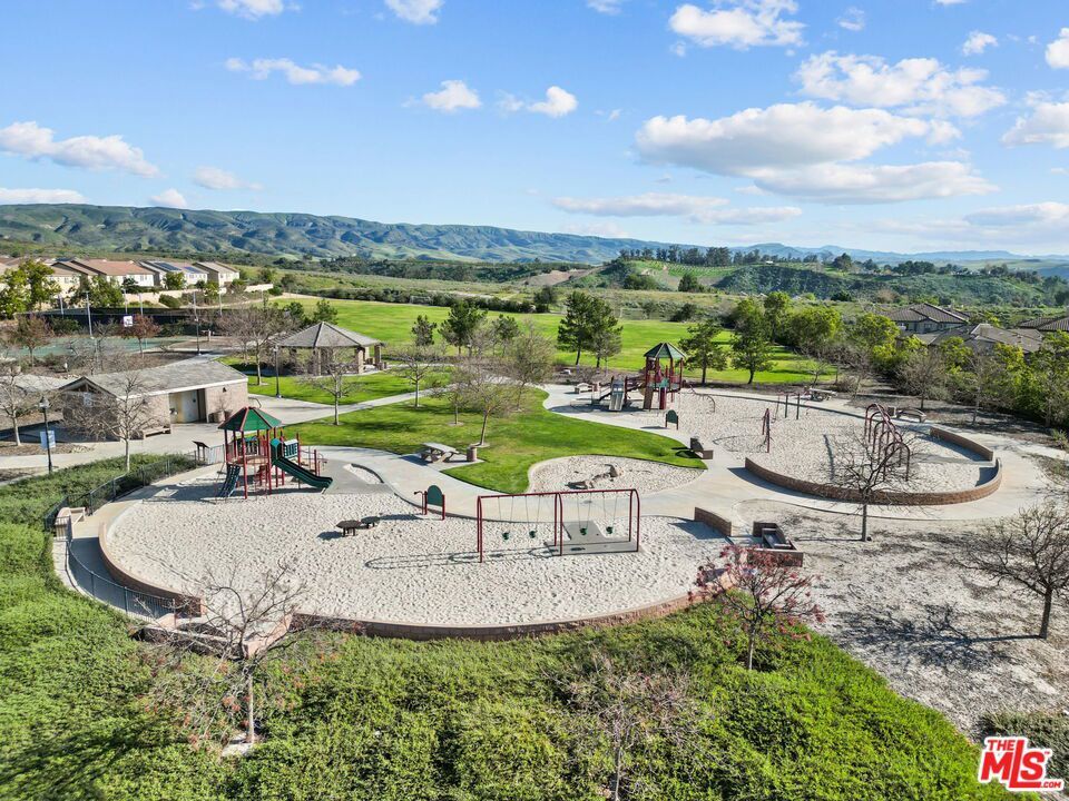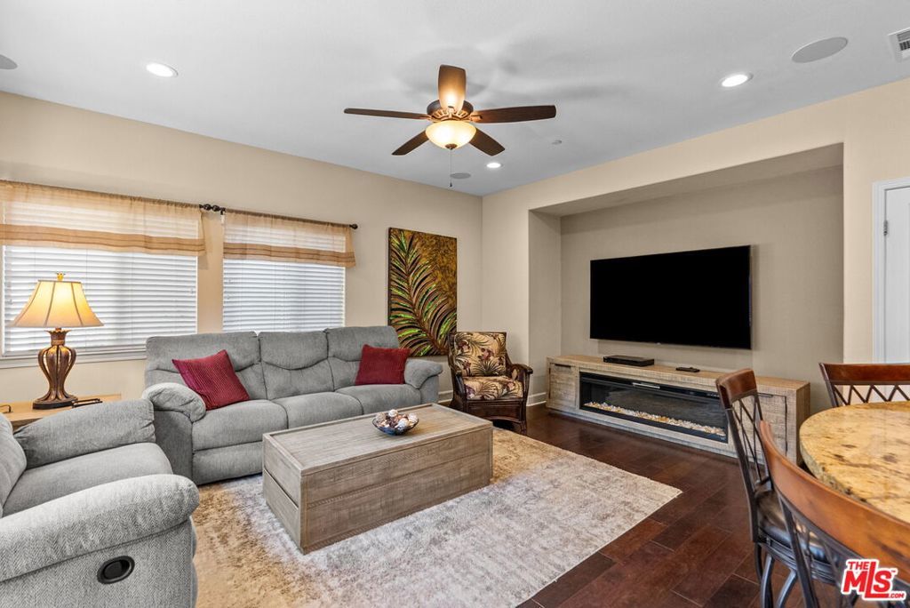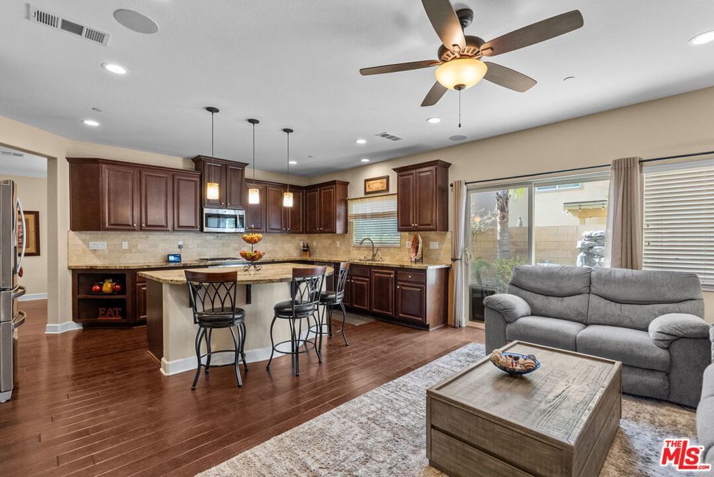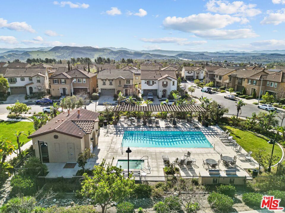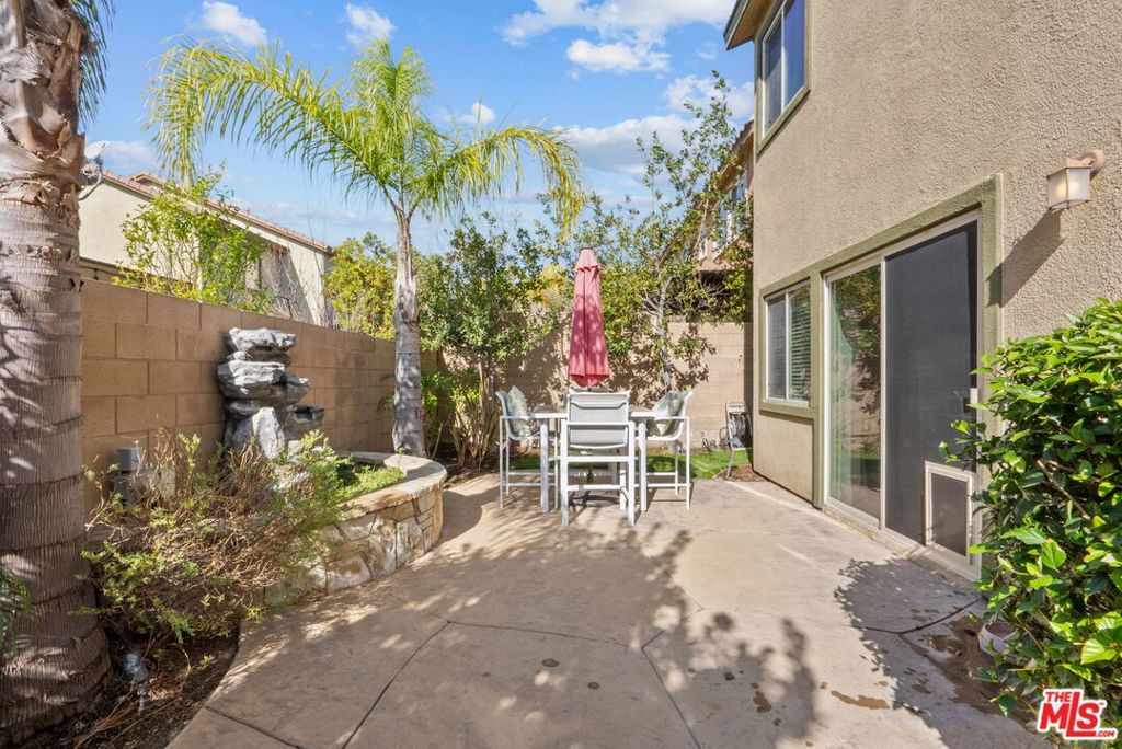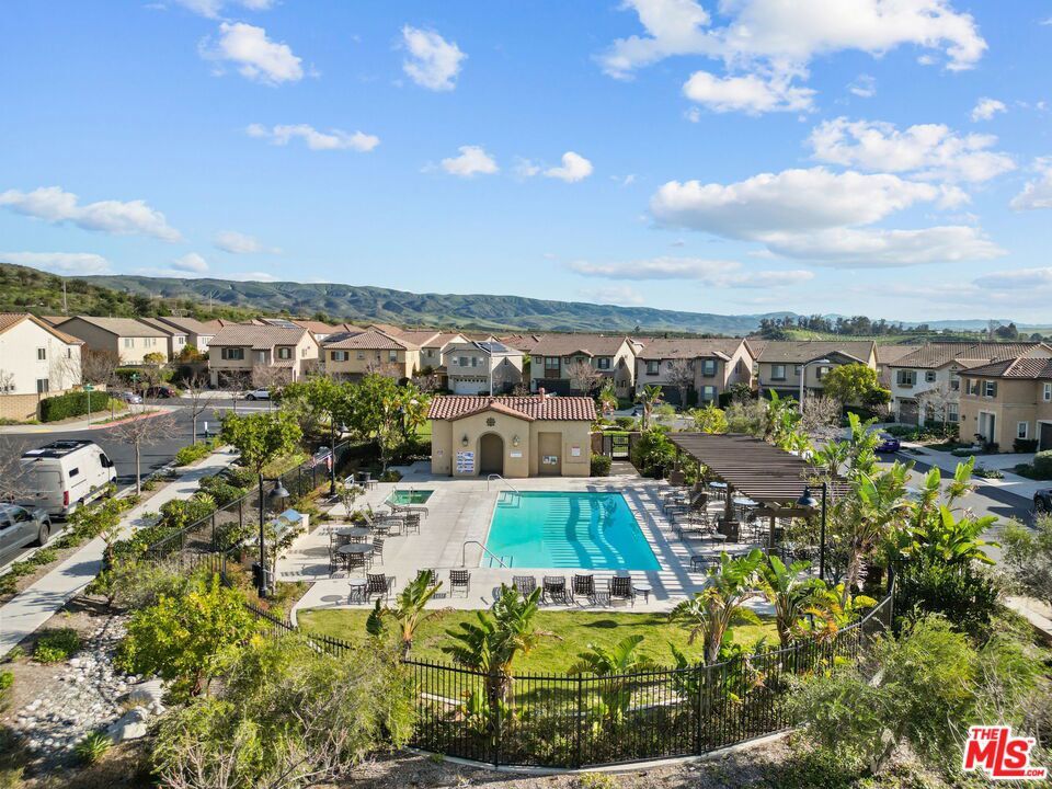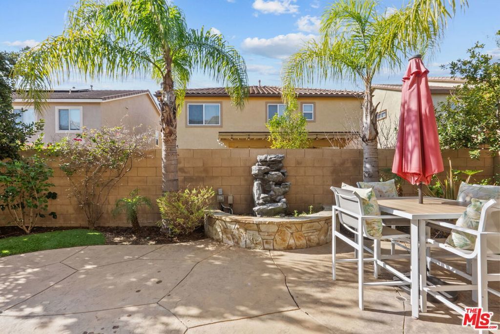 Welcome home to Living Smart Homes in Moorpark Highlands, located in one of Moorpark's most desirable master-planned communities. This charming two-story 4-bedroom, 2.5-bath home is surrounded by lush greens and beautiful mountain views. Step inside to a welcoming entry where high ceilings, crown molding, recessed lighting, rich wood floors, and natural sunlight set the tone. The space opens into an elegant formal living and dining area perfect for entertaining. The kitchen floor plan blends well to the family room, creating an ideal open-concept layout. The kitchen features rich cabinetry, granite countertops, custom tile backsplash, a large center island with bar seating, pendant lighting, stainless-steel appliances, and a modern touch-activated faucet for added convenience. The adjoining family room offers a comfortable gathering space with a sliding glass door to the backyard for effortless indoor-outdoor living. Additional features include direct access to the attached garage, central heating and air conditioning for year-round comfort, dual-pane windows for energy efficiency, ceiling fans and thoughtful finishes throughout. As you make your way upstairs, you arrive at a spacious landing. This versatile space connects all bedrooms, a full bathroom, and a large laundry room for added convenience. The primary suite serves as a private retreat, offering generous space, a walk-in closet, and an ensuite bathroom with dual vanities, a soaking tub, and a separate glass-enclosed shower, creating a spa-like atmosphere. Backyard highlights include stamped concrete, mature palms, a decorative water feature, an orange tree, and a built-in natural gas BBQ hookup for effortless outdoor entertaining. A side yard provides added versatility for pets or storage. The Moorpark Highlands community offers resort-style amenities including a pool, spa, scenic trails, and access to Mammoth Park, featuring 7.5 acres of play areas, multi-use fields, picnic spaces, and lighted tennis and sport courts. Conveniently located near shopping, dining, award-winning schools, and freeway access, this home is nestled in a highly desirable, family-friendly neighborhood.
