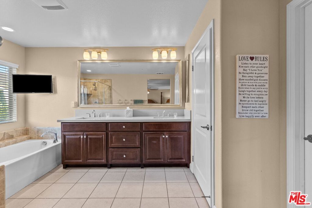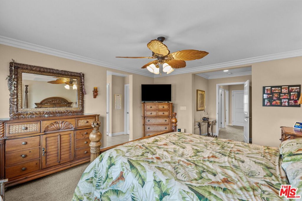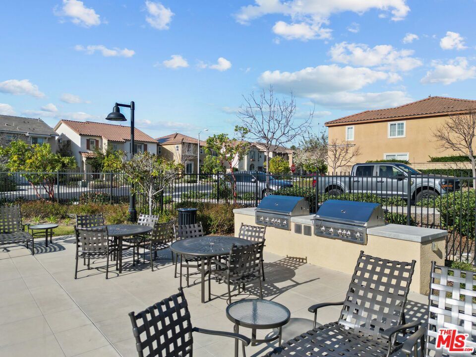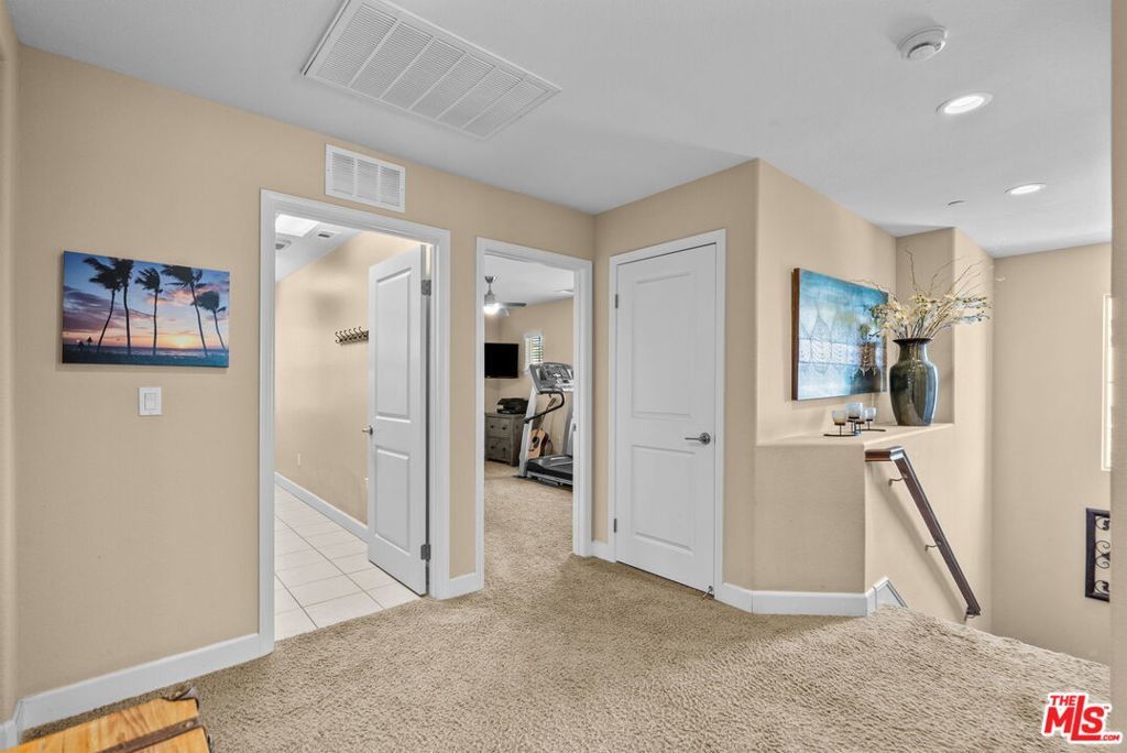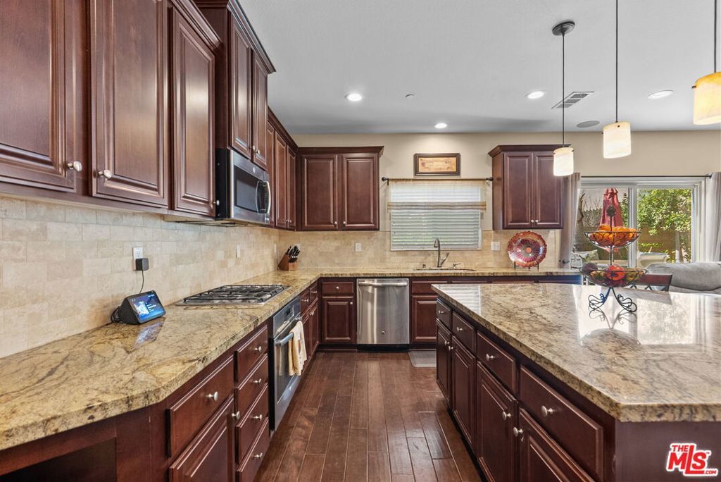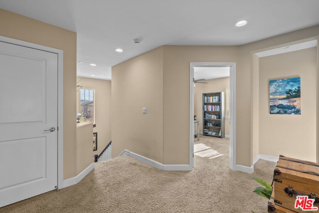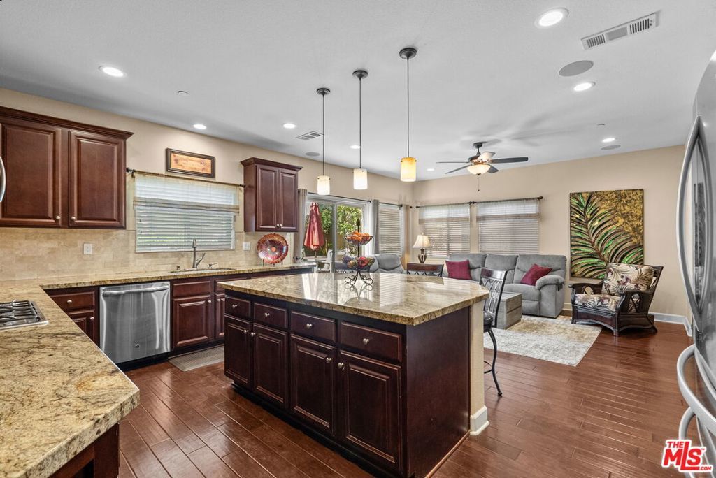 Welcome home to Living Smart Homes in Moorpark Highlands, located in one of Moorpark's most desirable master-planned communities. This charming two-story 4-bedroom, 2.5-bath home is surrounded by lush greens and beautiful mountain views. Step inside to a welcoming entry where high ceilings, crown molding, recessed lighting, rich wood floors, and natural sunlight set the tone. The space opens into an elegant formal living and dining area perfect for entertaining. The kitchen floor plan blends well to the family room, creating an ideal open-concept layout. The kitchen features rich cabinetry, granite countertops, custom tile backsplash, a large center island with bar seating, pendant lighting, stainless-steel appliances, and a modern touch-activated faucet for added convenience. The adjoining family room offers a comfortable gathering space with a sliding glass door to the backyard for effortless indoor-outdoor living. Additional features include direct access to the attached garage, central heating and air conditioning for year-round comfort, dual-pane windows for energy efficiency, ceiling fans and thoughtful finishes throughout. As you make your way upstairs, you arrive at a spacious landing. This versatile space connects all bedrooms, a full bathroom, and a large laundry room for added convenience. The primary suite serves as a private retreat, offering generous space, a walk-in closet, and an ensuite bathroom with dual vanities, a soaking tub, and a separate glass-enclosed shower, creating a spa-like atmosphere. Backyard highlights include stamped concrete, mature palms, a decorative water feature, an orange tree, and a built-in natural gas BBQ hookup for effortless outdoor entertaining. A side yard provides added versatility for pets or storage. The Moorpark Highlands community offers resort-style amenities including a pool, spa, scenic trails, and access to Mammoth Park, featuring 7.5 acres of play areas, multi-use fields, picnic spaces, and lighted tennis and sport courts. Conveniently located near shopping, dining, award-winning schools, and freeway access, this home is nestled in a highly desirable, family-friendly neighborhood.
