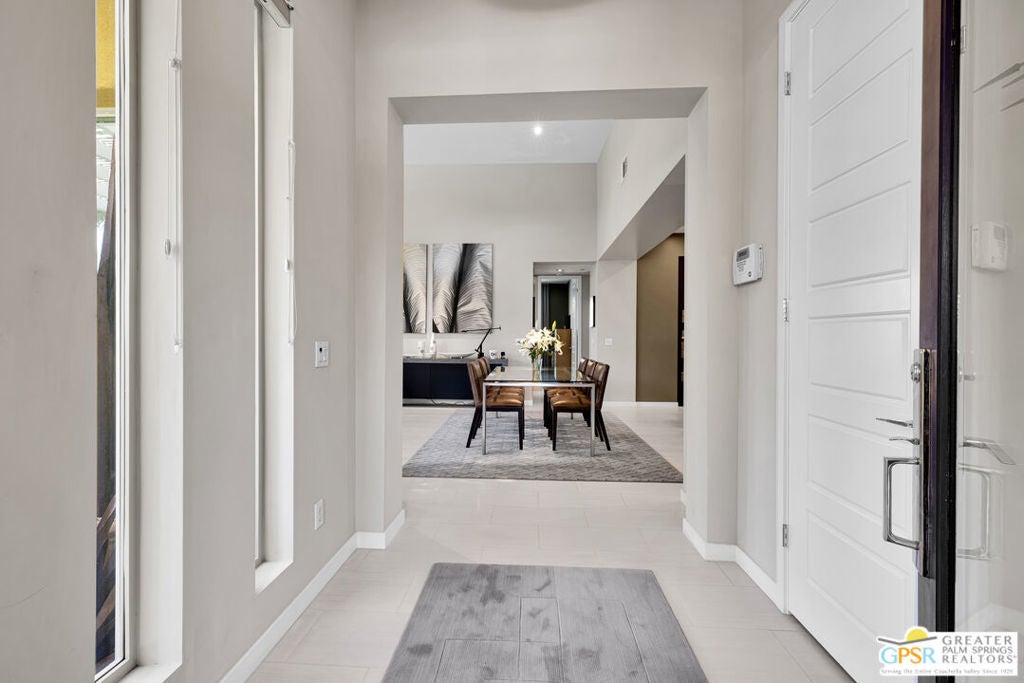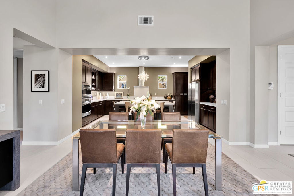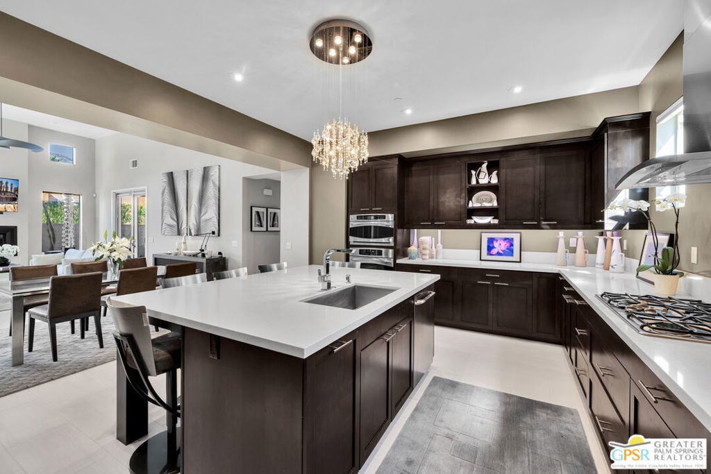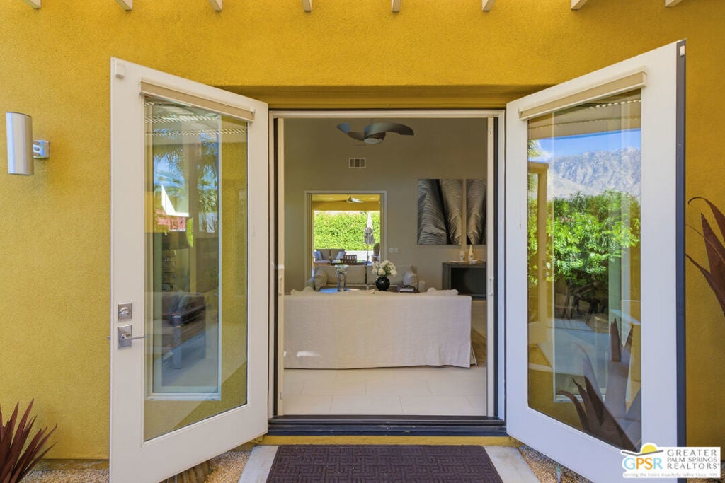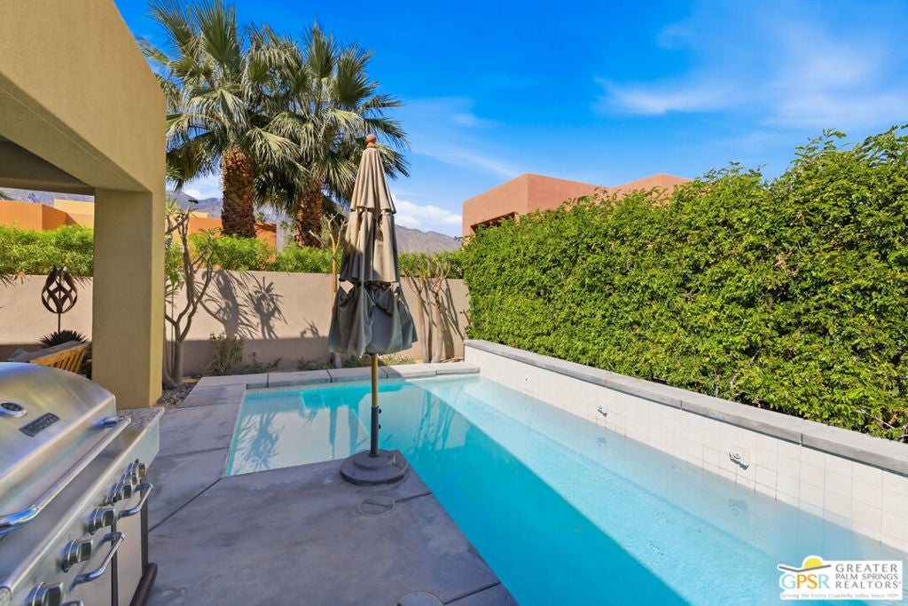 Nestled in the highly sought-after south end of Palm Springs, Luminaire Encore enjoys a premier location just off prestigious Araby Drive, framed by a dramatic mountain backdrop. This exceptionally rare Plan A residence, built in 2011, is a sophisticated single-story contemporary home situated on fee land, offering true ownership. Only six Plan A homes were constructed within this exclusive enclave. Designed for elevated desert living, the home showcases an expansive great room floor plan where the kitchen, dining, and living areas flow seamlessly together, ideal for refined entertaining and effortless everyday living. French doors open to both the front courtyard and rear patio, creating a seamless indoor-outdoor lifestyle. A private guest casita, accessed from the courtyard, provides a serene and secluded retreat for visitors. The gourmet kitchen is elegantly appointed with Silestone countertops, stainless steel appliances, a built-in convection oven and microwave, five-burner gas range, and generous cabinetry. The spacious primary suite is thoughtfully positioned near the pool and spa, offering a tranquil, resort-inspired escape. Additional highlights include three bedrooms and three bathrooms, energy-efficient appliances, owned rooftop solar panels, a tankless water heater, outdoor kitchen, and updated halogen lighting, seamlessly blending contemporary luxury with sustainable living in one of Palm Springs' most desirable communities.