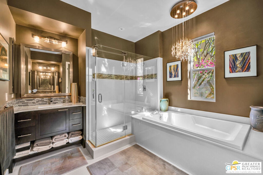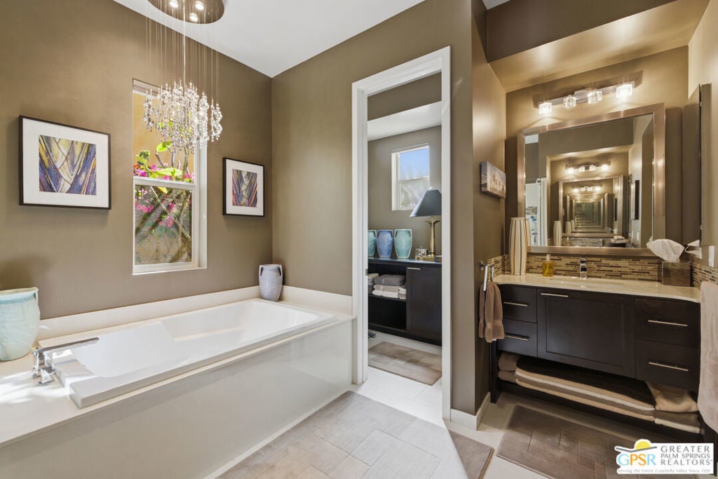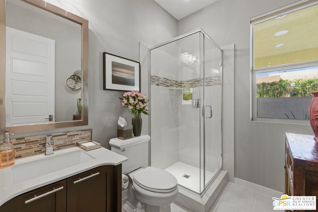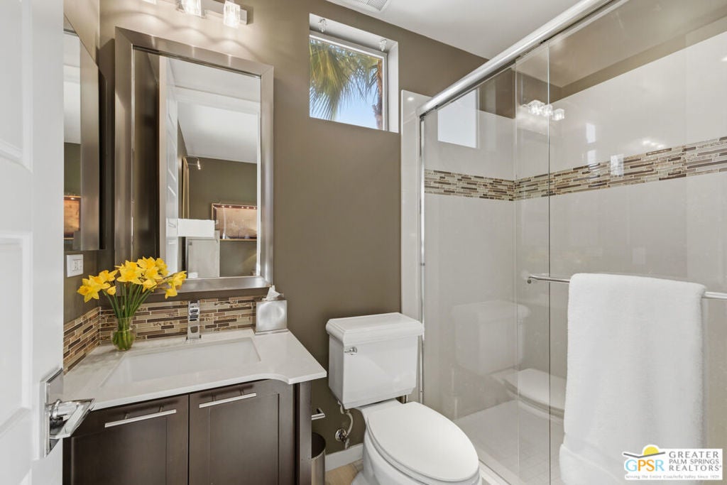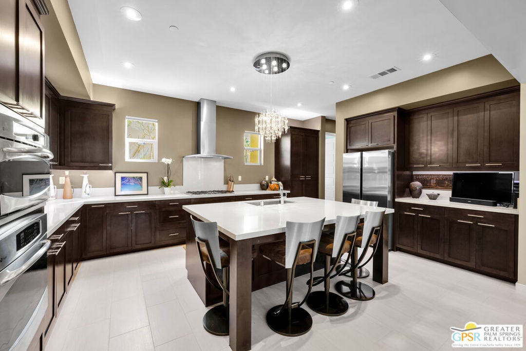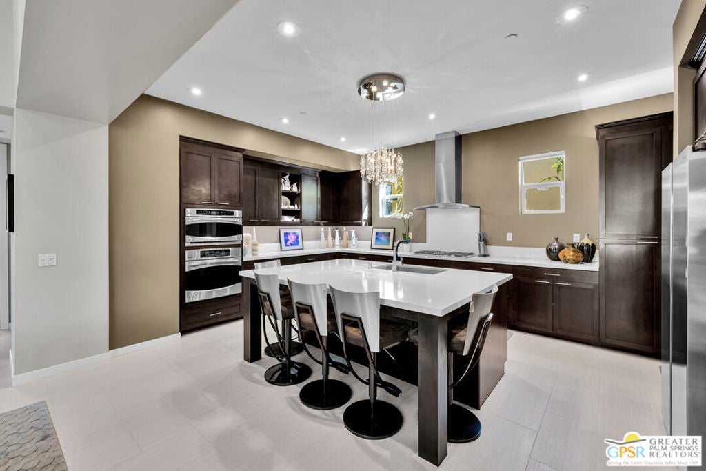 Nestled in the highly sought-after south end of Palm Springs, Luminaire Encore enjoys a premier location just off prestigious Araby Drive, framed by a dramatic mountain backdrop. This exceptionally rare Plan A residence, built in 2011, is a sophisticated single-story contemporary home situated on fee land, offering true ownership. Only six Plan A homes were constructed within this exclusive enclave. Designed for elevated desert living, the home showcases an expansive great room floor plan where the kitchen, dining, and living areas flow seamlessly together, ideal for refined entertaining and effortless everyday living. French doors open to both the front courtyard and rear patio, creating a seamless indoor-outdoor lifestyle. A private guest casita, accessed from the courtyard, provides a serene and secluded retreat for visitors. The gourmet kitchen is elegantly appointed with Silestone countertops, stainless steel appliances, a built-in convection oven and microwave, five-burner gas range, and generous cabinetry. The spacious primary suite is thoughtfully positioned near the pool and spa, offering a tranquil, resort-inspired escape. Additional highlights include three bedrooms and three bathrooms, energy-efficient appliances, owned rooftop solar panels, a tankless water heater, outdoor kitchen, and updated halogen lighting, seamlessly blending contemporary luxury with sustainable living in one of Palm Springs' most desirable communities.