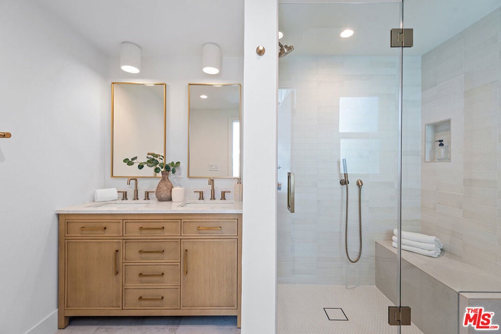 Just completed!! Extensively renovated 3-bedroom, 2.5-bathroom townhome situated on a quiet cul-de-sac, offering direct street access, a large patio, and an attached, 2-car garage. This modernized unit that's flooded with natural light includes designer details throughout such as wide plank oak floors, recessed LED lighting with dimmer switches, custom built-ins, rift white oak cabinets, quartz counter-tops, and more. Offering a spacious living room and an entertainer's kitchen with quartz countertops, KitchenAid stainless steel appliances, custom cabinetry, and adjacent to a separate dining area. Upstairs, the primary suite boasts a private balcony, and a beautifully updated en-suite spa-like bathroom. Additionally, upstairs offers two well-sized bedrooms and a shared bathroom. This unit also includes a separate in-unit laundry room, powder room, mostly newer windows, central air and heat with Nest thermostat, and a 2-car finished garage with an epoxy coated floor and plenty of extra storage in the bonus area. Villa San Remo is an immaculate and well maintained complex that offers a pool and beautifully landscaped courtyard. This property is located in the quieter section of the community and does not back up to the 90 freeway.***Extensive permits were pulled and approved by LADBS for this renovation, in addition to the HOA approval***Buyer is advised to independently verify accuracy of all information through professional inspection with appropriate professional***Broker/Agent does not guarantee accuracy of square footage, lot size, zoning, rent control, permits, use code, schools and/or other information concerning the conditions or features of the property provided by the seller or obtained from public records or other sources.***