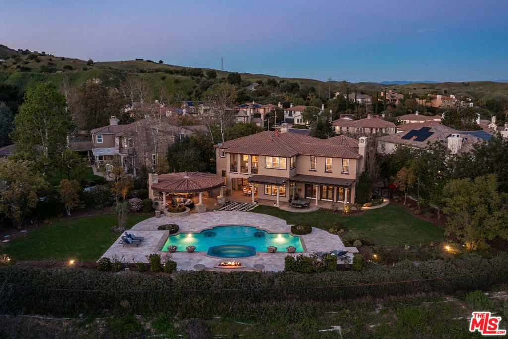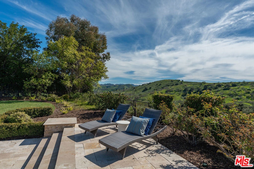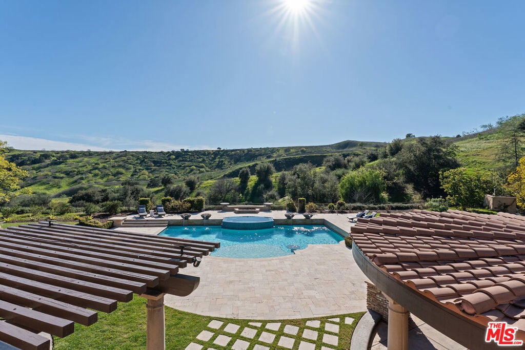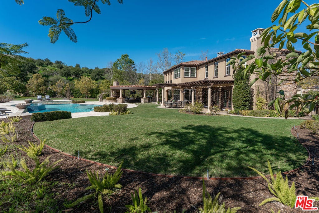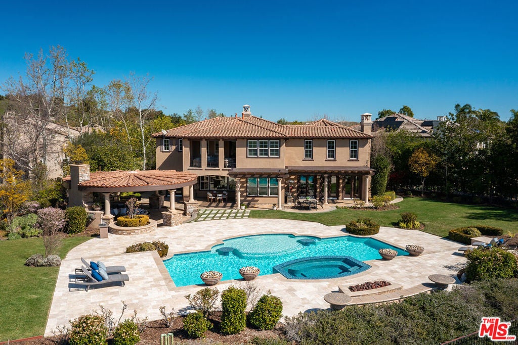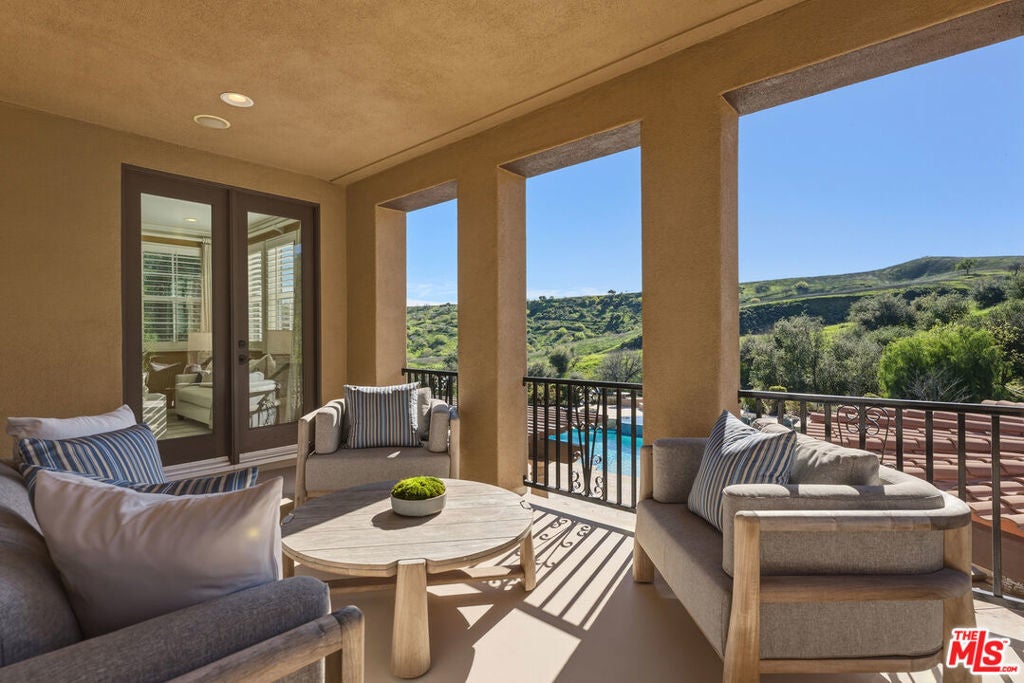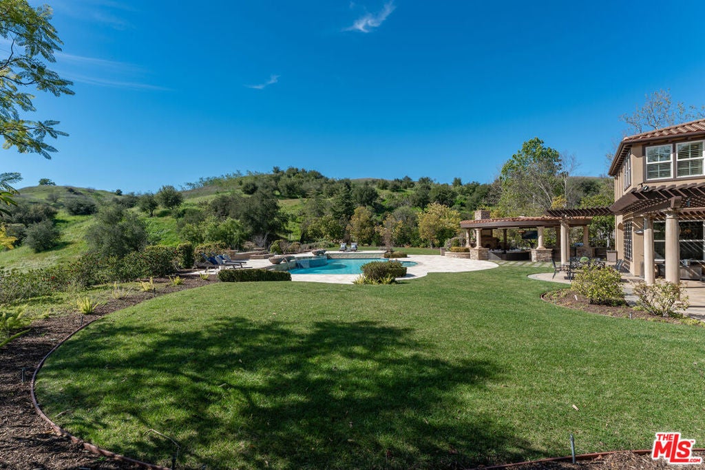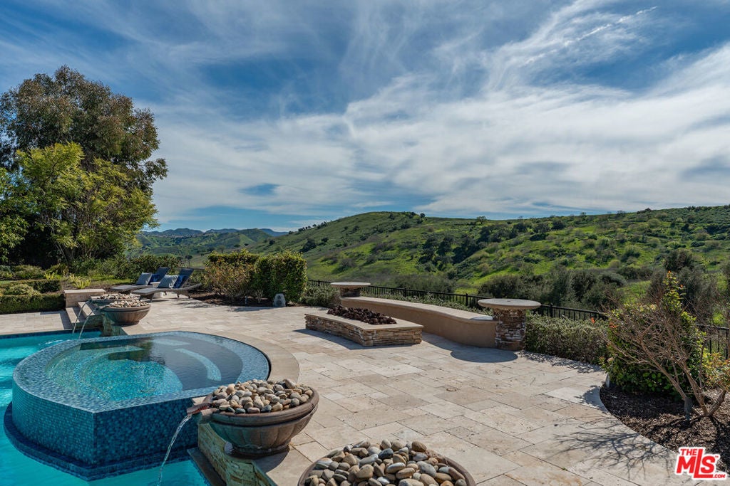 Located at the end of a quiet cul-de-sac within the prestigious guard-gated community of Mont Calabasas, this exceptional estate captures sweeping panoramic rolling hill views from nearly every vantage point. Set on an expansive 20,980 sq ft lot, the 4,994 sq ft residence blends refined design, thoughtful upgrades, and seamless indoor-outdoor living. A welcoming courtyard entry leads into a dramatic foyer highlighted by a grand spiral staircase, custom stone flooring and architectural archways that lead into the formal dining room. The generous dining room features a fireplace and three sets of French doors showcasing the incredible view and perfect for entertaining large groups. A cozy paneled den with outdoor access offers a respite to enjoy a glass of wine or catch up on work. The heart of the home is the open-concept eat-in kitchen and family room, designed to frame the breathtaking views. The chef's kitchen features a large center island, Viking appliances, Sub-Zero glass door refrigerator/freezer, double ovens, and two dishwashers. The adjacent double sized family room, enhanced with beamed ceilings, fireplace and built-ins, opens directly to the backyard, creating effortless flow for gatherings large and small. A large en-suite guest room that opens to the front patio as well as a powder room complete the first floor. Upstairs, the primary suite offers a private sanctuary with fireplace, large seating area and view balcony. The spa-like primary bath features separate vanities, separate tub and shower, spacious walk-in closet and access to the large balcony overlooking the pool. Three additional en-suite bedrooms and a versatile bonus room provide flexibility for a media room, game room, or additional lounge space. The generous laundry room is also on the second floor. The outdoor setting is a true retreat. Completed in 2015, the resort-style backyard includes a sparkling pool and spa with Jandy control system, an oversized infinity-edge hot tub, gas fire pit, and a stunning 30-foot round covered sitting area with fireplace, tongue-and-groove ceiling, and overhead electric heaters. The fully equipped BBQ area with outdoor sink and remote hot water heater makes year-round entertaining both comfortable and convenient - all set against unobstructed, panoramic views. Extensive upgrades enhance comfort and efficiency, including a 5-zone indoor/outdoor surround sound system, smart WiFi-enabled controls for pool, irrigation, lighting, and water systems, overhead garage storage with built-in cabinets and workbench, epoxy garage floors, modular emergency generator with transfer switch and Ring alarm system. Located within the award-winning Las Virgenes Unified School District and just minutes from hiking trails, parks, and the shopping and dining of The Commons at Calabasas, with convenient access to Malibu and the beaches, this Mont Calabasas residence offers privacy, sophistication, and extraordinary views in one of the area's most sought-after communities.