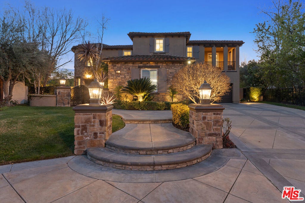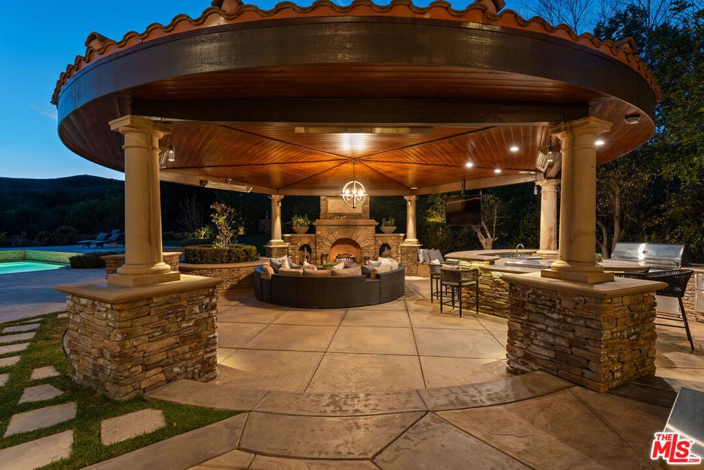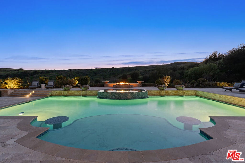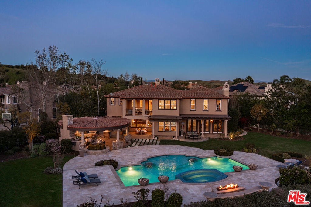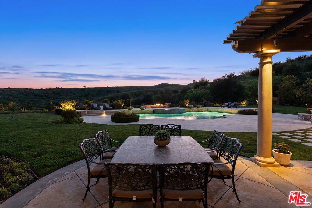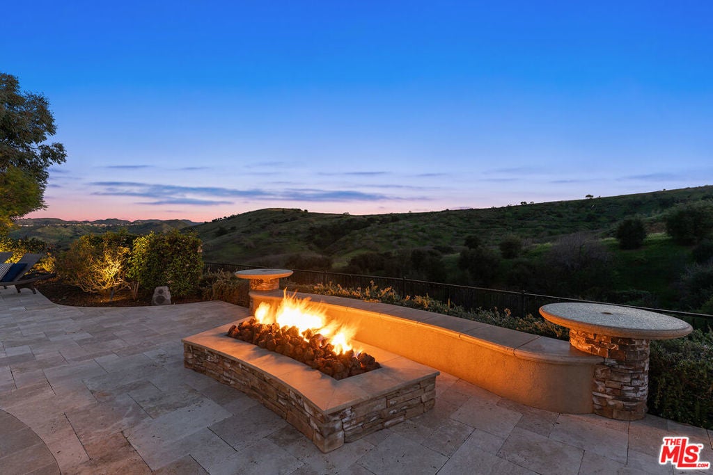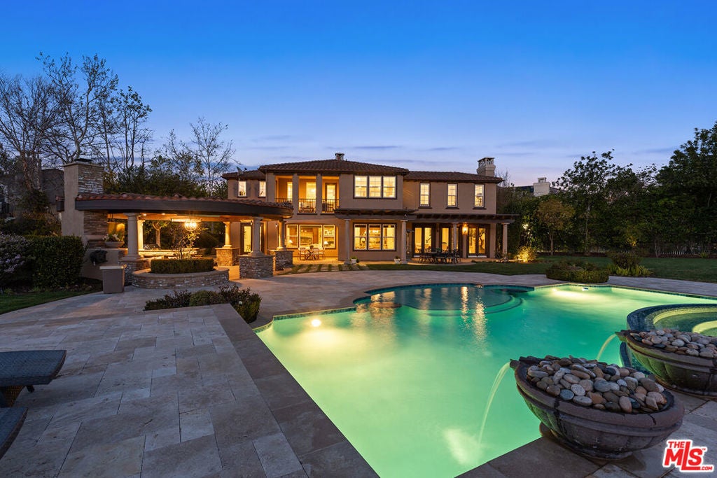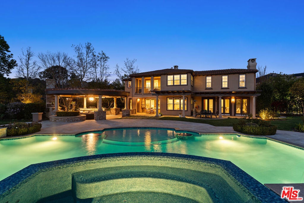 Located at the end of a quiet cul-de-sac within the prestigious guard-gated community of Mont Calabasas, this exceptional estate captures sweeping panoramic rolling hill views from nearly every vantage point. Set on an expansive 20,980 sq ft lot, the 4,994 sq ft residence blends refined design, thoughtful upgrades, and seamless indoor-outdoor living. A welcoming courtyard entry leads into a dramatic foyer highlighted by a grand spiral staircase, custom stone flooring and architectural archways that lead into the formal dining room. The generous dining room features a fireplace and three sets of French doors showcasing the incredible view and perfect for entertaining large groups. A cozy paneled den with outdoor access offers a respite to enjoy a glass of wine or catch up on work. The heart of the home is the open-concept eat-in kitchen and family room, designed to frame the breathtaking views. The chef's kitchen features a large center island, Viking appliances, Sub-Zero glass door refrigerator/freezer, double ovens, and two dishwashers. The adjacent double sized family room, enhanced with beamed ceilings, fireplace and built-ins, opens directly to the backyard, creating effortless flow for gatherings large and small. A large en-suite guest room that opens to the front patio as well as a powder room complete the first floor. Upstairs, the primary suite offers a private sanctuary with fireplace, large seating area and view balcony. The spa-like primary bath features separate vanities, separate tub and shower, spacious walk-in closet and access to the large balcony overlooking the pool. Three additional en-suite bedrooms and a versatile bonus room provide flexibility for a media room, game room, or additional lounge space. The generous laundry room is also on the second floor. The outdoor setting is a true retreat. Completed in 2015, the resort-style backyard includes a sparkling pool and spa with Jandy control system, an oversized infinity-edge hot tub, gas fire pit, and a stunning 30-foot round covered sitting area with fireplace, tongue-and-groove ceiling, and overhead electric heaters. The fully equipped BBQ area with outdoor sink and remote hot water heater makes year-round entertaining both comfortable and convenient - all set against unobstructed, panoramic views. Extensive upgrades enhance comfort and efficiency, including a 5-zone indoor/outdoor surround sound system, smart WiFi-enabled controls for pool, irrigation, lighting, and water systems, overhead garage storage with built-in cabinets and workbench, epoxy garage floors, modular emergency generator with transfer switch and Ring alarm system. Located within the award-winning Las Virgenes Unified School District and just minutes from hiking trails, parks, and the shopping and dining of The Commons at Calabasas, with convenient access to Malibu and the beaches, this Mont Calabasas residence offers privacy, sophistication, and extraordinary views in one of the area's most sought-after communities.