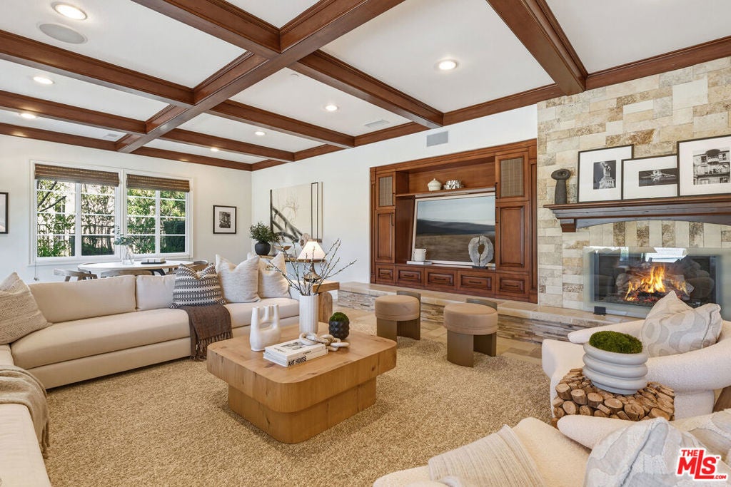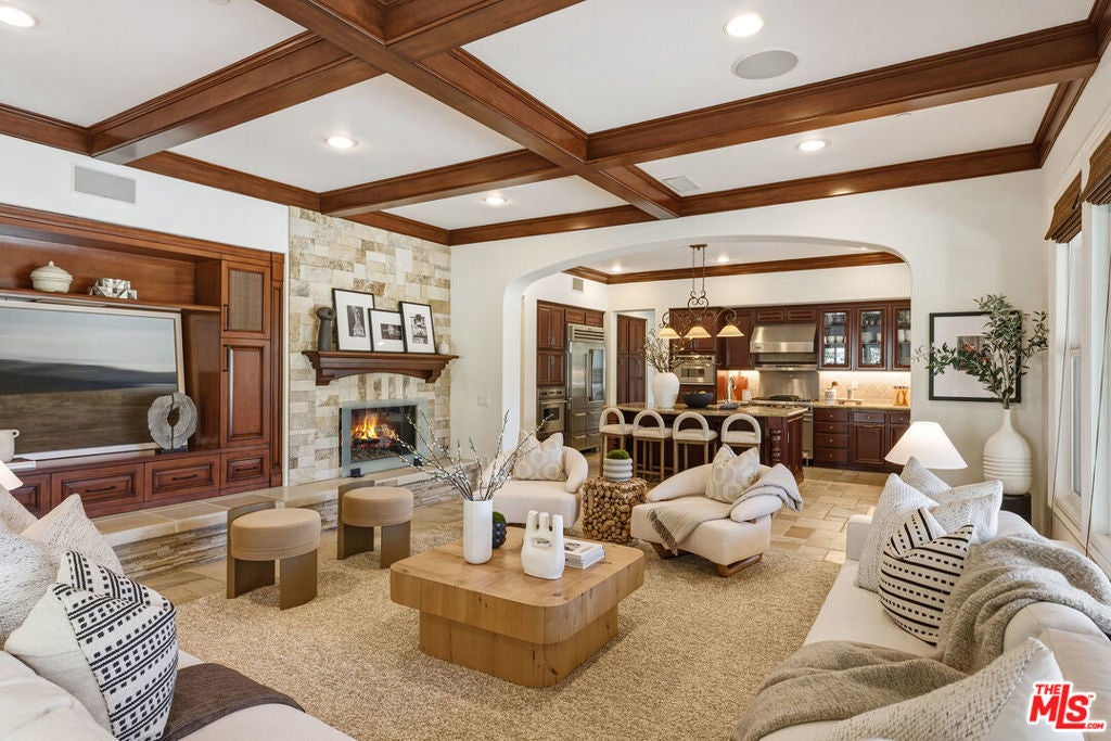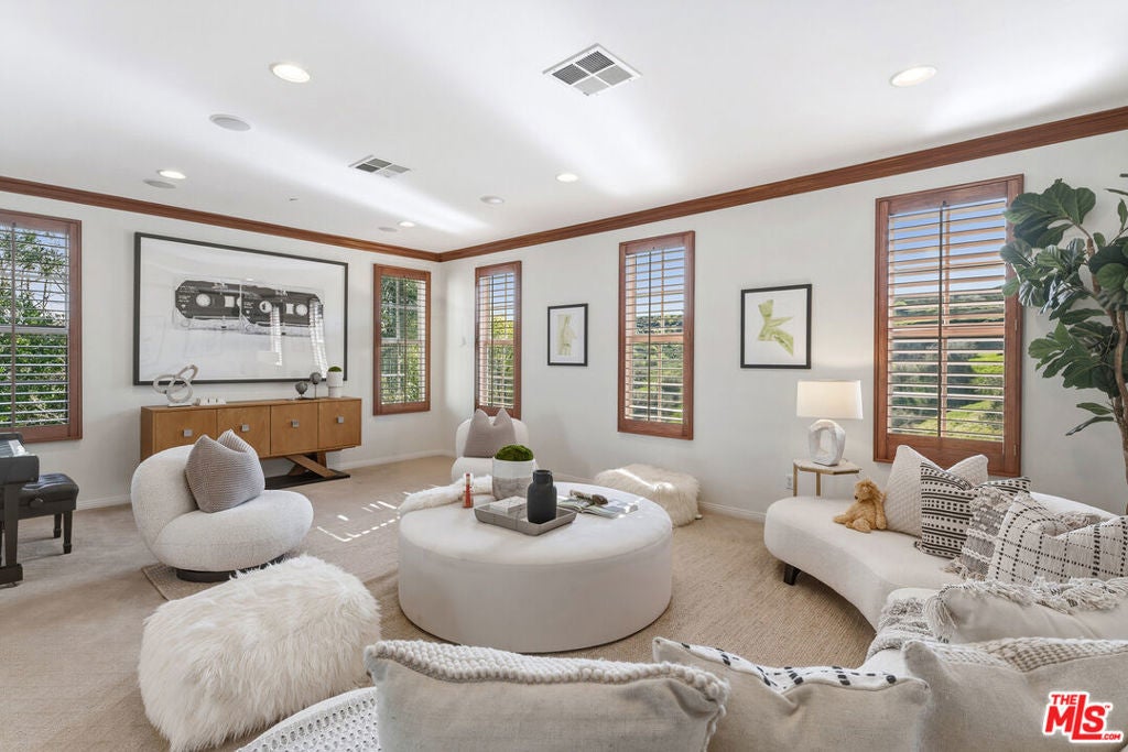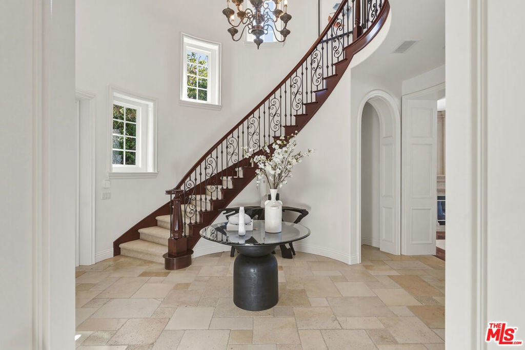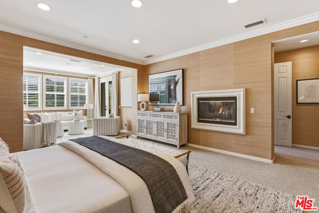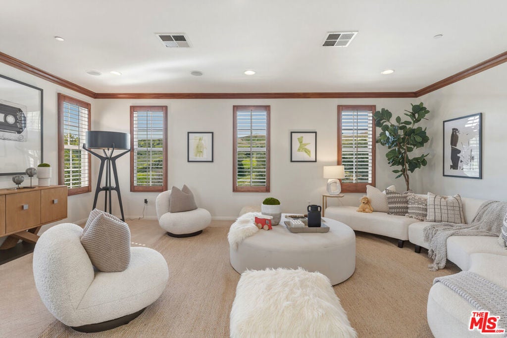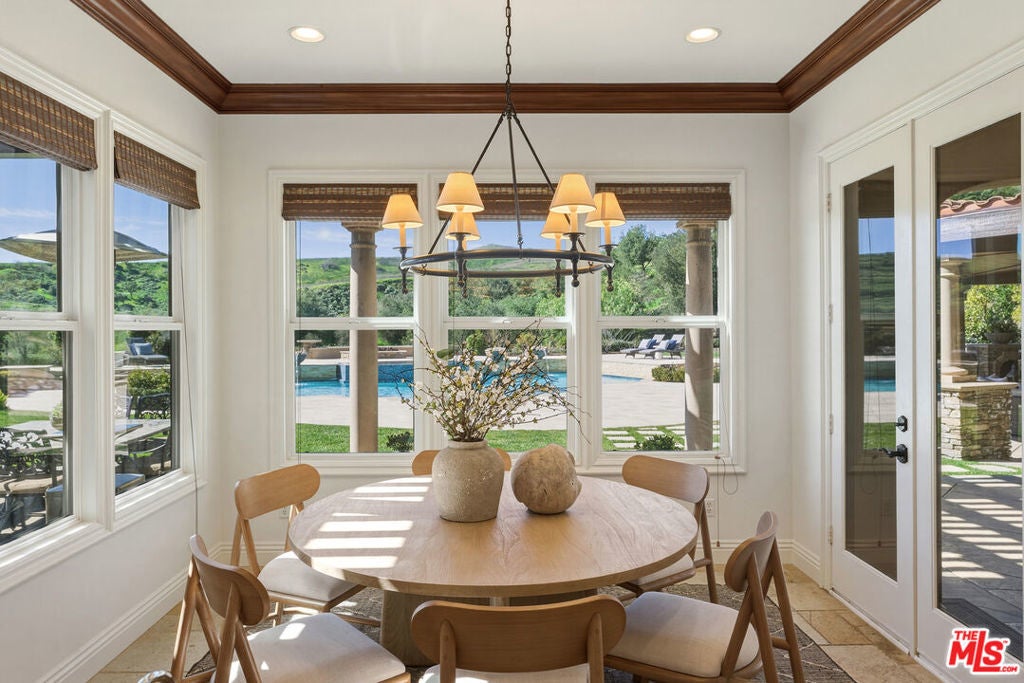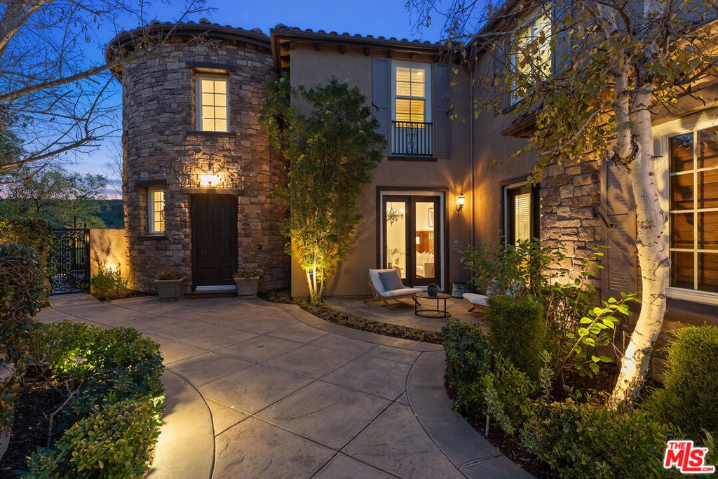 Located at the end of a quiet cul-de-sac within the prestigious guard-gated community of Mont Calabasas, this exceptional estate captures sweeping panoramic rolling hill views from nearly every vantage point. Set on an expansive 20,980 sq ft lot, the 4,994 sq ft residence blends refined design, thoughtful upgrades, and seamless indoor-outdoor living. A welcoming courtyard entry leads into a dramatic foyer highlighted by a grand spiral staircase, custom stone flooring and architectural archways that lead into the formal dining room. The generous dining room features a fireplace and three sets of French doors showcasing the incredible view and perfect for entertaining large groups. A cozy paneled den with outdoor access offers a respite to enjoy a glass of wine or catch up on work. The heart of the home is the open-concept eat-in kitchen and family room, designed to frame the breathtaking views. The chef's kitchen features a large center island, Viking appliances, Sub-Zero glass door refrigerator/freezer, double ovens, and two dishwashers. The adjacent double sized family room, enhanced with beamed ceilings, fireplace and built-ins, opens directly to the backyard, creating effortless flow for gatherings large and small. A large en-suite guest room that opens to the front patio as well as a powder room complete the first floor. Upstairs, the primary suite offers a private sanctuary with fireplace, large seating area and view balcony. The spa-like primary bath features separate vanities, separate tub and shower, spacious walk-in closet and access to the large balcony overlooking the pool. Three additional en-suite bedrooms and a versatile bonus room provide flexibility for a media room, game room, or additional lounge space. The generous laundry room is also on the second floor. The outdoor setting is a true retreat. Completed in 2015, the resort-style backyard includes a sparkling pool and spa with Jandy control system, an oversized infinity-edge hot tub, gas fire pit, and a stunning 30-foot round covered sitting area with fireplace, tongue-and-groove ceiling, and overhead electric heaters. The fully equipped BBQ area with outdoor sink and remote hot water heater makes year-round entertaining both comfortable and convenient - all set against unobstructed, panoramic views. Extensive upgrades enhance comfort and efficiency, including a 5-zone indoor/outdoor surround sound system, smart WiFi-enabled controls for pool, irrigation, lighting, and water systems, overhead garage storage with built-in cabinets and workbench, epoxy garage floors, modular emergency generator with transfer switch and Ring alarm system. Located within the award-winning Las Virgenes Unified School District and just minutes from hiking trails, parks, and the shopping and dining of The Commons at Calabasas, with convenient access to Malibu and the beaches, this Mont Calabasas residence offers privacy, sophistication, and extraordinary views in one of the area's most sought-after communities.