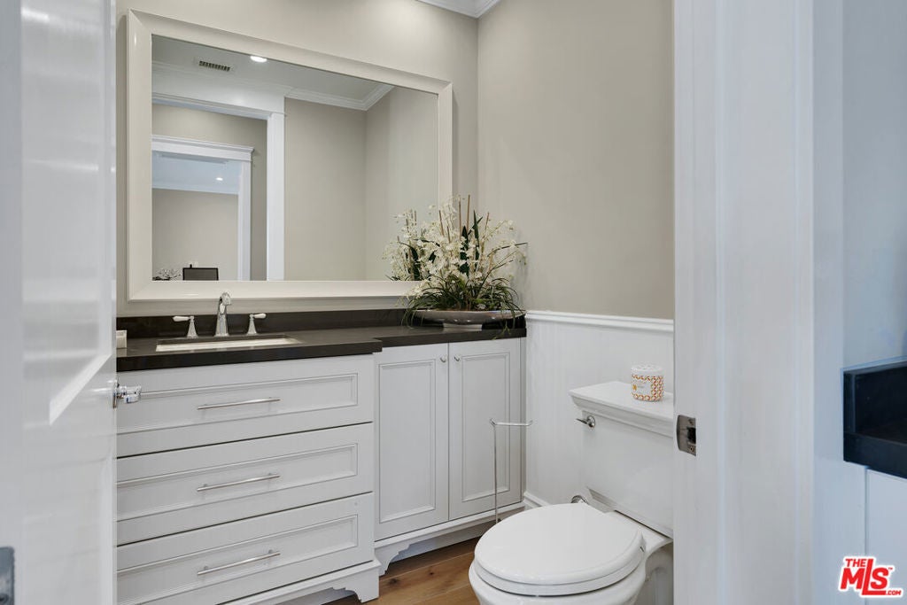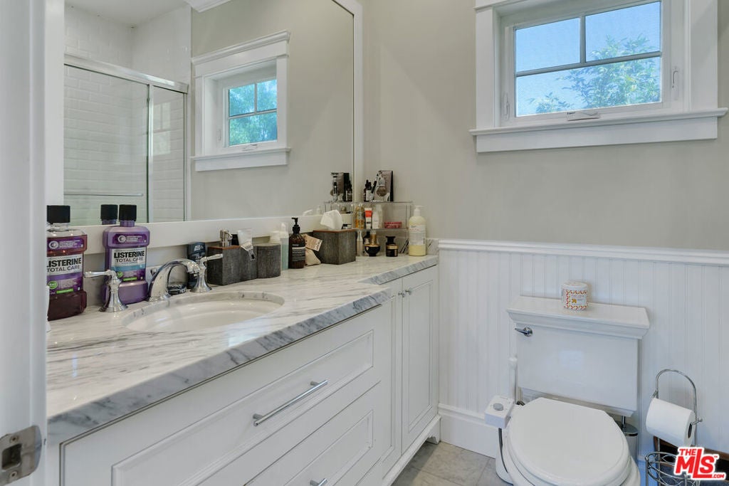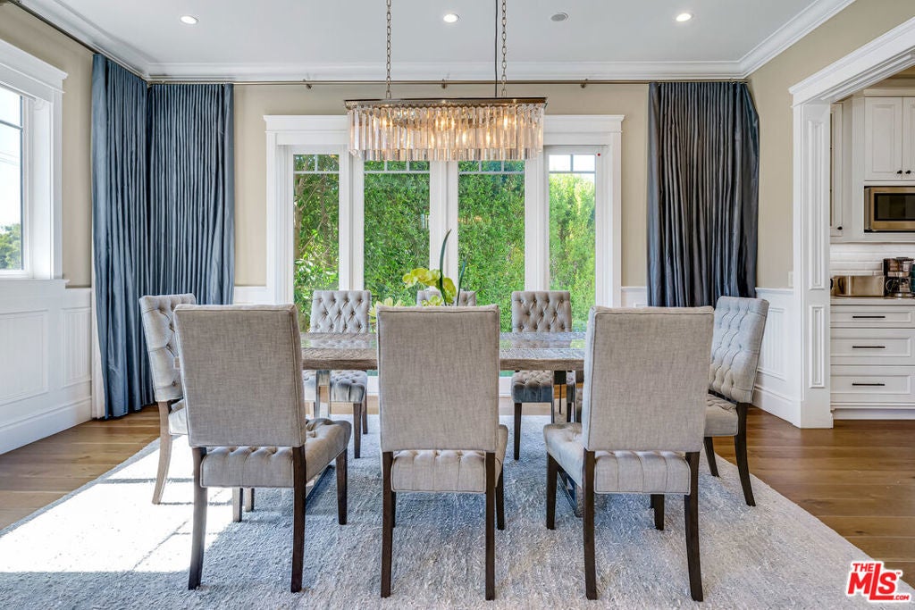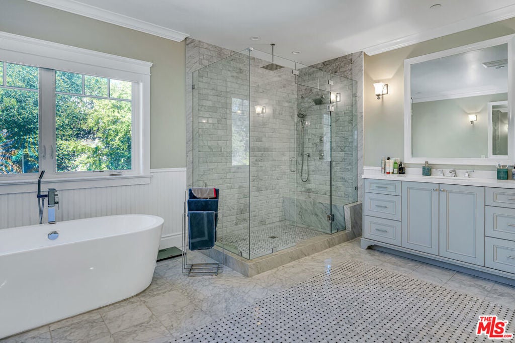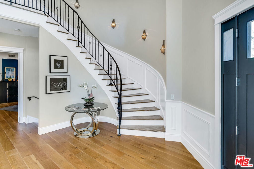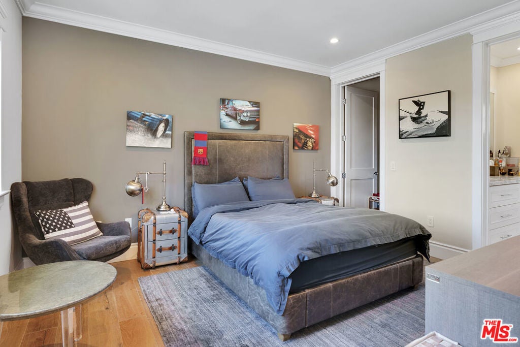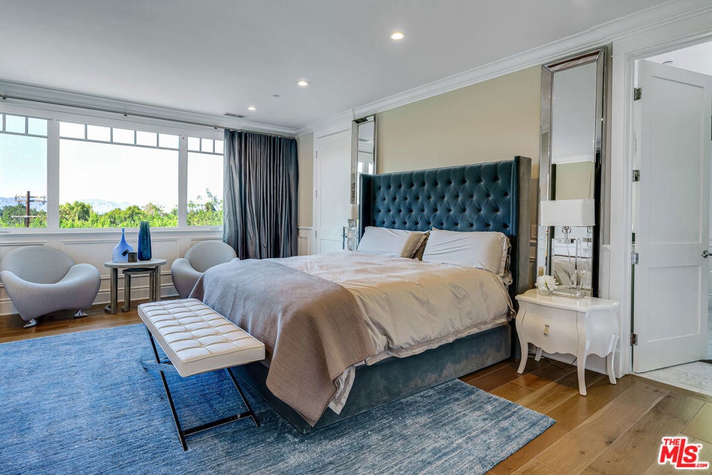 Elegant East Coast inspired gated residence in Tarzana, built in 2014, situated on an expansive 18,000+ sq ft lot. This designer-perfect home showcases quality craftsmanship throughout, featuring brushed white oak flooring, recessed lighting, Restoration Hardware wall sconces, and custom details. Offering 5 bedrooms (one currently used as an executive office/library) and 4.5 baths, the residence blends comfort with sophistication.The open chef's kitchen is designed for both daily living and entertaining, with quartz countertops, a large granite-topped island, top-of-the-line stainless steel appliances including a 6-burner range with pasta faucet, and a butler's pantry. Adjacent to the kitchen is an oversized formal dining room and a spacious living room highlighted by a dramatic two-story ceiling. The main level also includes a guest bedroom suite. Upstairs, a versatile sitting area offers hillside views, along with a convenient laundry room with sink. Two additional en-suite bedrooms complement the elegant primary suite, which boasts dual walk-in closets and a spa-inspired bath with a freestanding Midocean soaking tub, walk-in shower, dual vanities, and makeup counter. The large family room seamlessly connects to a resort-style backyard with a remote-controlled saltwater pool and spa, built-in BBQ island, fire pit, and expansive patio ideal for outdoor entertaining. Property is fully furnished, mostly with RH furniture. Additional highlights include a 3 car garage, custom window coverings, dual-zoned HVAC, energy-efficient double-panned windows, LED lighting, and a security system with cameras. Conveniently located near The Village, Ventura Boulevard dining and shopping, Warner Center, local parks, and freeway access.