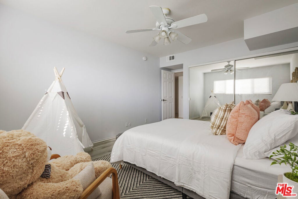 TOP FLOOR! You only share one wall in this beautiful corner penthouse unit, with VIEWS OF THE HOLLYWOOD HILLS! PRIME Valley Village! This spacious 3-bed, 2-bath residence offers over 1,600 sq ft of open-concept living with abundant natural light, high living room ceilings, and great flow throughout. The mirrored living area opens to a private balcony. It flows seamlessly into kitchen and additional dining space, creating the perfect environment for entertaining or relaxing at home. The primary suite features two large closets and en-suite bath with double vanity and a tub. Two additional bedrooms provide flexibility for guests or a home office. Situated in a quiet, secure building with controlled access, covered side by side gated parking spots, and a well equipped gym, this condo combines comfort and convenience in one of the most desirable pockets of the Valley. Just minutes from Studio City, the new Sportsmen's Lodge shops, dining, and the 101/170 freeways this is Valley Village living at its best. Come make it your own!