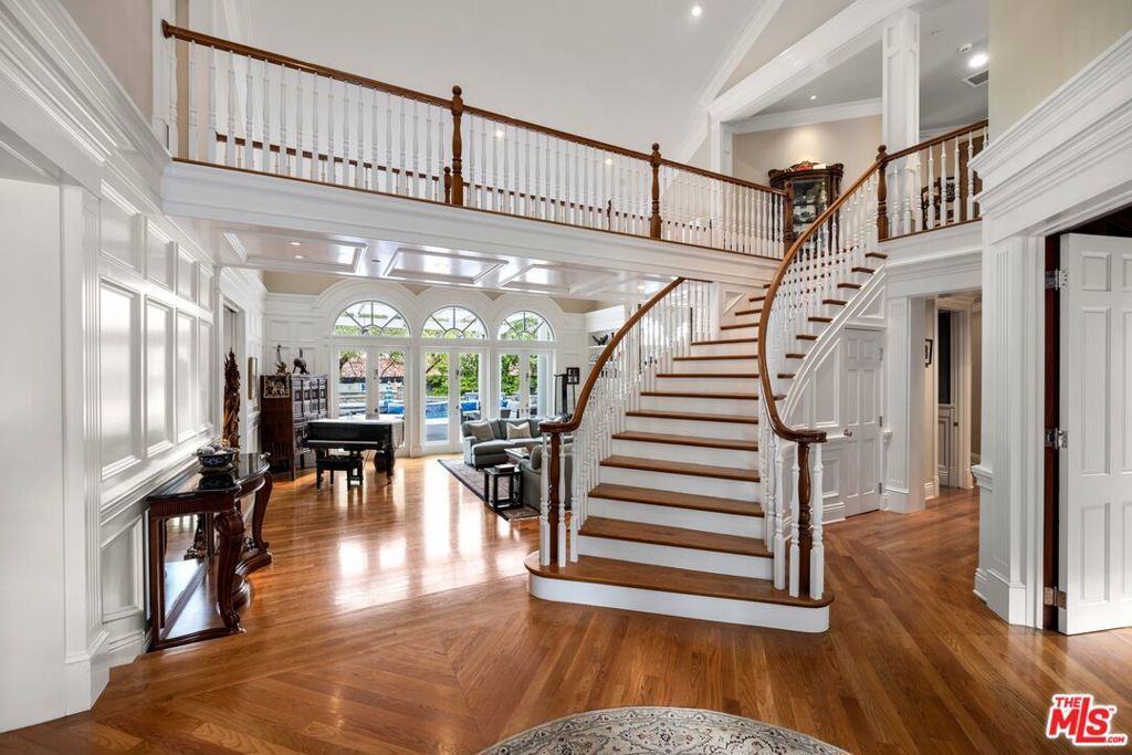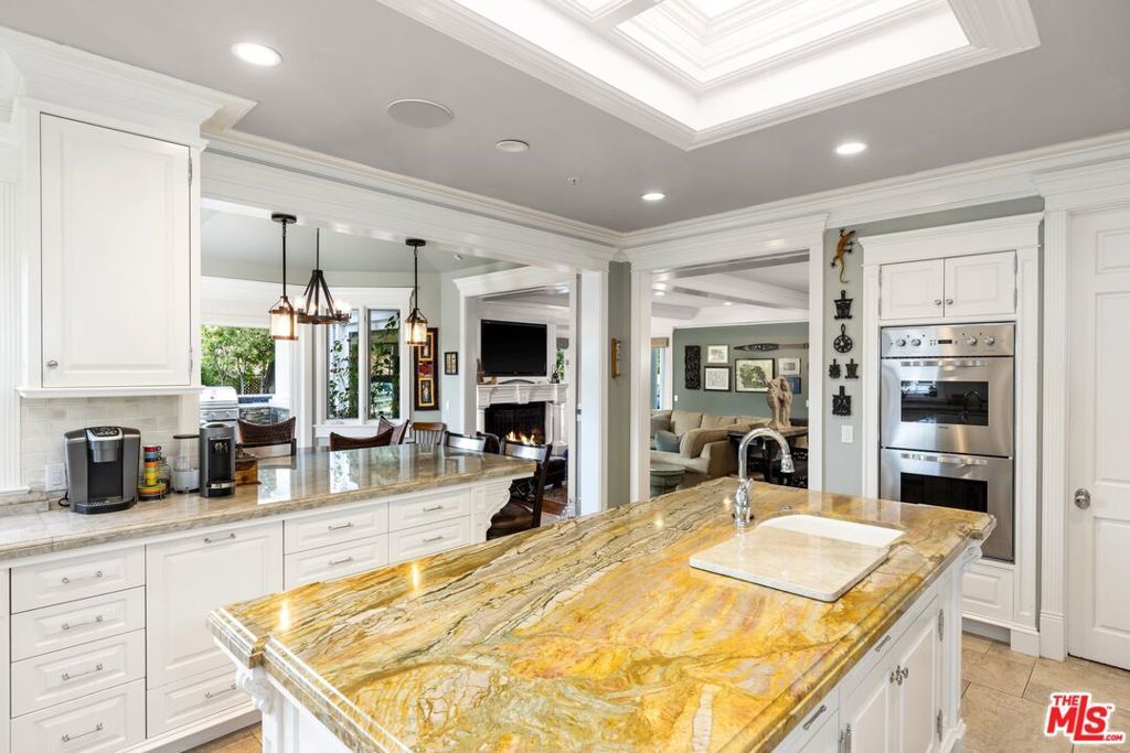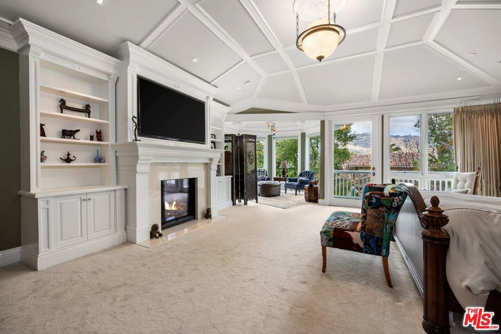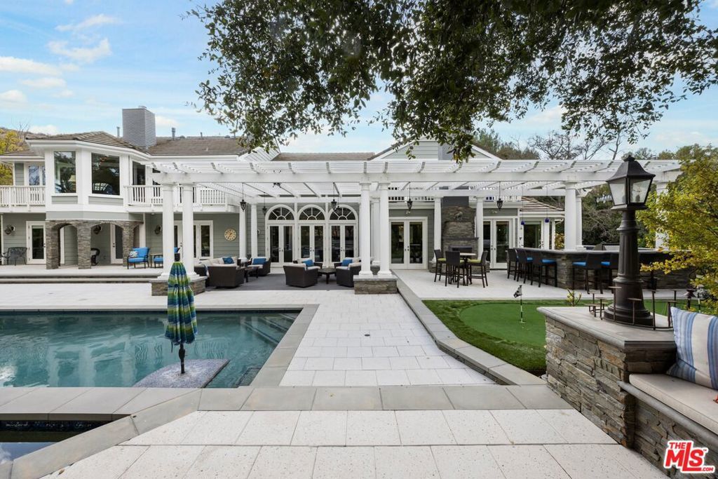 Located within the highly desirable North Ranch Estates of Westlake Village, this exceptional estate offers over 7,000 square feet of refined living space set on more than half an acre of beautifully landscaped grounds. Thoughtfully designed with both elegance and functionality in mind, the home features 5 en-suite bedrooms, 6 bathrooms, and an impressive collection of amenities ideal for both everyday living and grand-scale entertaining. Inside, the residence showcases an elegant media room, a dedicated home office, and a private gym complete with a dry sauna. The chef's kitchen is a true centerpiece, featuring custom inset cabinetry with pull-out drawers, Sub-Zero, Wolf, and Viking appliances, and a temperature-controlled wine cellar capable of housing approximately 1,000 bottles. The upper level hosts four en-suite bedrooms, each with private balcony access. The primary suite serves as a luxurious retreat, offering a private seating area, vaulted ceilings, dual custom closets, and a spa-inspired bathroom with a full-body shower and wet sauna. The exterior is equally captivating. A grand horseshoe driveway welcomes you home and leads to a three-car garage equipped with dual 220V plugs for electric vehicles. The resort-style backyard is an entertainer's dream, featuring multiple seating areas, a fire pit, outdoor fireplace, putting green, and a fully equipped outdoor kitchen with an oversized BBQ, Green Egg smoker, and seating for eight. Blending timeless sophistication with modern luxury, this remarkable residence offers an unparalleled lifestyle in one of Westlake Village's most prestigious communities.