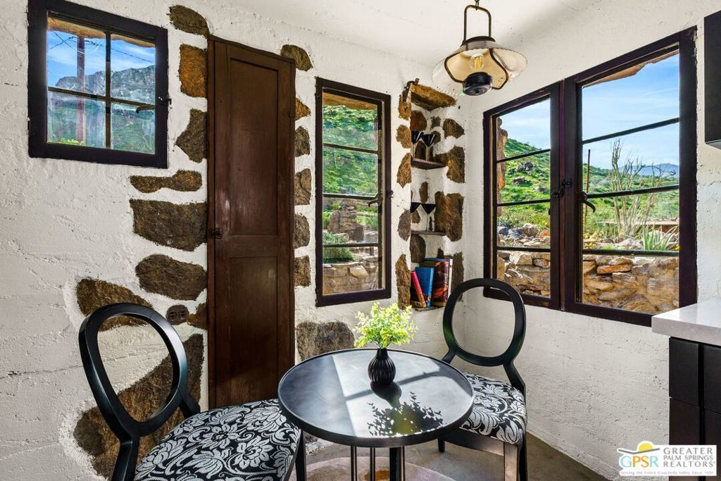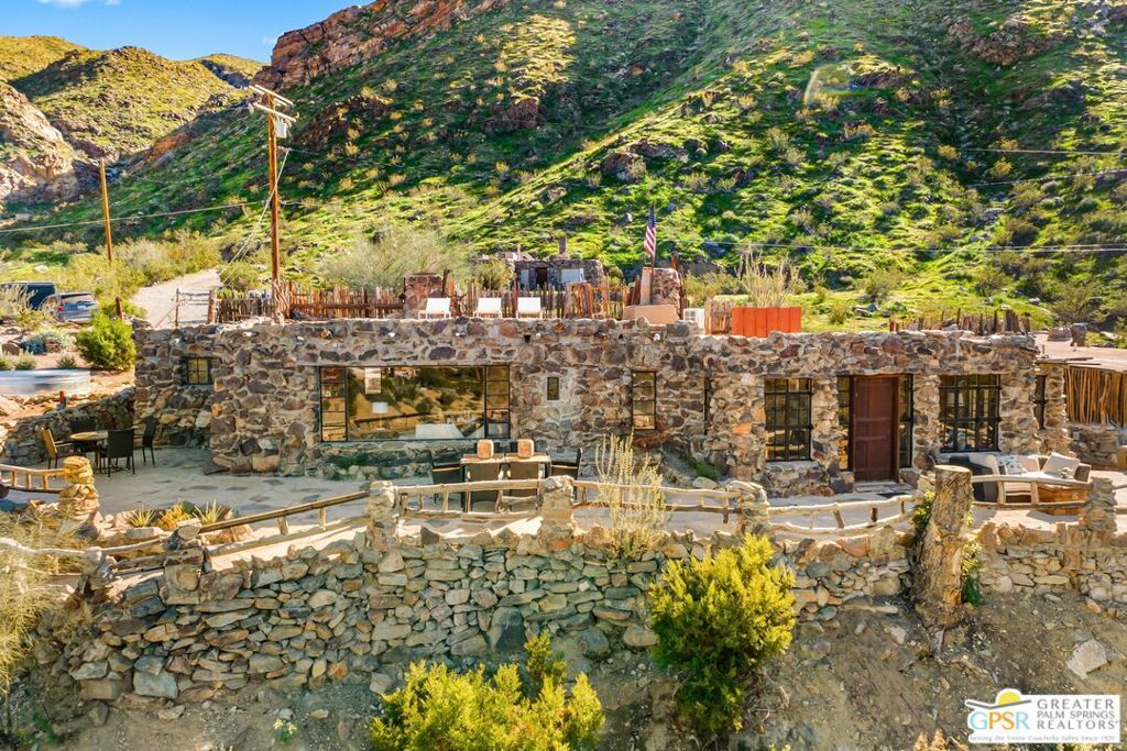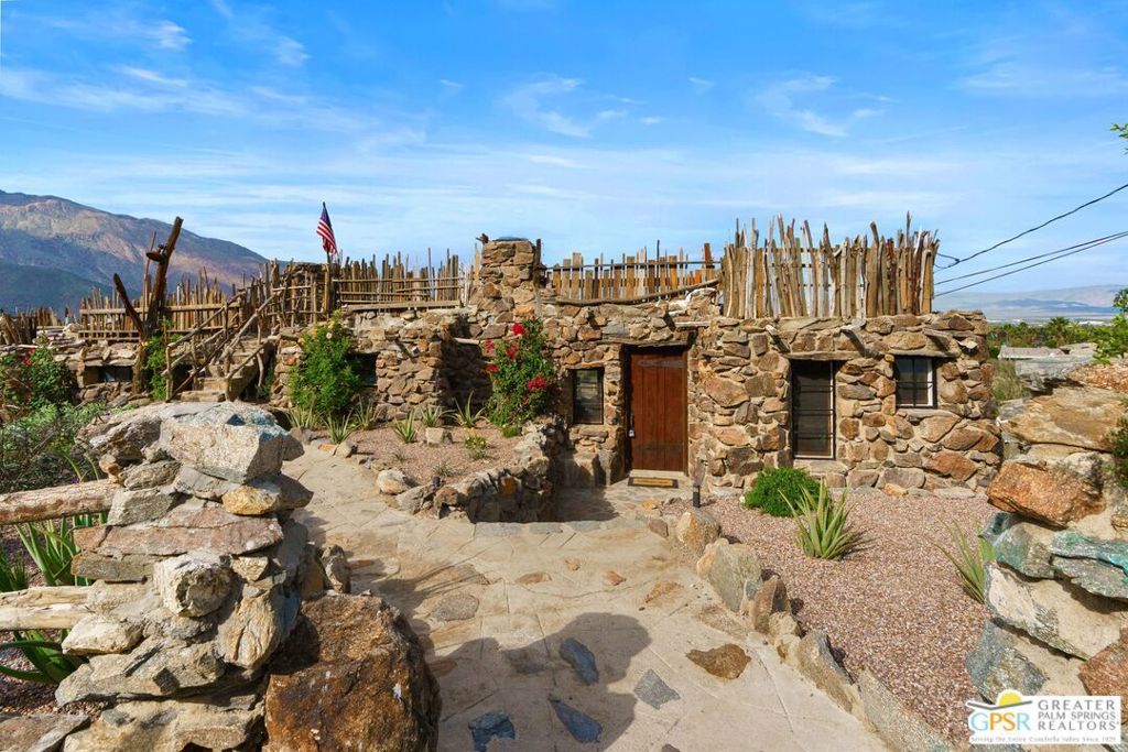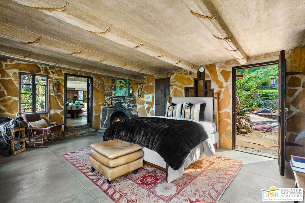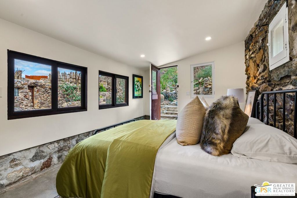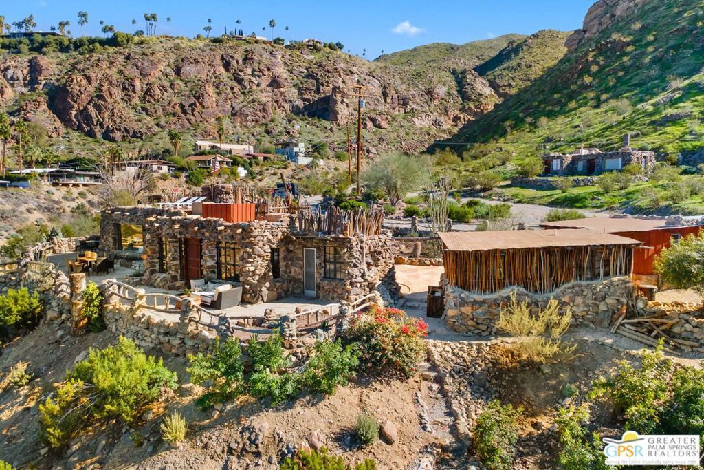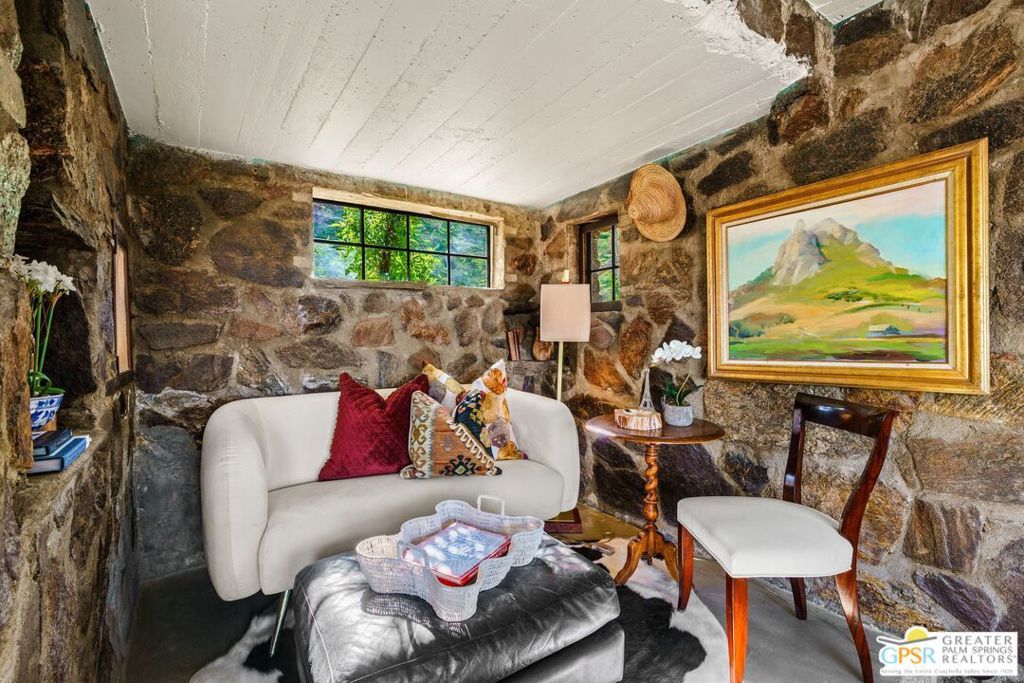 Perched high above Araby Cove, 2550 South Araby Road is a rare and storied treasure and one of Palm Springs iconic Rock Houses, originally built in 1929 by R. Lee Miller. This historic residence is a singular blend of architecture, history, and landscape, offering sweeping panoramic views across the desert floor and exceptional privacy. Access is provided via a private road with restricted entry. Designated a Class One Historic Landmark by the City of Palm Springs, the home showcases handcrafted artistry throughout. Stone walls rise organically from the mountainside, while original details remain beautifully intact, including hand carved doors and windows, custom shelving, exposed ceiling beams, ironwork door latches, handmade fireplace tools, and two original fireplaces, one of which includes a preserved stove pipe. A hidden room concealed behind a bookcase adds intrigue, and a deeply personal historical detail remains etched into the stone, as the original owner, Perle Martin Wheeler, carved her name into a nook in 1931. Respectfully honoring the home's architectural legacy, the current owners acquired the property in late 2024 and completed a thoughtful transformation, bringing the residence into the modern era while preserving its soul. Extensive upgrades include updated plumbing, electrical, and HVAC systems, new appliances, an EV charger, and infrastructure improvements throughout the property. The roof was fully replaced in August 2022, providing long term durability. The main residence features one bedroom and two bathrooms, complemented by two detached studio casitas, each with its own en suite bathroom. These spaces offer exceptional flexibility and are ideal for guests, multigenerational living, creative use, or private retreats. Meandering pathways, updated irrigation, and curated desert landscaping create a serene environment where native wildlife and natural beauty take center stage. A morning walk along the northern path reveals the desert awakening from the rock garden below. The extensive desert landscaping was thoughtfully designed by renowned Palm Springs landscape consultant Paul Ortega, an expert in desert horticulture and water management, and President Emeritus and Co Founder of the Desert Horticultural Society of the Coachella Valley. This historic property allows short term rentals, a rare benefit for a Class One designation. In addition, Class One homes in Palm Springs may qualify for Mills Act contracts, which can offer potential property tax benefits. Buyer to verify. More than a home, 2550 South Araby Road is a living work of art where architectural significance, timeless craftsmanship, and some of the most breathtaking views in Palm Springs converge into a truly irreplaceable desert retreat.