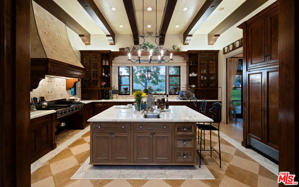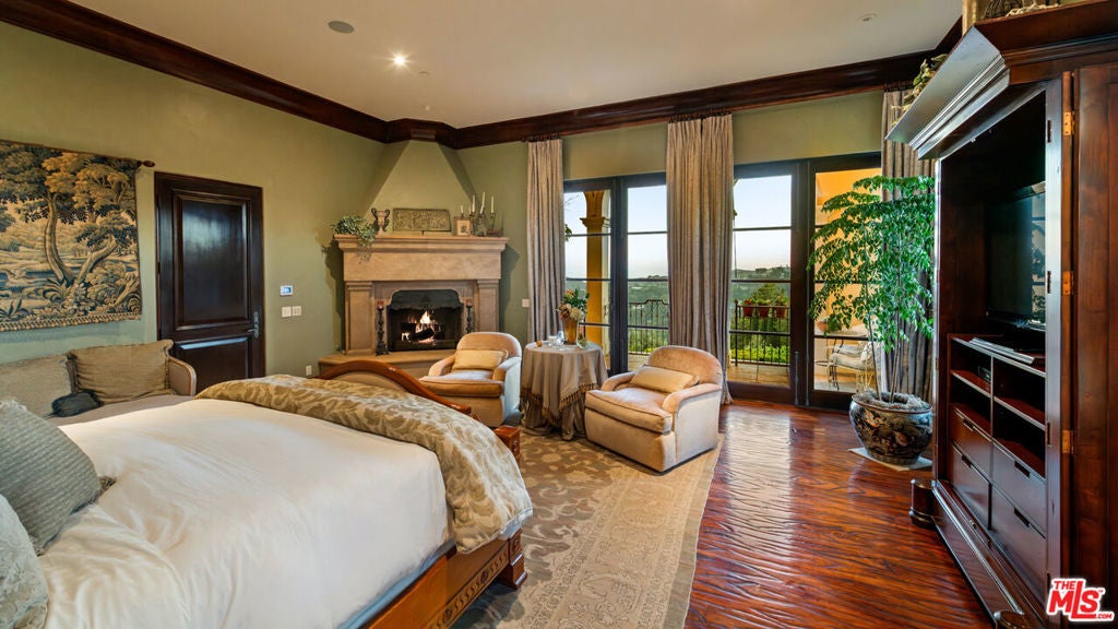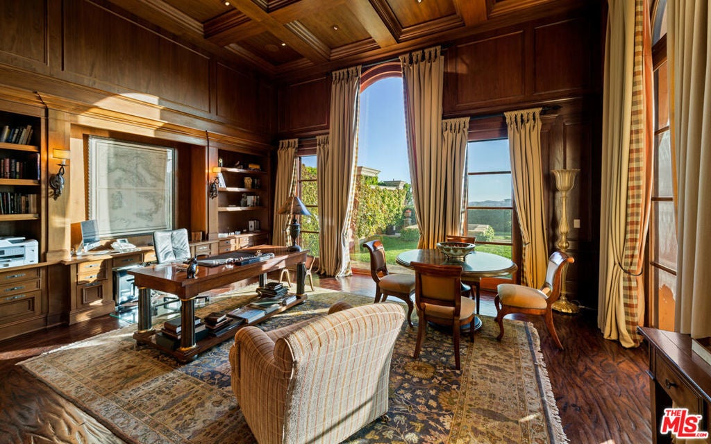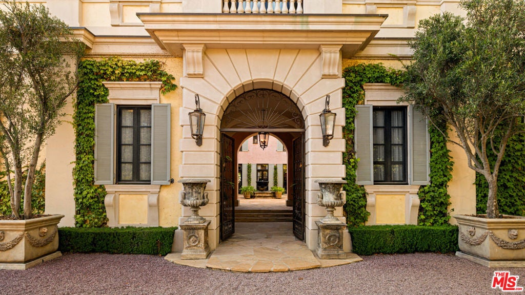 Set within the ultra-exclusive enclave of Brentwood Country Estates, a guard-gated community of just thirteen residences celebrated for 24/7 security, privacy, and sweeping vistas, this remarkable estate evokes the timeless romance of a European chateau. Encompassing approximately 9,400 square feet of living space on an expansive 6.13 acre lot, the property offers a rare combination of seclusion, scale, and architectural elegance. A private gate opens to a stately gravel motor court, instantly transporting you to the Tuscan countryside. Beyond an arched entry, a central courtyard unfolds, where vined walls, manicured gardens, a serene fountain, and flagstone pathways create an atmosphere of refined tranquility. Inside, the residence reveals exceptional craftsmanship throughout, featuring intricate marble floors, soaring ceilings, and the classic proportions of a true European manor. A dramatic two-story formal living room with stone fireplace and coffered, beamed ceilings flows seamlessly into an elegant formal dining room. The chef's country kitchen is anchored by a substantial center island, professional-grade appliances, and opens to both a charming breakfast room and an inviting family room with fireplace. A richly appointed wood-paneled office and library, two powder rooms, a guest suite, a generous playroom or bonus room, and a large, dedicated storage space thoughtfully positioned between levels enhance the functionality of the main residence. Upstairs, the primary suite serves as a private sanctuary, offering a fireplace, walls of French doors opening to a romantic terrace, dual custom walk-in closets, and a luxurious spa-like bath. A dedicated gym and three additional en-suite bedrooms provide comfort and flexibility. The resort-quality grounds are truly exceptional, featuring expansive lawns, covered patios, a sparkling pool and spa, and a rotunda gazebo crowning the landscape. Below the gazebo, a temperature-controlled wine cellar and tasting room accommodating approximately 1,000 bottles create an intimate setting for entertaining. From nearly every vantage point, sweeping canyon and ocean views stretch endlessly, forming a breathtaking natural backdrop. A rare offering of grace, grandeur, and security, 12721 Chalon Road is a world-class European retreat nestled in the heart of Brentwood.