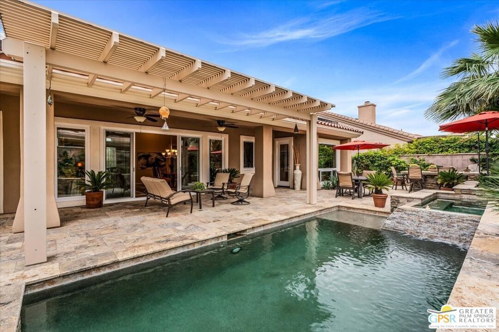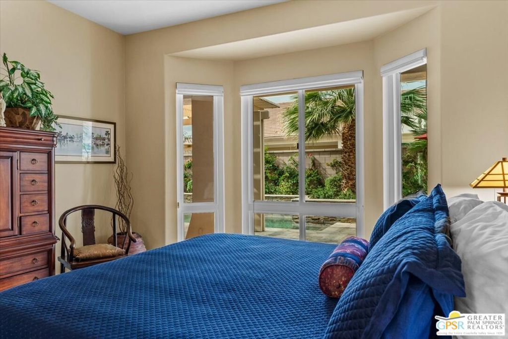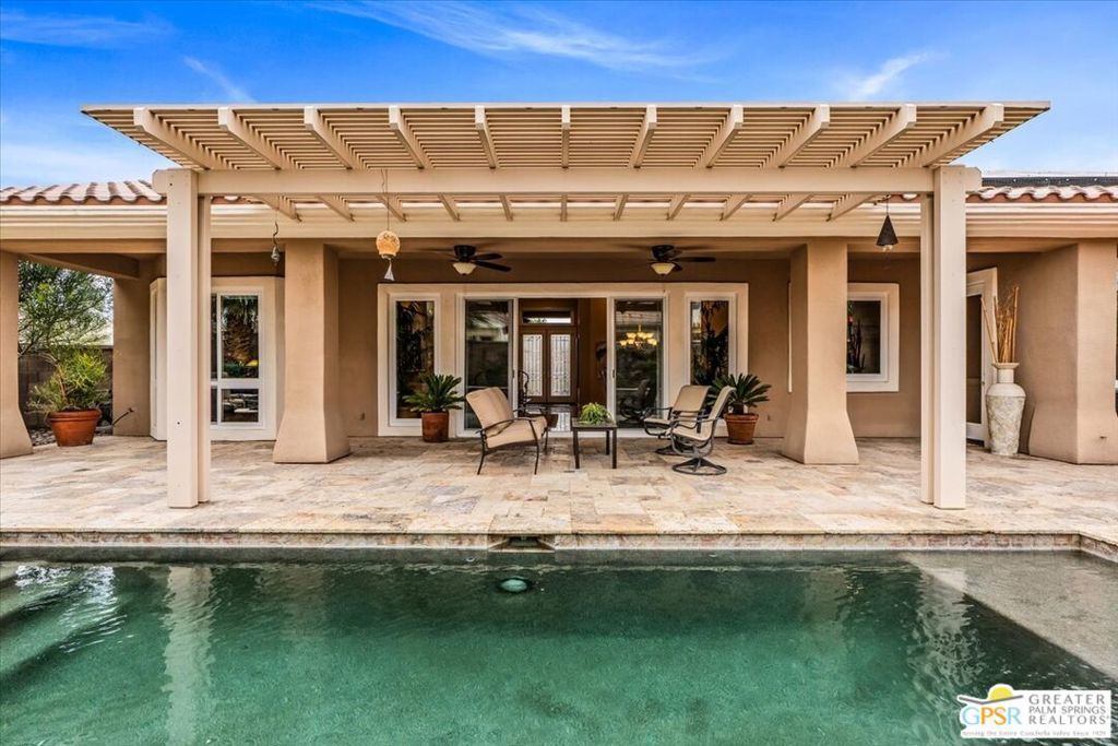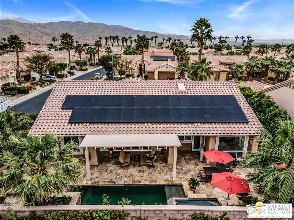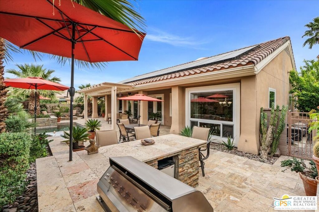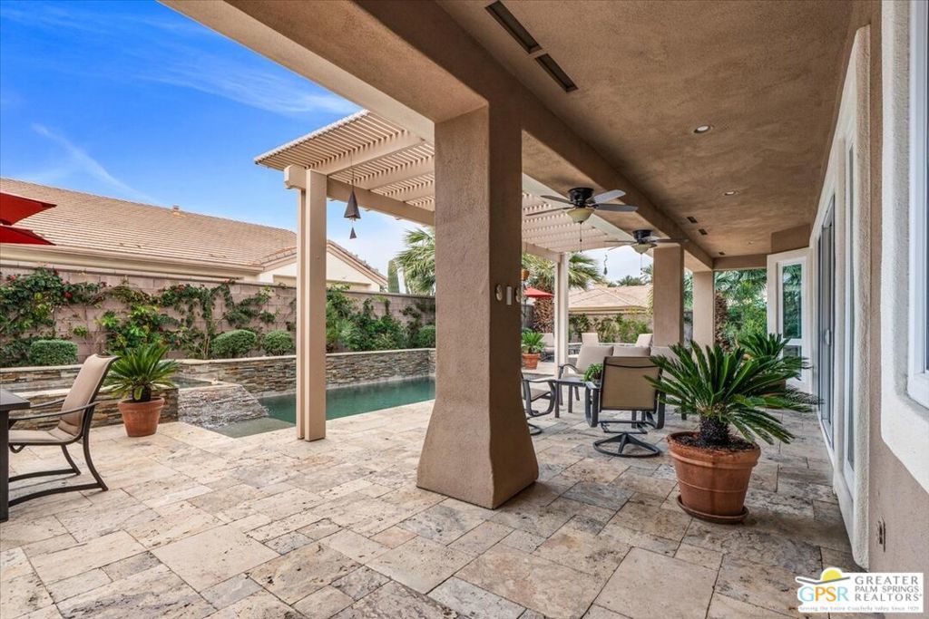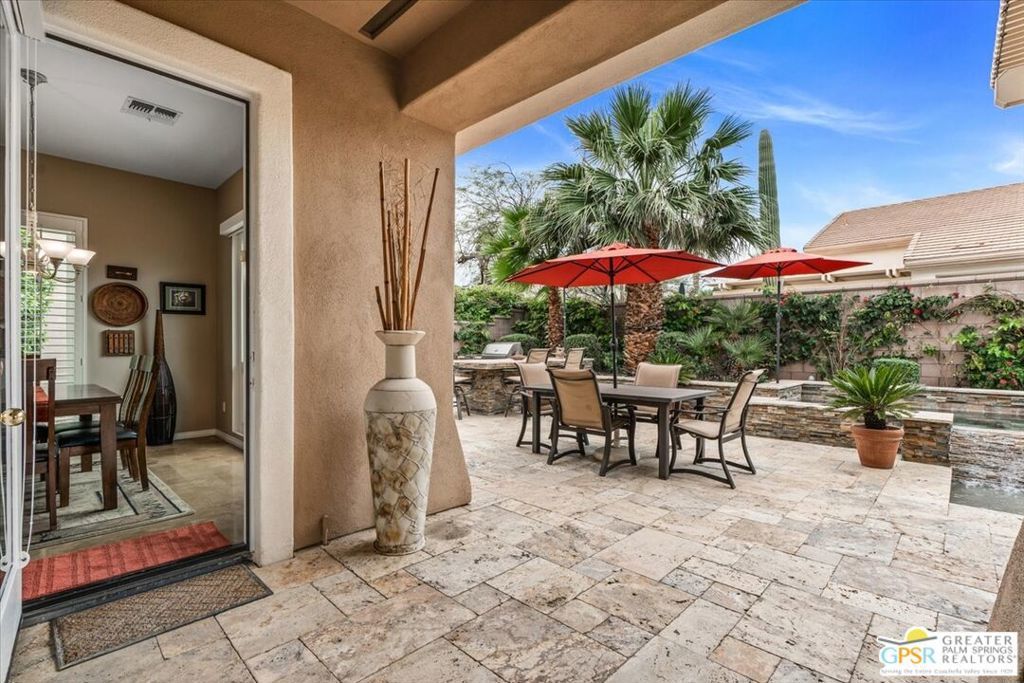 The highly sought-after "Estate Model" Monaco is one of the community's most popular floor plans, offering 3 bedrooms and 3 baths in a thoughtfully designed layout that balances comfort, privacy, and effortless desert living. Ideally situated in one of the most desirable quadrants of the community known for minimal wind and sand intrusion and no freeway noise from the I-10 this move-in-ready residence is just moments from the Lakeview Clubhouse and conveniently close to the dog park, placing premier amenities right at your fingertips. A private attached casita, accessed directly from the front gated courtyard, features its own bedroom, spacious sitting/office area, and bath perfect for guests, extended family, or a private home office. Enter through the charming courtyard and leaded-glass double doors into the elegant great room, where polished Travertine flooring, soaring ceilings, and skylights create a bright, open, and welcoming atmosphere. French sliding doors open to a beautifully designed backyard featuring natural rustic Travertine flooring, an Alumawood pergola with misting system and fans, a sparkling saltwater Pebble Tech pool and spa, outdoor kitchen, and natural gas fire pit creating the ultimate indoor-outdoor lifestyle ideal for both relaxing and entertaining. The well-appointed kitchen showcases granite tile countertops, a large center island, and opens seamlessly to the family room and breakfast nook for easy everyday living and hosting. The spacious primary suite offers a comfortable sitting area with views of the pool and outdoor entertaining spaces, while the generous primary bath features dual vanities, a custom walk-in closet, walk-in shower, and soaking tub for a true retreat experience. Additional highlights include: All-new windows and sliders (2025), Owned and paid-for solar for energy efficiency, 7-year-old HVAC system, impressive laundry room with built-in cabinetry and abundant storage. Extended 2-car garage with mini-split A/C plus dedicated golf cart garage. Kitchen & Garage refrigerator, double oven, dishwasher, microwave, washer/dryer, and outdoor mini refrigerator included to convey with sale. This exceptional home blends comfort, privacy, and resort-style 55+ living in one of the community's premier locations.