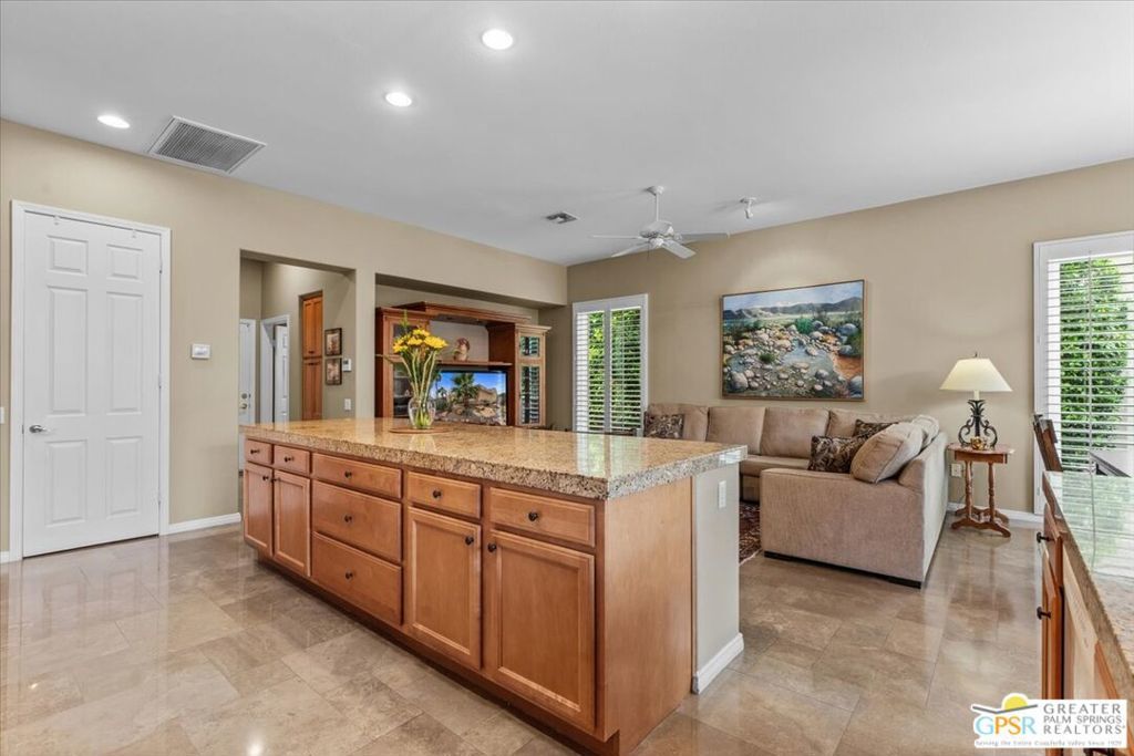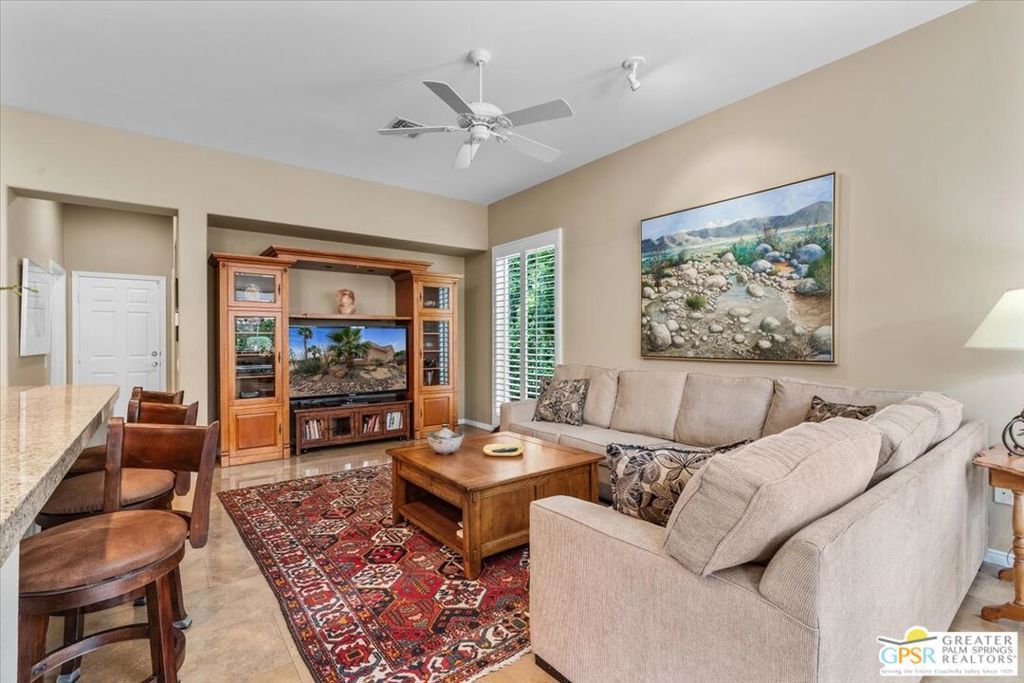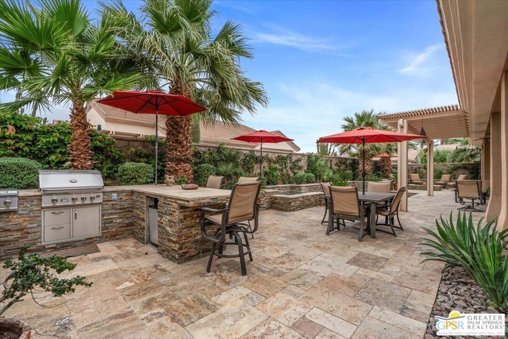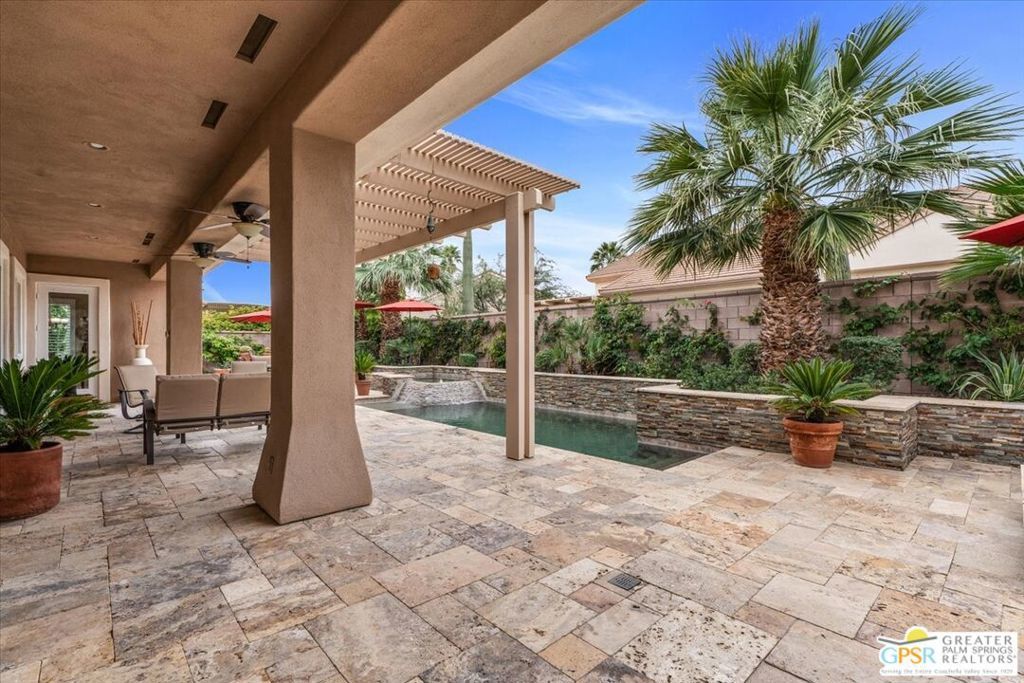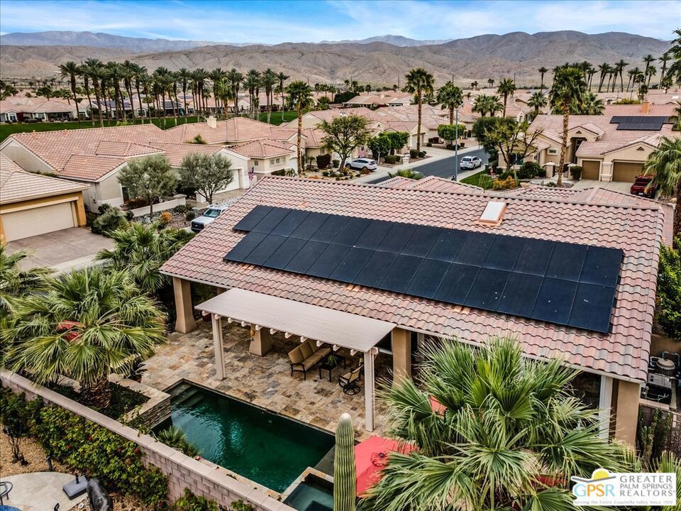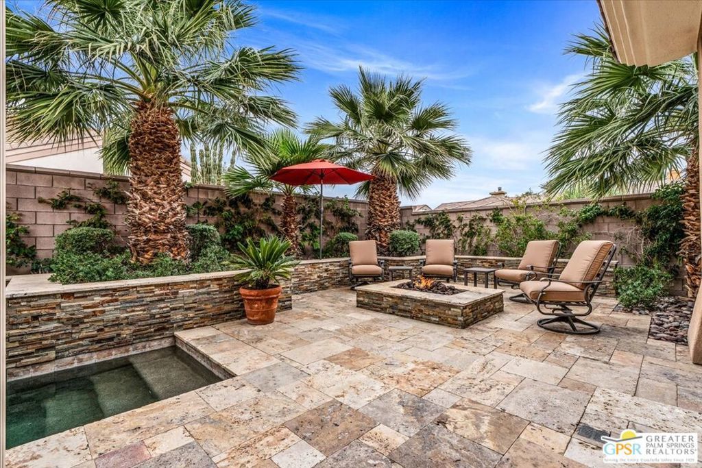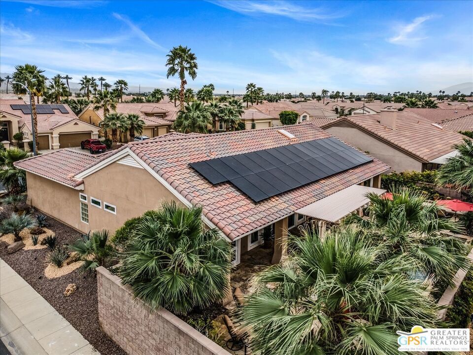 The highly sought-after "Estate Model" Monaco is one of the community's most popular floor plans, offering 3 bedrooms and 3 baths in a thoughtfully designed layout that balances comfort, privacy, and effortless desert living. Ideally situated in one of the most desirable quadrants of the community known for minimal wind and sand intrusion and no freeway noise from the I-10 this move-in-ready residence is just moments from the Lakeview Clubhouse and conveniently close to the dog park, placing premier amenities right at your fingertips. A private attached casita, accessed directly from the front gated courtyard, features its own bedroom, spacious sitting/office area, and bath perfect for guests, extended family, or a private home office. Enter through the charming courtyard and leaded-glass double doors into the elegant great room, where polished Travertine flooring, soaring ceilings, and skylights create a bright, open, and welcoming atmosphere. French sliding doors open to a beautifully designed backyard featuring natural rustic Travertine flooring, an Alumawood pergola with misting system and fans, a sparkling saltwater Pebble Tech pool and spa, outdoor kitchen, and natural gas fire pit creating the ultimate indoor-outdoor lifestyle ideal for both relaxing and entertaining. The well-appointed kitchen showcases granite tile countertops, a large center island, and opens seamlessly to the family room and breakfast nook for easy everyday living and hosting. The spacious primary suite offers a comfortable sitting area with views of the pool and outdoor entertaining spaces, while the generous primary bath features dual vanities, a custom walk-in closet, walk-in shower, and soaking tub for a true retreat experience. Additional highlights include: All-new windows and sliders (2025), Owned and paid-for solar for energy efficiency, 7-year-old HVAC system, impressive laundry room with built-in cabinetry and abundant storage. Extended 2-car garage with mini-split A/C plus dedicated golf cart garage. Kitchen & Garage refrigerator, double oven, dishwasher, microwave, washer/dryer, and outdoor mini refrigerator included to convey with sale. This exceptional home blends comfort, privacy, and resort-style 55+ living in one of the community's premier locations.