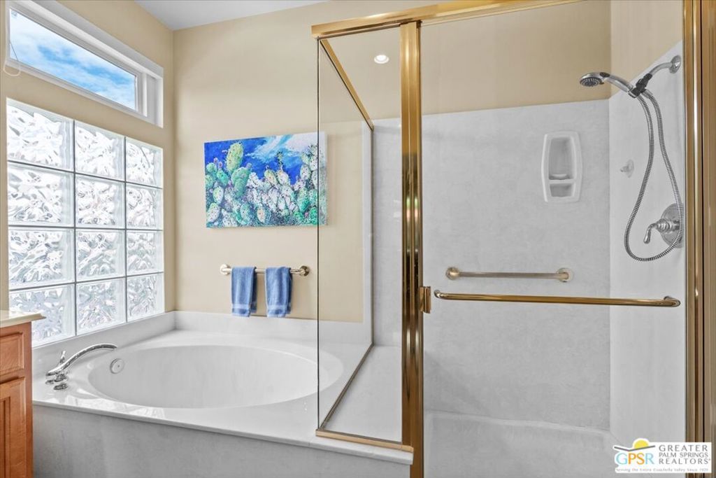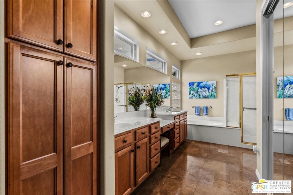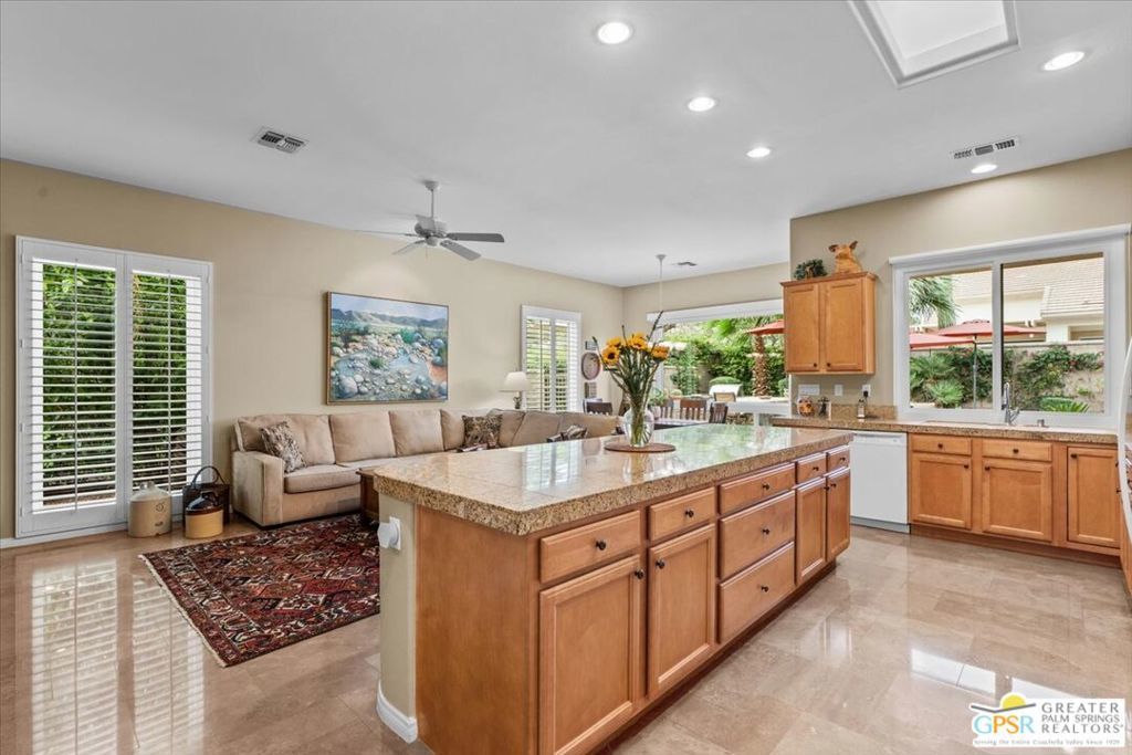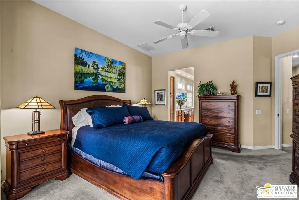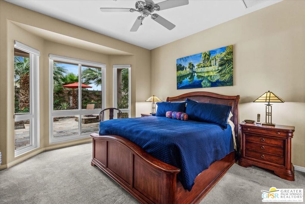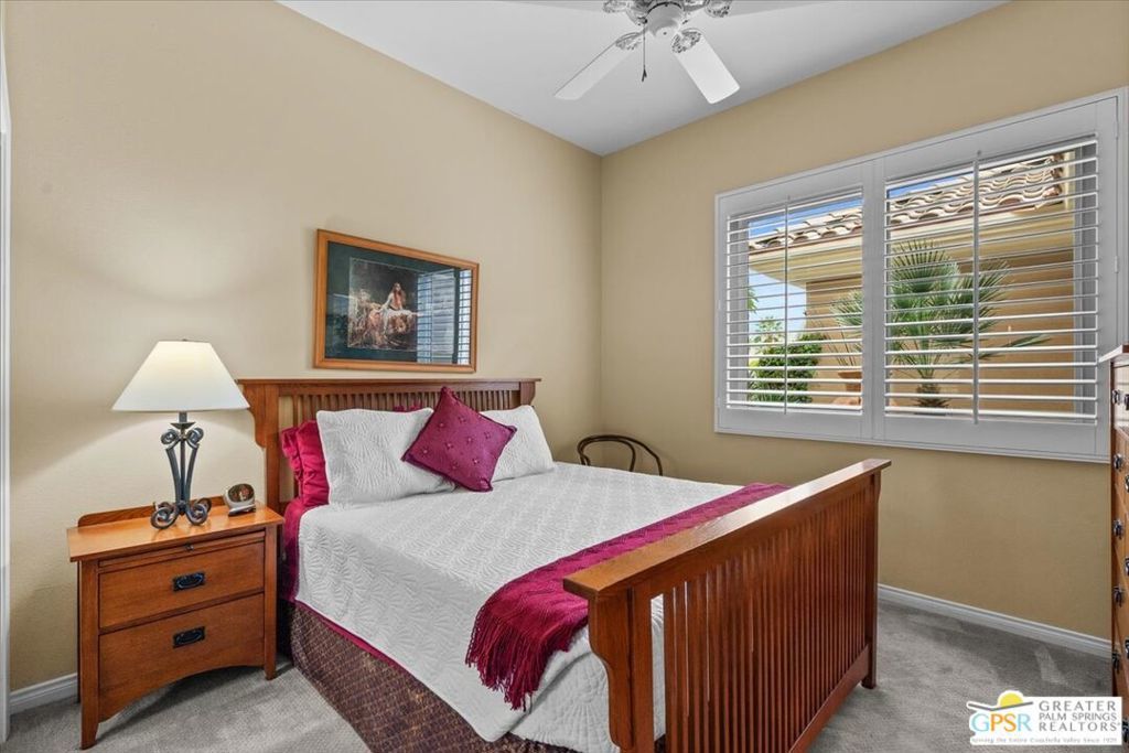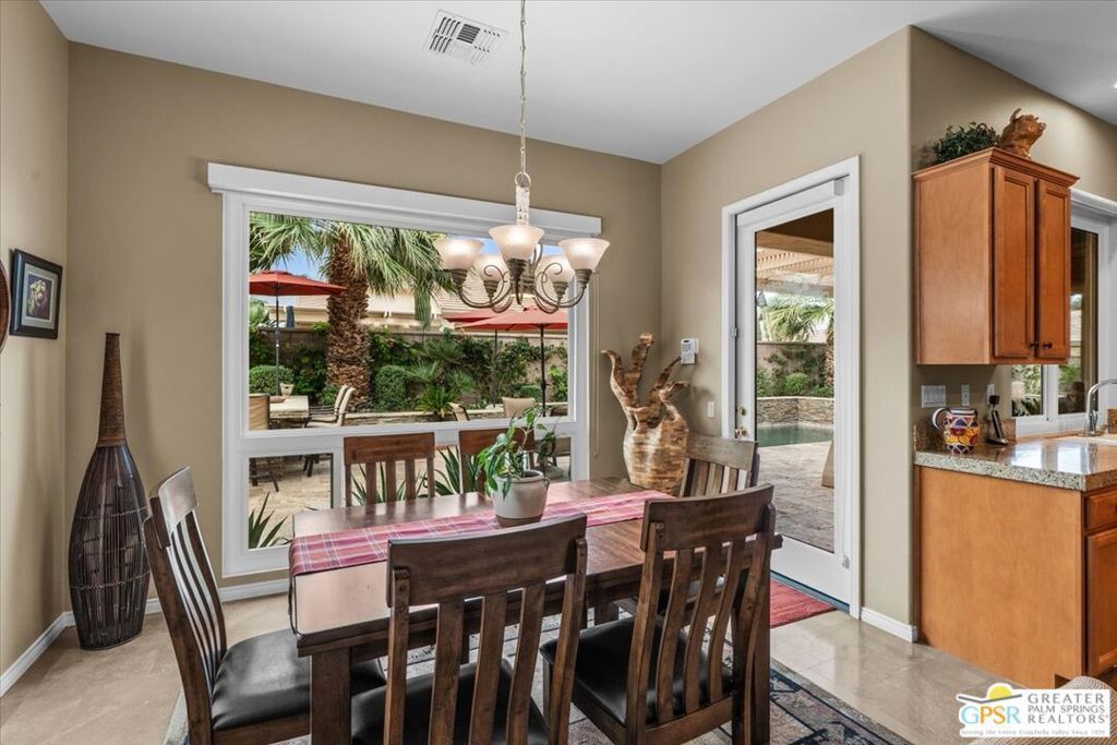The highly sought-after "Estate Model" Monaco is one of the community's most popular floor plans, offering 3 bedrooms and 3 baths in a thoughtfully designed layout that balances comfort, privacy, and effortless desert living. Ideally situated in one of the most desirable quadrants of the community known for minimal wind and sand intrusion and no freeway noise from the I-10 this move-in-ready residence is just moments from the Lakeview Clubhouse and conveniently close to the dog park, placing premier amenities right at your fingertips. A private attached casita, accessed directly from the front gated courtyard, features its own bedroom, spacious sitting/office area, and bath perfect for guests, extended family, or a private home office. Enter through the charming courtyard and leaded-glass double doors into the elegant great room, where polished Travertine flooring, soaring ceilings, and skylights create a bright, open, and welcoming atmosphere. French sliding doors open to a beautifully designed backyard featuring natural rustic Travertine flooring, an Alumawood pergola with misting system and fans, a sparkling saltwater Pebble Tech pool and spa, outdoor kitchen, and natural gas fire pit creating the ultimate indoor-outdoor lifestyle ideal for both relaxing and entertaining. The well-appointed kitchen showcases granite tile countertops, a large center island, and opens seamlessly to the family room and breakfast nook for easy everyday living and hosting. The spacious primary suite offers a comfortable sitting area with views of the pool and outdoor entertaining spaces, while the generous primary bath features dual vanities, a custom walk-in closet, walk-in shower, and soaking tub for a true retreat experience. Additional highlights include: All-new windows and sliders (2025), Owned and paid-for solar for energy efficiency, 7-year-old HVAC system, impressive laundry room with built-in cabinetry and abundant storage. Extended 2-car garage with mini-split A/C plus dedicated golf cart garage. Kitchen & Garage refrigerator, double oven, dishwasher, microwave, washer/dryer, and outdoor mini refrigerator included to convey with sale. This exceptional home blends comfort, privacy, and resort-style 55+ living in one of the community's premier locations.