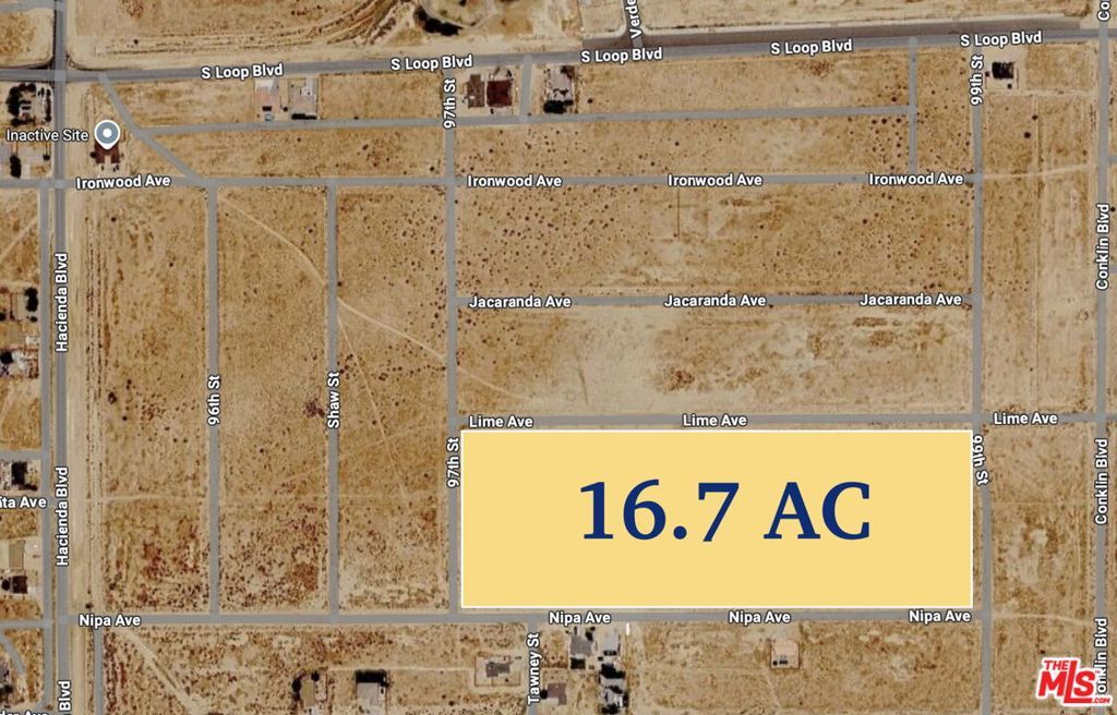 Discover an extraordinary opportunity to own a massive 16.7-acre parcel in the heart of California City, Kern County. Strategically positioned between R1 (Single-Family Residential) and RM1 (Mixed Residential) zones, this property offers a unique advantage for investors and developers looking to capitalize on future city growth. The land is zoned O/RA (Open Space / Residential Agriculture), providing a versatile "blank canvas" for a private luxury estate, hobby farm, or long-term hold. Boasting a perfectly flat topography and a clean rectangular shape, this parcel minimizes development costs while maximizing usable space. Accessibility is unparalleled, with the lot bordered by established streets on all sides: 97th St to the west , 99th St to the east , Lime Ave to the north , and Nipa Ave to the south. Located just south of S Loop Blvd and east of Hacienda Blvd, this site offers the perfect balance of seclusion and proximity to local infrastructure. Priced competitively at $10,000 per acre, this is one of the most cost-effective large-scale land opportunities in the region. Whether you are envisioning a sustainable ranch or a strategic residential subdivision project, this 16.7-acre tract is ready for your vision