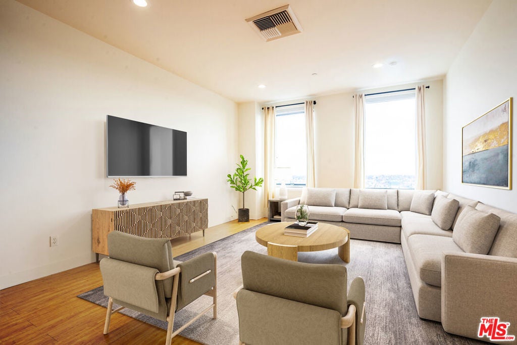Stylish high-rise living in the heart of Koreatown at The Mercury. This bright south-facing one-bedroom loft-style residence features an open floor plan and airy layout designed for modern urban living. A versatile space ideal for a home office adds flexibility for today's work-from-home lifestyle. Recently remodeled, the unit features new flooring, recessed LED lighting, and new appliances, along with the convenience of an in-unit washer and dryer. Residents enjoy resort-style rooftop amenities including a pool, spa, fitness center, and BBQ area, all set against breathtaking 360-degree views of the Los Angeles skyline. Ideally located within walking distance of popular restaurants, shopping, and Metro access, this home offers the perfect blend of comfort, convenience, and vibrant city living.