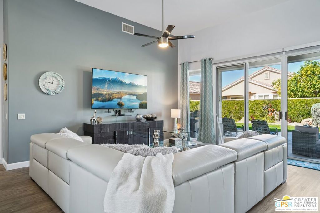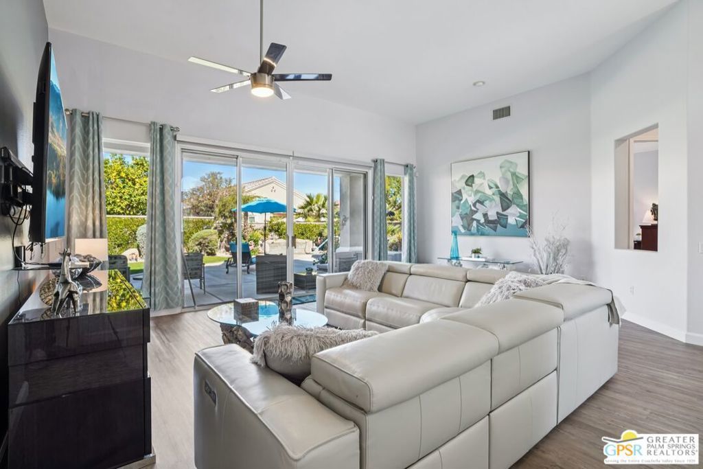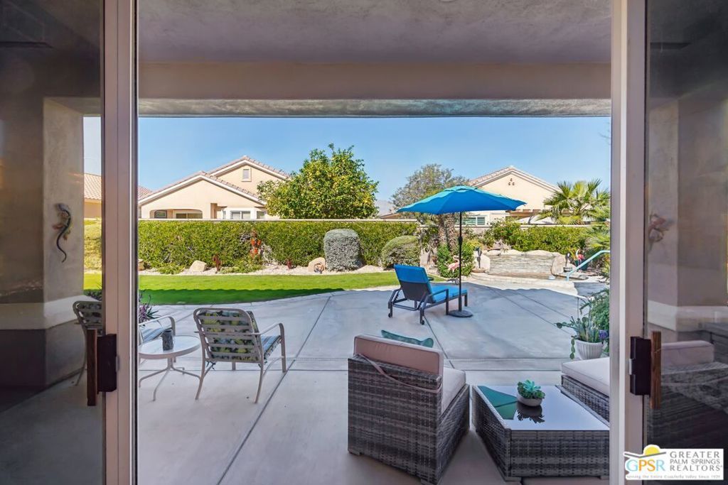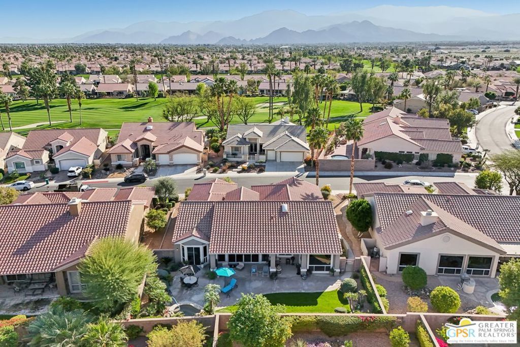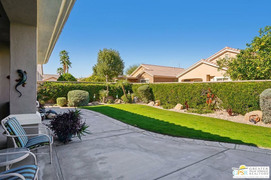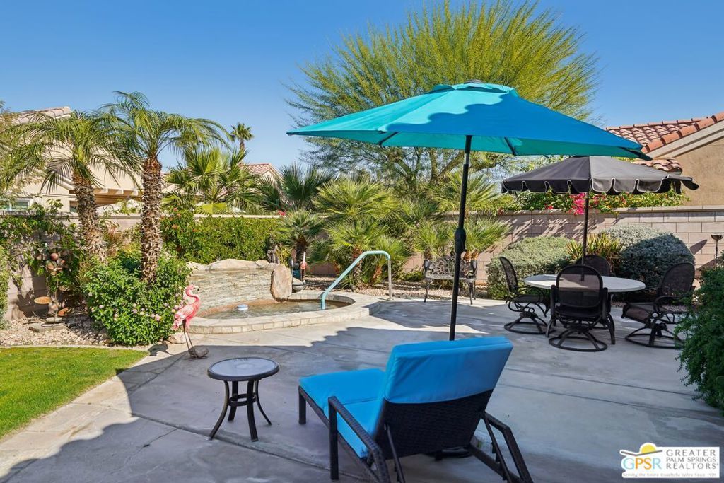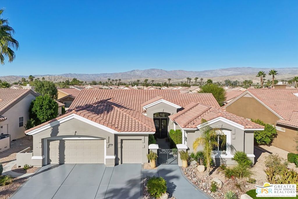 Set on a quiet street near the Sunset View Clubhouse, this upgraded 3 bedroom, 3 bath extended Monaco with extended garage offers over 2,500 sq ft of versatile desert living inside Del Webb Sun City Palm Desert, one of the country's most sought after 55+ communities. The light filled great room opens to a private backyard with lawn, spa, and waterfall, creating a true indoor-outdoor retreat. The open kitchen and family room feature a large center island and casual dining area ideal for entertaining or everyday comfort. The primary suite includes a very spacious walk-in closet, large bathroom closet with plenty of storage, and beautiful spa-style shower. Two additional suites, each with their own private access, offer exceptional flexibility for guests, a home office, or income-producing casitas. Additional highlights include a laundry room, oversized two car garage, plus a dedicated golf cart garage. Residents enjoy access to two championship golf courses, resort-style pools, a modern fitness center, walking trails, clubhouses, dining, and endless social activities, all within a beautifully maintained, guard gated community. This is relaxed, resort-style desert living at its finest. Furnishings available outside of escrow