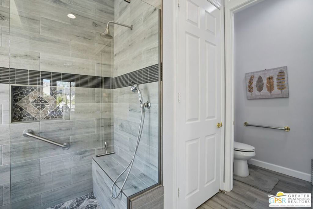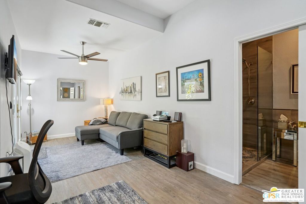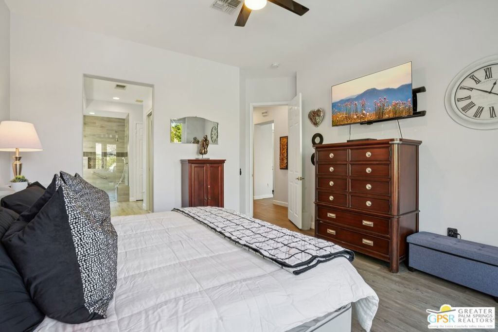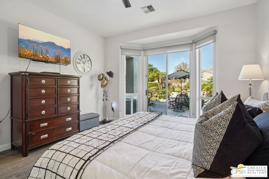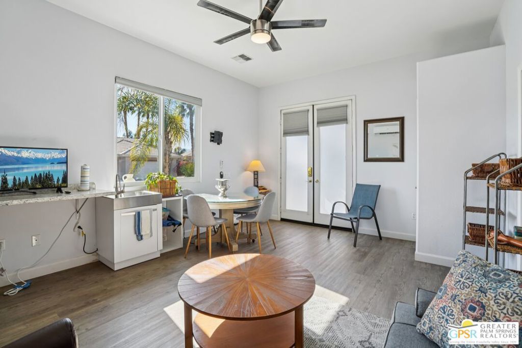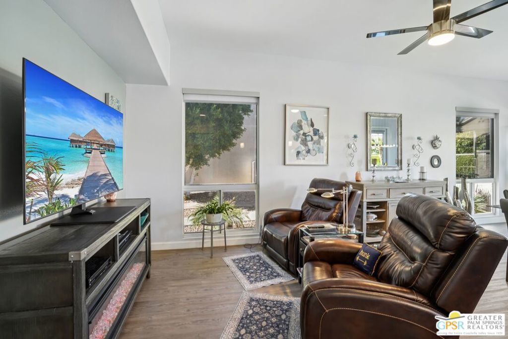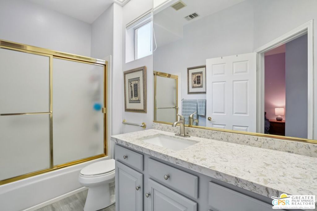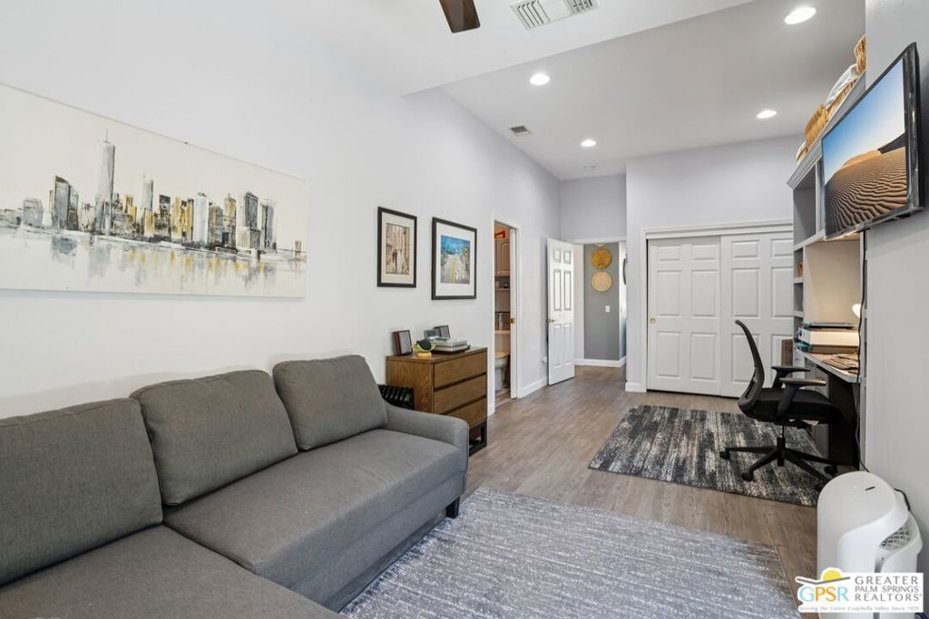Set on a quiet street near the Sunset View Clubhouse, this upgraded 3 bedroom, 3 bath extended Monaco with extended garage offers over 2,500 sq ft of versatile desert living inside Del Webb Sun City Palm Desert, one of the country's most sought after 55+ communities. The light filled great room opens to a private backyard with lawn, spa, and waterfall, creating a true indoor-outdoor retreat. The open kitchen and family room feature a large center island and casual dining area ideal for entertaining or everyday comfort. The primary suite includes a very spacious walk-in closet, large bathroom closet with plenty of storage, and beautiful spa-style shower. Two additional suites, each with their own private access, offer exceptional flexibility for guests, a home office, or income-producing casitas. Additional highlights include a laundry room, oversized two car garage, plus a dedicated golf cart garage. Residents enjoy access to two championship golf courses, resort-style pools, a modern fitness center, walking trails, clubhouses, dining, and endless social activities, all within a beautifully maintained, guard gated community. This is relaxed, resort-style desert living at its finest. Furnishings available outside of escrow