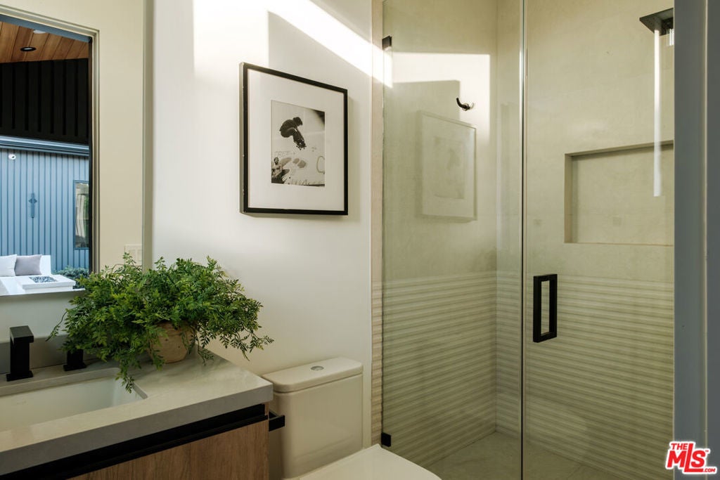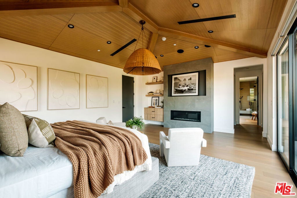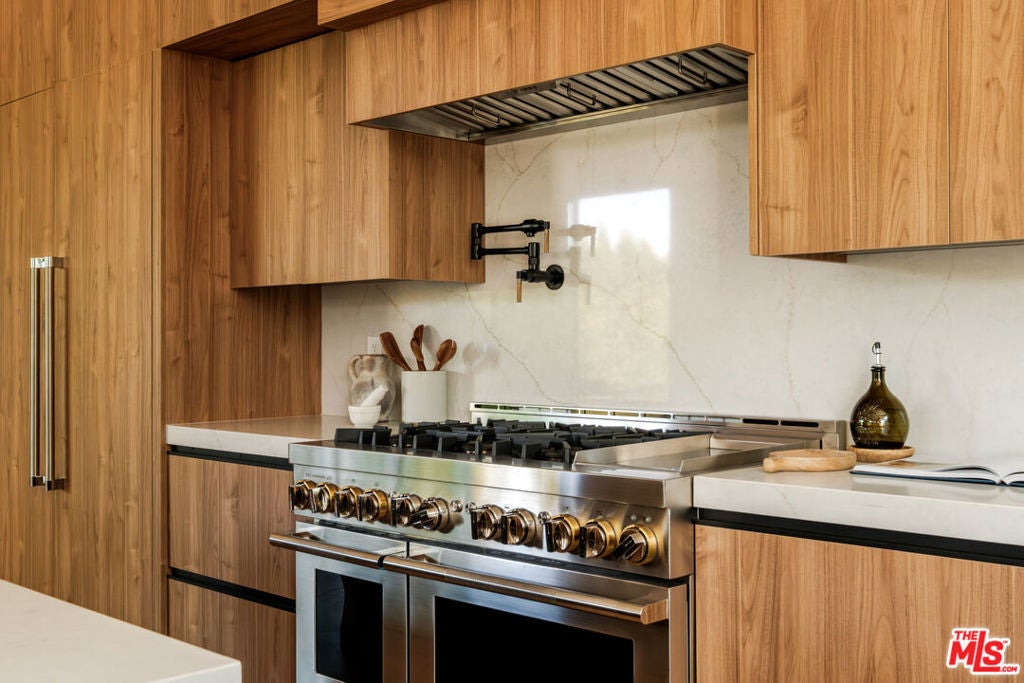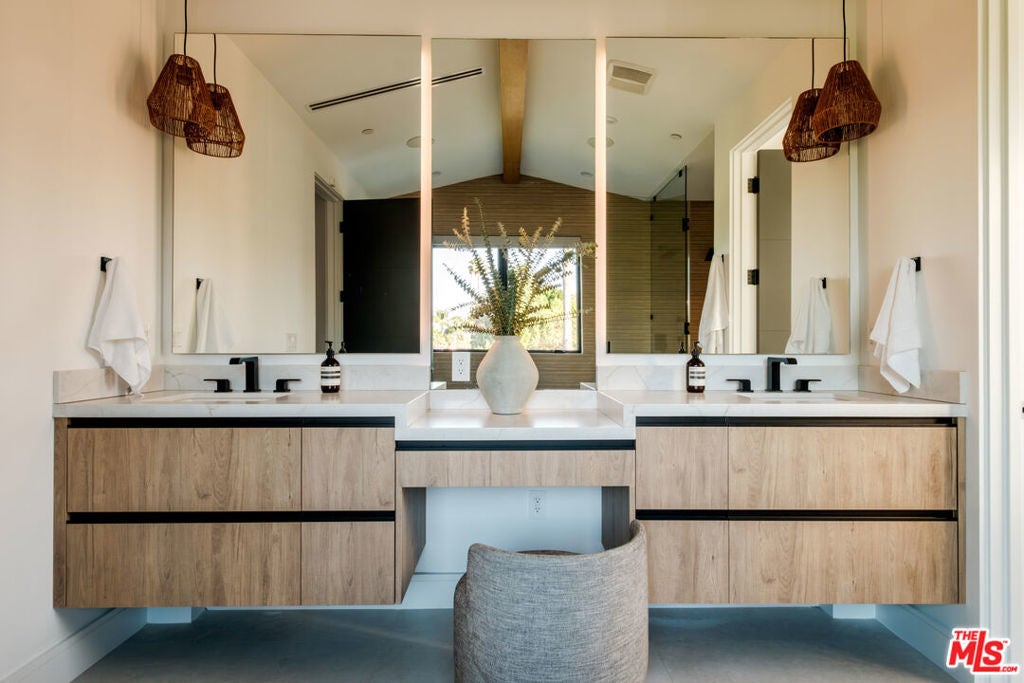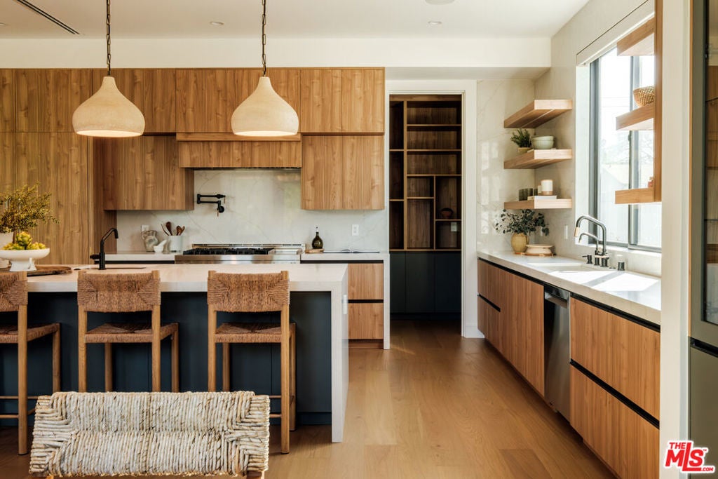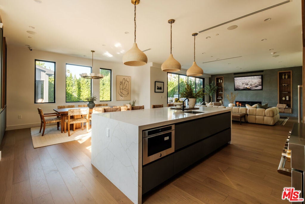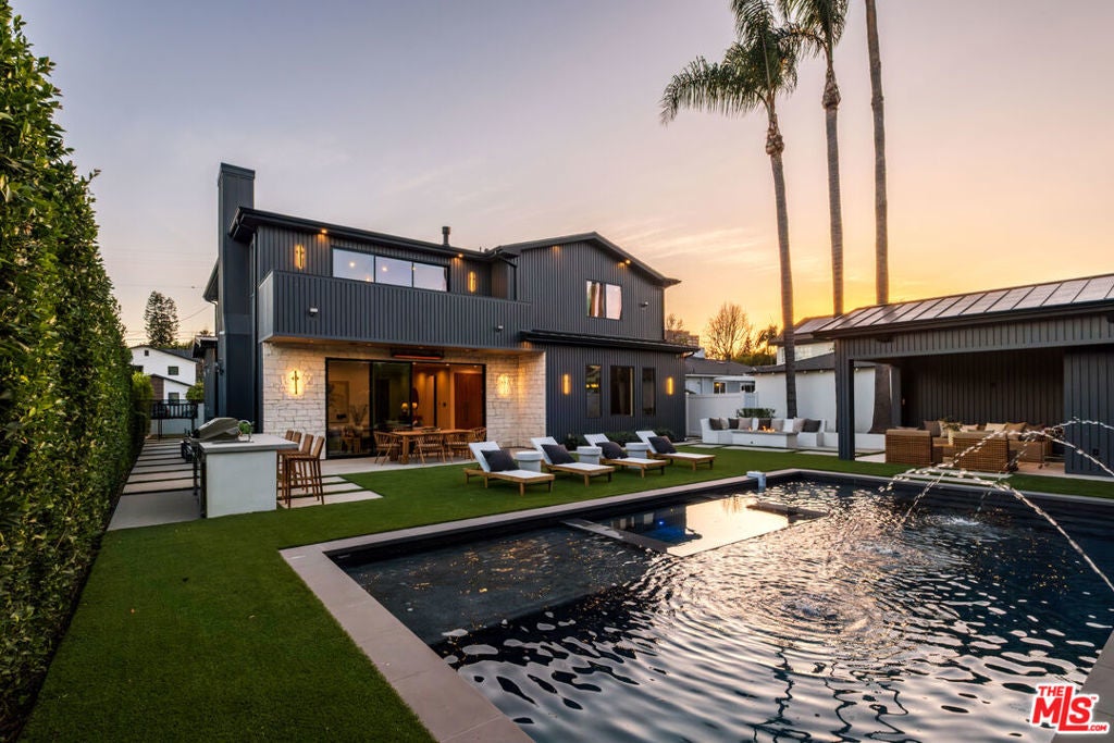 A masterfully crafted modern farmhouse where organic elegance and seamless indoor-outdoor living define Sherman Oaks luxury. Welcome to 15473 La Maida, a stunning newly constructed modern farmhouse, privately set on a tranquil street in one of Sherman Oaks' most desirable neighborhoods. Behind gates and striking curb appeal, a grand covered entry welcomes you with soaring ceilings, bespoke designer lighting, and wide-plank European oak floors throughout. The main level unfolds with an elegant living room anchored by a statement stone fireplace, seamlessly flowing into a formal dining room with custom built-ins. At the heart of the home is a chef's kitchen designed to impress, featuring a generous center island, quartz countertops, premium stainless steel appliances, and an expansive walk-in pantry. The adjacent family room, complete with custom built-ins and a fireplace, opens through floor-to-ceiling pocket glass doors to create a true indoor-outdoor lifestyle. Upstairs, the romantic primary suite is a peaceful sanctuary, offering a cozy sitting area, fireplace, dual walk-in closets, and a spa-inspired bath appointed with a soaking tub, glass-enclosed rain shower, dual vanities, dedicated makeup seating, and private water closet.Designed for entertaining, the resort-style backyard showcases a sparkling pool and spa, fire pit, built-in BBQ and a poolside cabana complete with its own bathroom. Additional highlights include an upstairs laundry room, Control4 smart home integration, and a two-car garage. An exceptional opportunity to enjoy refined modern living just moments from premier shopping, fine dining, and all that Sherman Oaks has to offer.