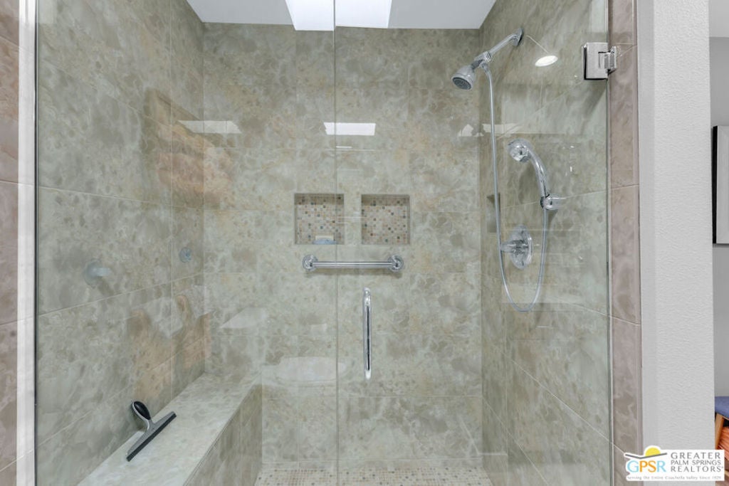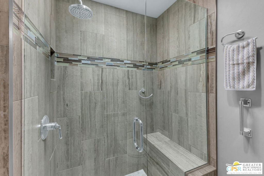 This fully remodeled Mid-Century Modern residence offers stunning mountain views, owned solar, and a seamless indoor outdoor lifestyle in the iconic Tamarisk West community, which has been featured in Modernism Week. Floor to ceiling walls of glass frame lush landscaping, expansive greenbelts, and dramatic southern mountain vistas, filling the home with natural light and a strong connection to the outdoors. The open living and dining spaces showcase classic Mid-Century architecture with high ceilings, clerestory windows, clean lines, and aluminum sliding doors that open to multiple outdoor living areas. The updated kitchen is both functional and stylish, featuring a full BOSCH stainless steel appliance suite, ample cabinetry, generous counter space, and a window overlooking the patio. A custom bar and libation station with wine refrigerator adds a perfect entertaining element. Both bedrooms are en-suite and thoughtfully separated for privacy. The spacious primary offers mountain and garden views through floor to ceiling sliders, a large custom walk in closet, and a beautifully updated bath with dual vanities, walk in shower, and a dedicated built in workspace. The guest suite also enjoys direct patio access, pool and garden views, a walk in closet, and a generous ensuite bath. Outdoor living is exceptional with two private patio spaces designed for both relaxation and entertaining. The main patio features new tile flooring, an oversized electric retractable cover, lush landscaping, and mountain views, creating an ideal setting for dining or lounging. A second patio off the living area offers a quiet, tranquil retreat surrounded by greenery. Additional highlights include freshly painted interiors, updated baths, custom window treatments, owned solar, and a well maintained, low density HOA with a large community pool serving just twelve residences. Centrally located in Rancho Mirage, this home delivers timeless Mid-Century design, privacy, and effortless desert living. Make your appt for a private showing today!