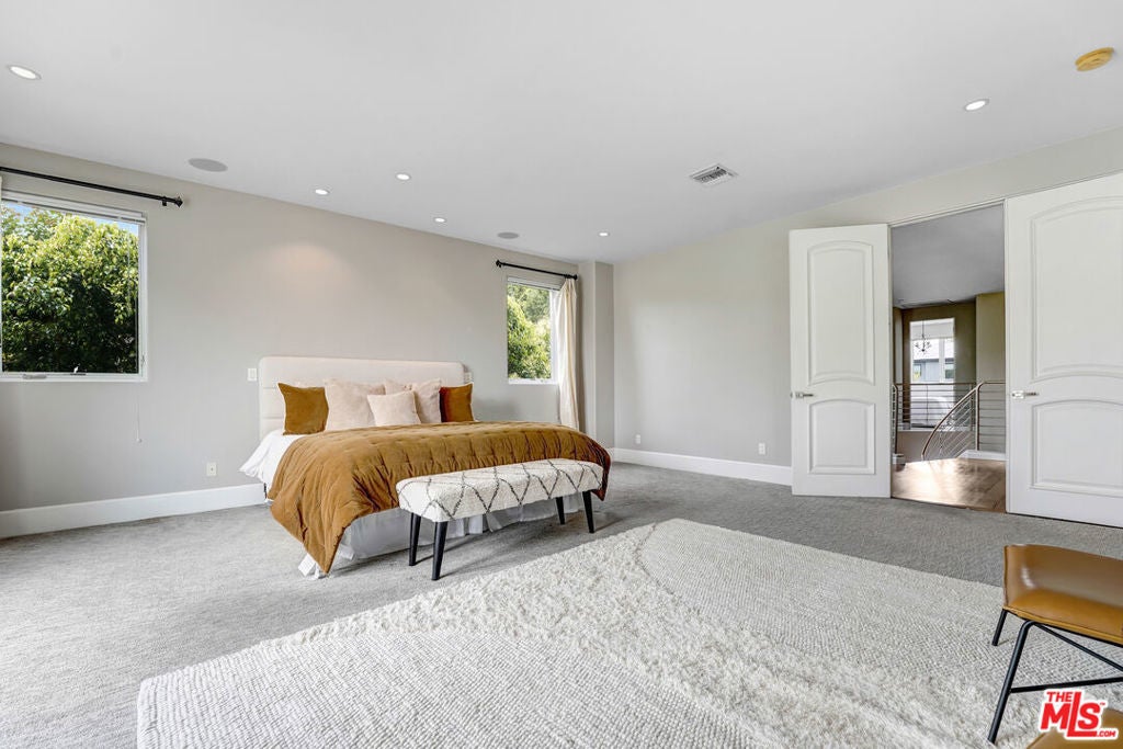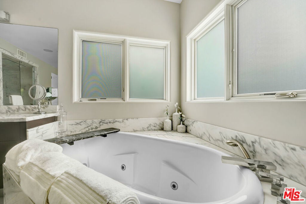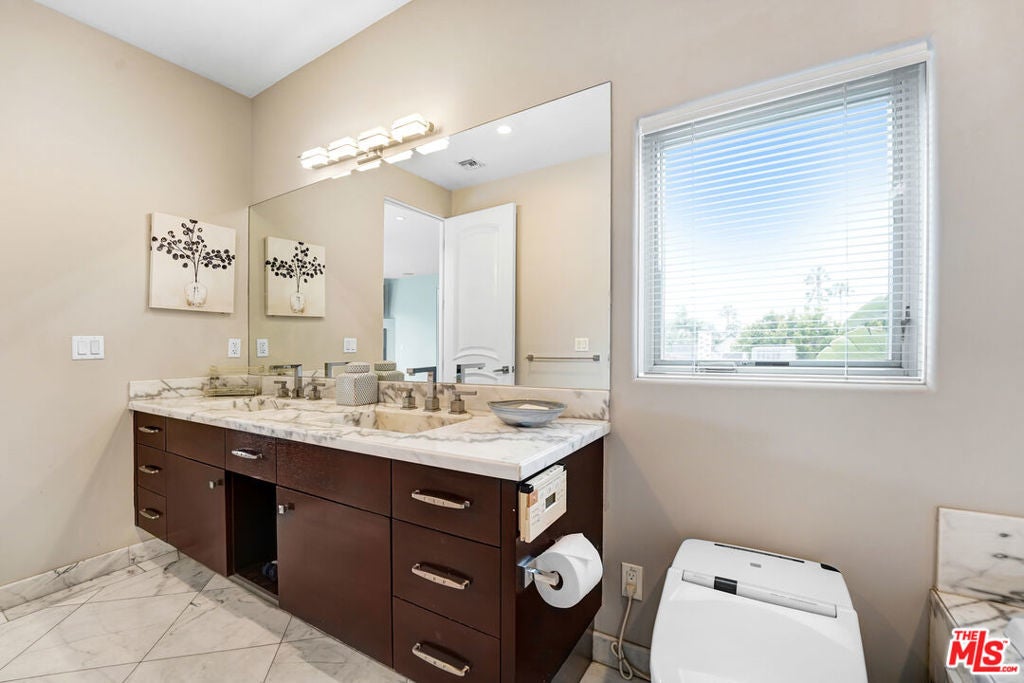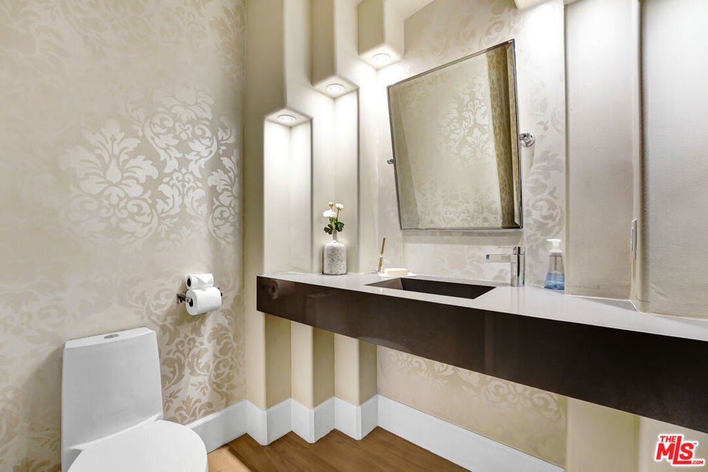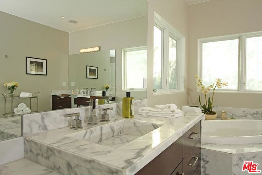 Contemporary Masterpiece! This contemporary dream home features a great-for-entertaining floor plan, grand living room, wet bar w granite counter-tops, & Venetian plaster finished wall fireplace. Formal dining room leads through the butler's station into a professional Chef's kitchen, large center island with sink, stainless steel appliances, custom made cabinetry, 32-bottle wine refrigerator, walk-in pantry, & breakfast area. The first floor also features a large bedroom suite & a luxurious venetian plaster powder room. Glide up the intricate modern staircase with designer railing to the second floor featuring three bedroom suites, including 2 Luxurious Master Suites with steam showers in white Carrera marble, bubbling spa tubs with massaging jets, state-of-the-art bidet toilets, custom made hardwood cabinets, designer sinks, boutique walk-in closets, and fireplaces. Expansive outdoor entertaining area, complete with cabana-style sitting area and lushly landscaped backyard. Enjoy the lifestyle of Melrose, West Hollywood, Beverly Hills, and Sunset Strip!
