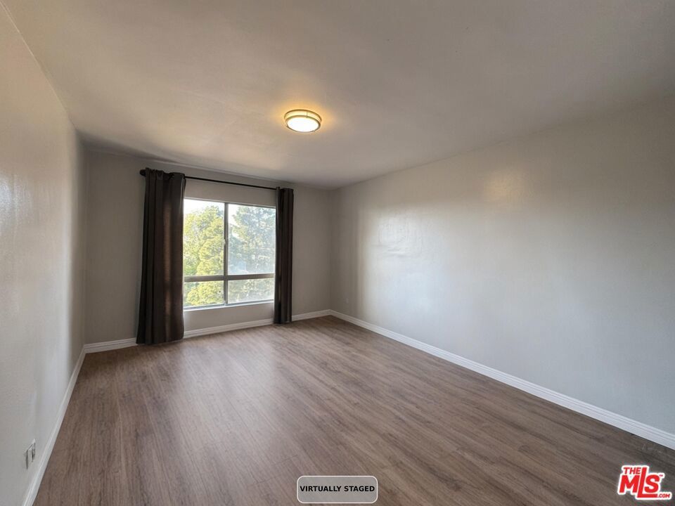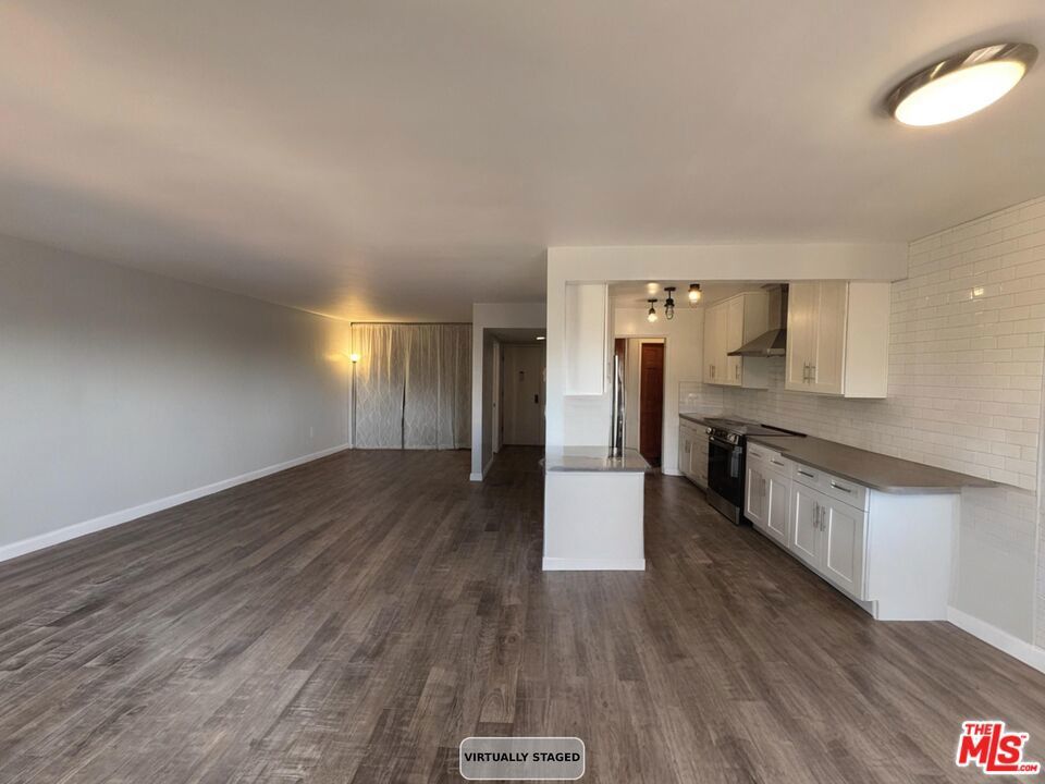 Whether you're relocating to the Culver City area, or looking for a stylish pied-a-terre, this gorgeous top-floor unit in the Adobe Grande complex is the perfect fit! Double-Entry Doors welcome you into a spacious unit, with an open floor plan that connects the living spaces and balcony for a clean light-filled area perfect for both entertaining and everyday living. The galley kitchen has been beautifully remodeled, and features stone countertops and stainless steel appliances. Look out over treetops and city lights, with no neighbors in front to block your view or impose on your privacy. Sliding glass doors lead from the dining area onto a cozy balcony that's suited for enjoying a morning cup of coffee, or catching a spectacular sunset. There is a 2-piece guest bathroom, plus a full-size bathroom down the hall, with a rain showerhead, and a jetted tub to soak away the stresses of the day. The bedroom suite includes a large walk-in closet, and picture windows. Overall, this unit offers an exceptional layout with abundant storage and closet space. The HOA features secure entry, gated parking, elevator, lush landscaping, pool, hot tub, and clubhouse. There is communal laundry room on each floor, with brand-new machines, but there may be an option for in-unit laundry, with permits and HOA approval. Additional conveniences include extra storage space, secured bike room, and one parking space. Adobe Grande is a secure, resort-like complex with a sparkling pool and spa, recreation room, and beautiful grounds featuring running brooks and a koi pond, all just steps from your front door. Situated close to Fox Hills Park and Westfield Culver City Mall, with easy access to freeways and short drives to Venice Beach, Marina del Rey, LAX, and premier restaurants, this location blends convenience with lifestyle. [All furnishings and decor are virtually rendered.]