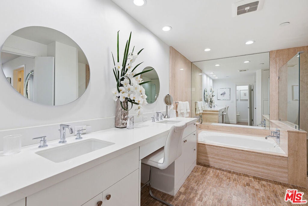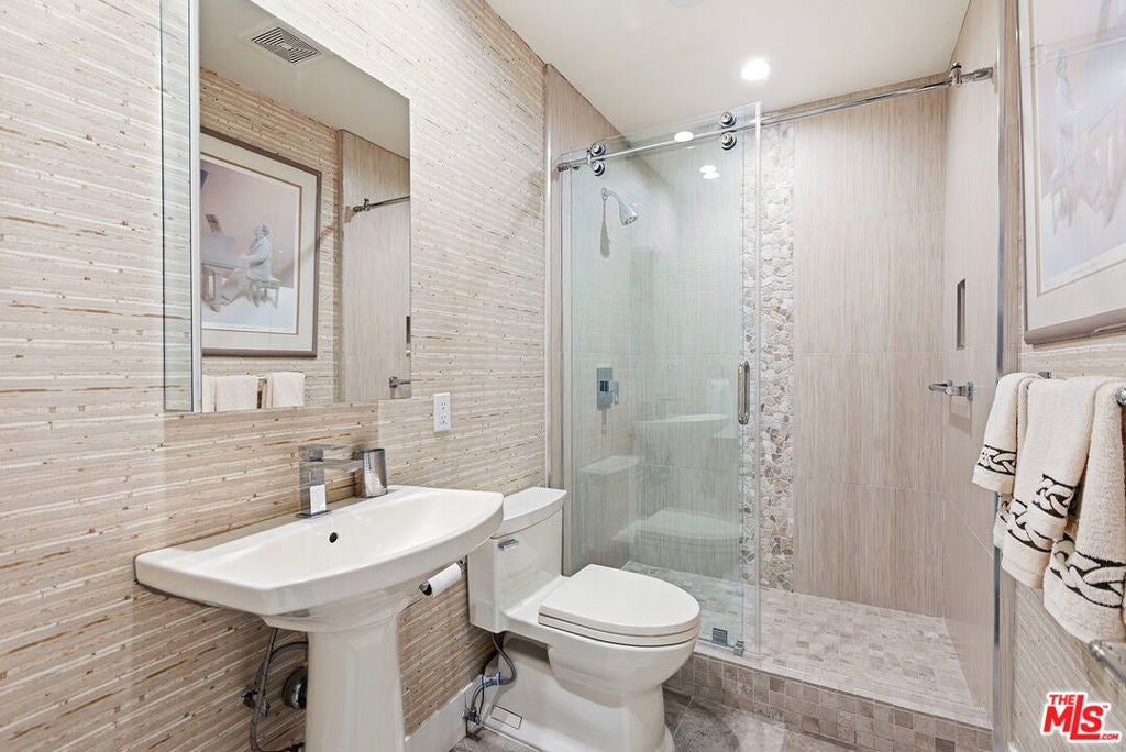 Located in the prestigious Ten Five Sixty building, this spectacularly reimagined residence leaves no detail overlooked. As you enter through the elegant double doors, thoughtful enhancements include motorized shades on oversized, double-paned windows, a refined lighting design, and a light-filled gourmet kitchen with Thermador appliances and smart fridge, that is both beautiful and highly functional - making this home a true rarity along the Wilshire Corridor. The stylish living area features a fireplace and an expansive television niche, seamlessly opening to a charming semi-circular covered balcony. Down the hall, two generously sized bedrooms each offer en-suite baths. The primary suite is highlighted by a large walk-in closet and a spa like bathroom with a soaking tub, separate shower, dual sinks, and a dedicated makeup area. Additional features include recently capped sprinklers, for a clean uninterrupted aesthetic, a powder room, and a separate laundry room. Residents of Ten Five Sixty enjoy convenient access from Thayer Avenue, along with 24-hour valet, security and concierge services. Recent renovations have further elevated the building's expansive lobby, social lounge with caterer's kitchen, outdoor patios, pool and spa, and fully equipped fitness center. This unit offers a truly effortless luxury lifestyle. List of upgrades in the document file above.
