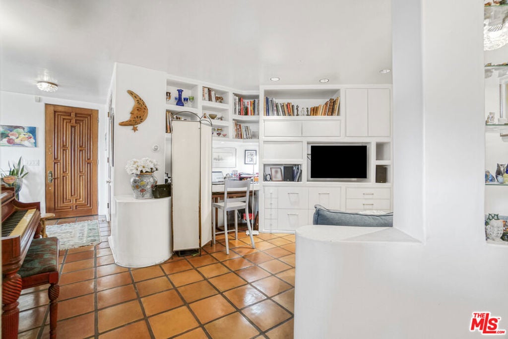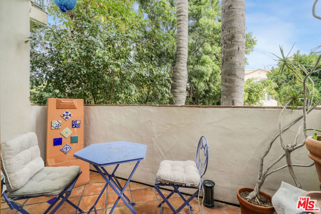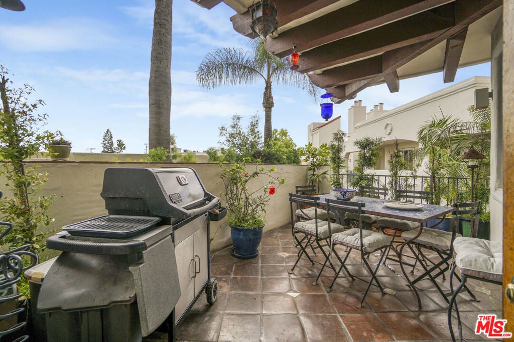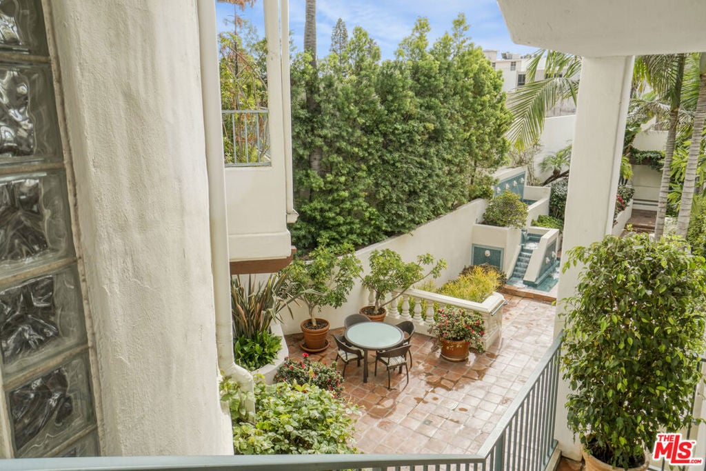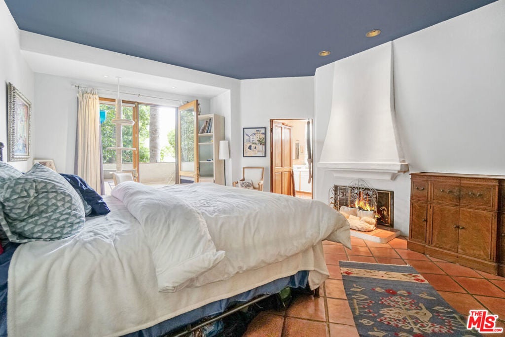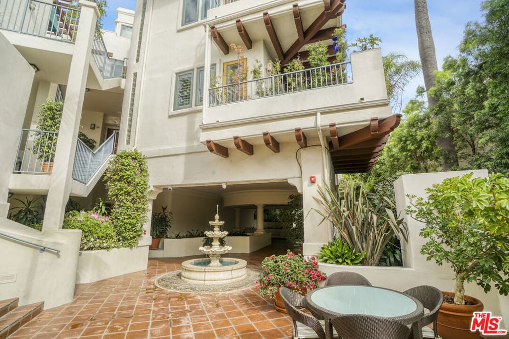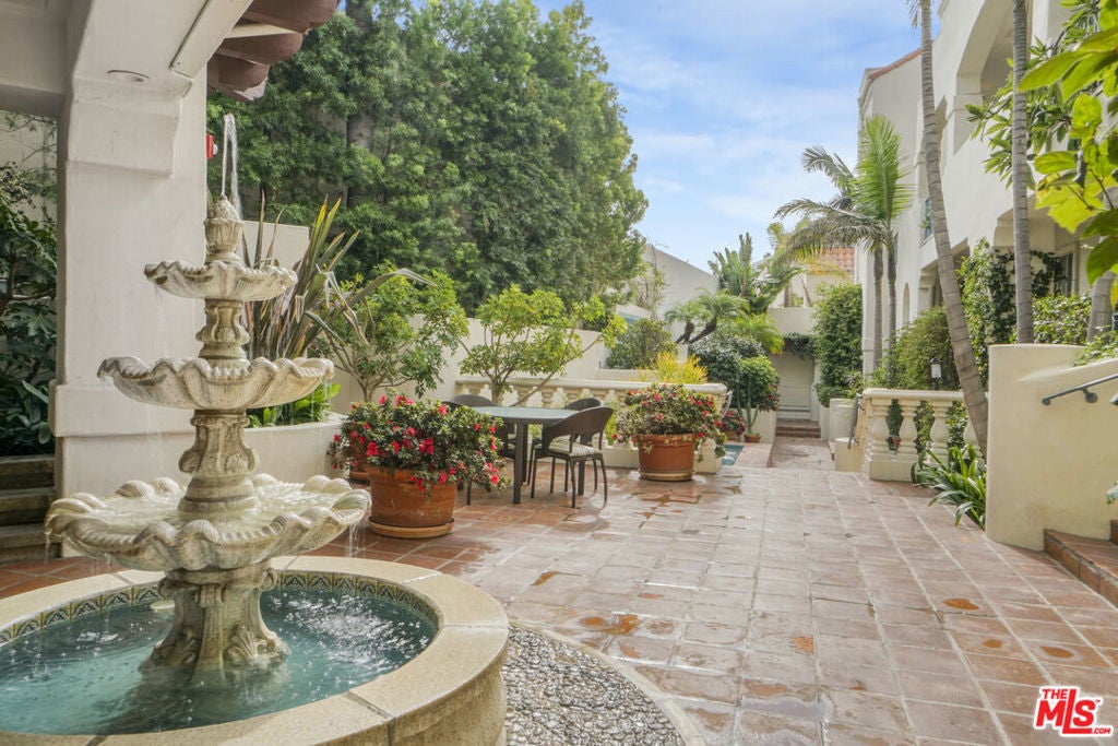 Hacienda-style elegance meets coastal luxury in the heart of Palisades Village. This stunning 2BD/2BA condo boasts soaring ceilings, graceful arched doors, and coved corners. At the heart of the home, the open-concept cook's kitchen flows seamlessly onto a large patio, creating an exceptional space for indoor-outdoor dining and entertaining. Relax in the sun-drenched, expansive living room, anchored by a cozy fireplace and Mediterranean tile pavers, or in the versatile Family Room - a contemporary media hub and office suite without the clutter. A stunning custom wall integrates bookshelves, feature shelving, a large-screen TV, and a desk structure, while office hardware is concealed behind bespoke white cabinetry. The master suite is a private sanctuary featuring a romantic fireplace, a sitting area, and a large walk-in closet. French doors open to a large private balcony, while the luxurious master bath has a walk-in spa featuring dual shower heads and integrated stone bench seating. His-and-her linear suite has an oversized stone countertop and a continuous mirrored backdrop for a complete boutique spa experience. A discreet, private water closet features both a toilet and bidet. A totally separate second bedroom has French doors opening to a balcony and a full bath, ensuring ultimate privacy for guests, or additional work-from-home flexibility with a second professional office or creative studio. Enjoy the complex's exceptional Zen-like courtyard with two designer fountains and abundant landscaping, just steps from Caruso Village shops, fine dining, and Temescal Canyon trails. Includes in-unit laundry, extra storage, and two side-by-side gated parking spots. Only one mile to the beach in a premier school district. This is five-star living at its finest.