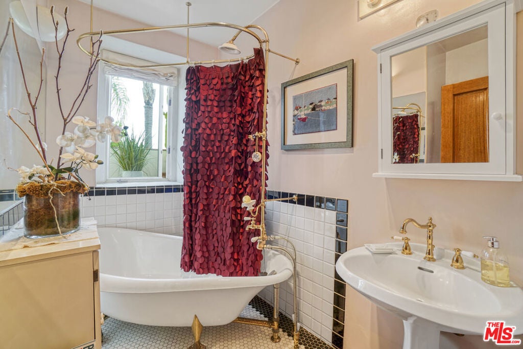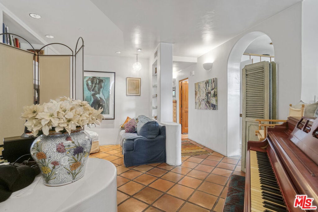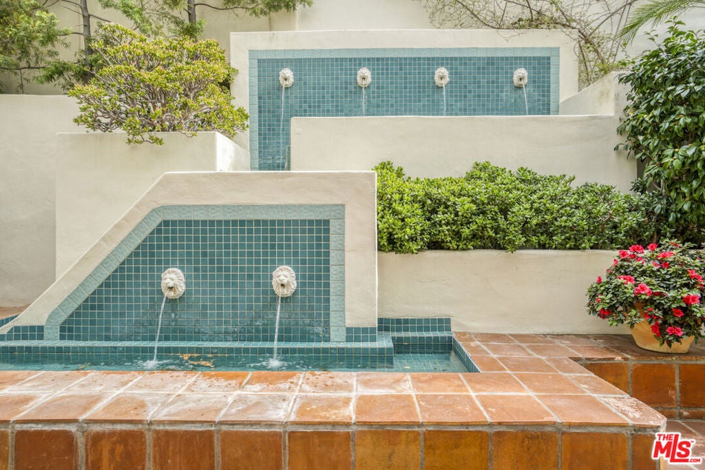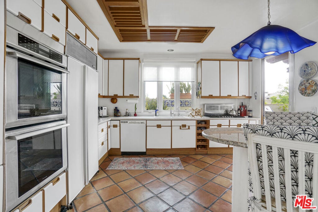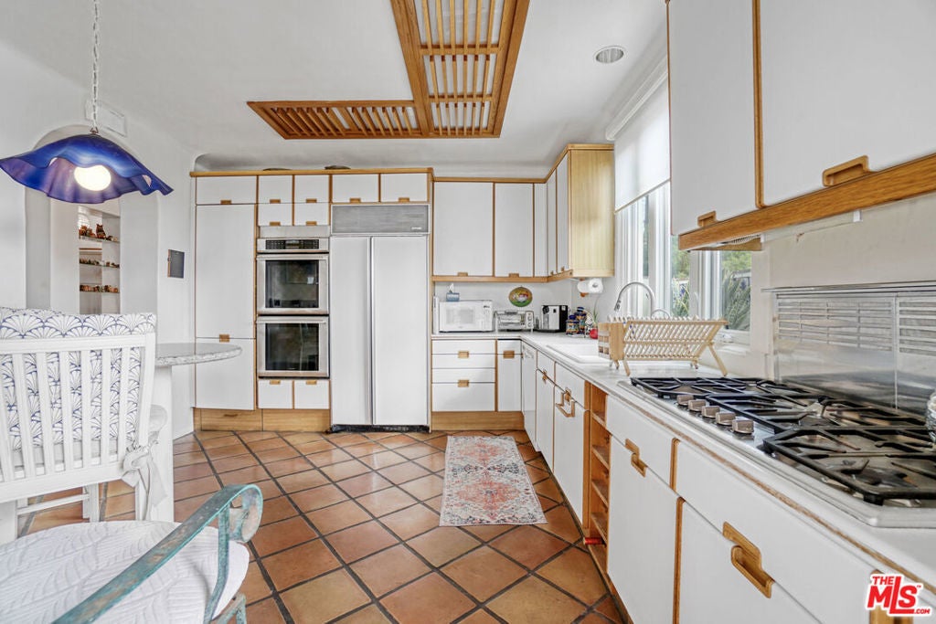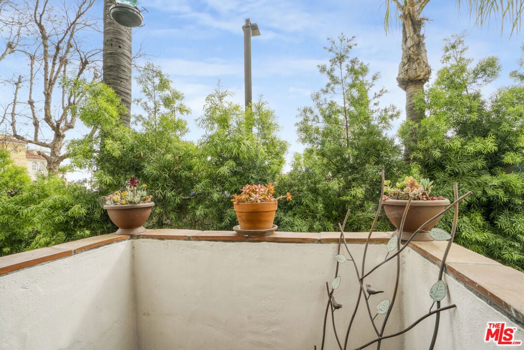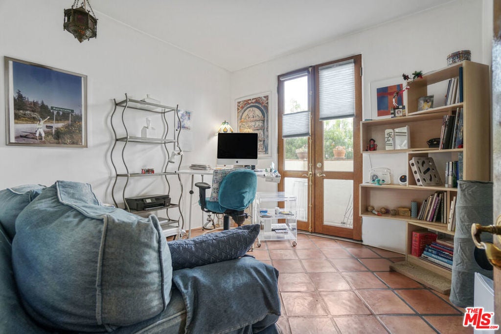 Hacienda-style elegance meets coastal luxury in the heart of Palisades Village. This stunning 2BD/2BA condo boasts soaring ceilings, graceful arched doors, and coved corners. At the heart of the home, the open-concept cook's kitchen flows seamlessly onto a large patio, creating an exceptional space for indoor-outdoor dining and entertaining. Relax in the sun-drenched, expansive living room, anchored by a cozy fireplace and Mediterranean tile pavers, or in the versatile Family Room - a contemporary media hub and office suite without the clutter. A stunning custom wall integrates bookshelves, feature shelving, a large-screen TV, and a desk structure, while office hardware is concealed behind bespoke white cabinetry. The master suite is a private sanctuary featuring a romantic fireplace, a sitting area, and a large walk-in closet. French doors open to a large private balcony, while the luxurious master bath has a walk-in spa featuring dual shower heads and integrated stone bench seating. His-and-her linear suite has an oversized stone countertop and a continuous mirrored backdrop for a complete boutique spa experience. A discreet, private water closet features both a toilet and bidet. A totally separate second bedroom has French doors opening to a balcony and a full bath, ensuring ultimate privacy for guests, or additional work-from-home flexibility with a second professional office or creative studio. Enjoy the complex's exceptional Zen-like courtyard with two designer fountains and abundant landscaping, just steps from Caruso Village shops, fine dining, and Temescal Canyon trails. Includes in-unit laundry, extra storage, and two side-by-side gated parking spots. Only one mile to the beach in a premier school district. This is five-star living at its finest.