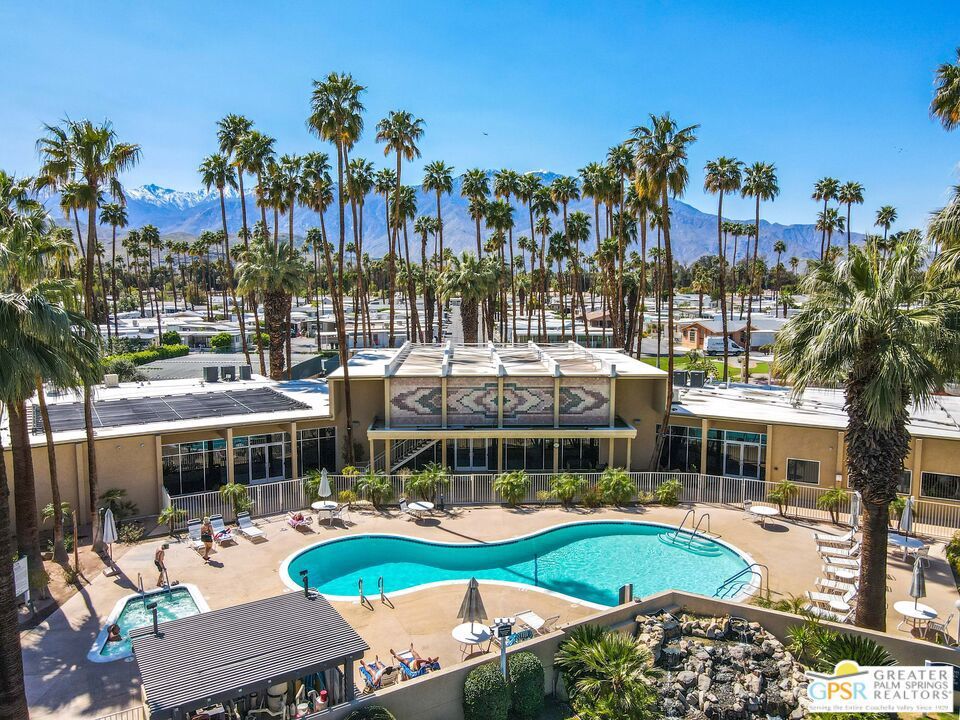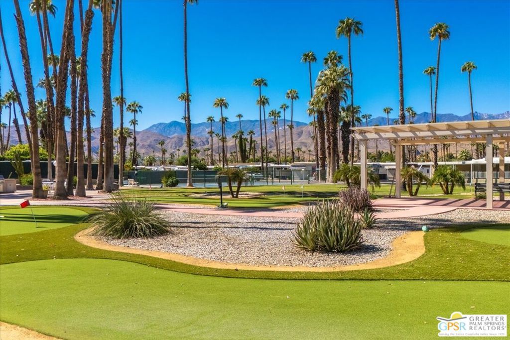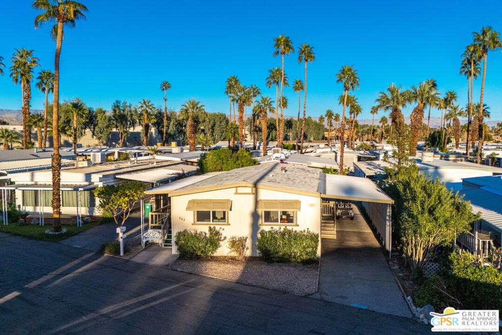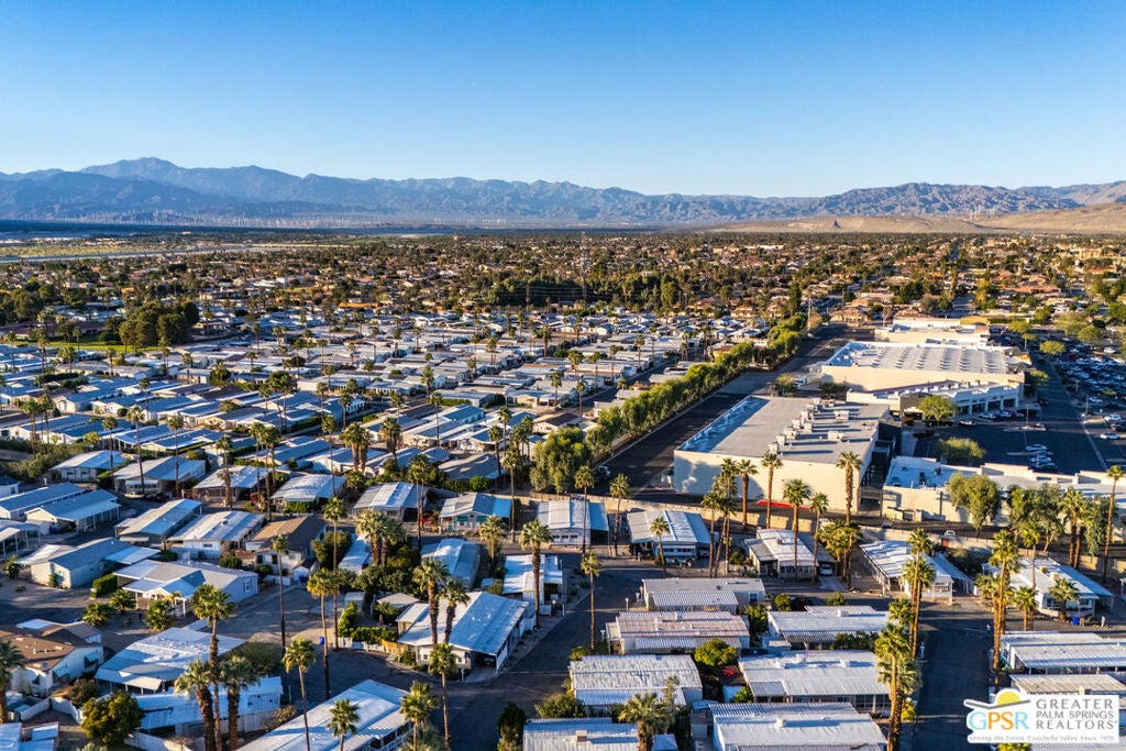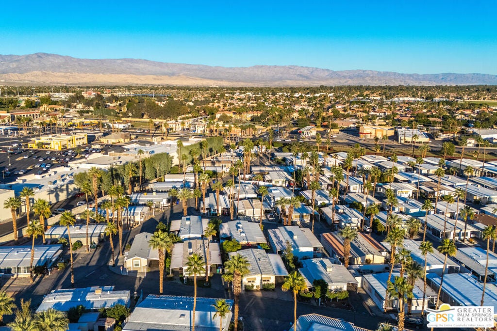 This 2-bedroom, 2-bathroom home with a mid-century vibe offers 1,248 square feet of comfortable desert living at an exceptional value. With large new west facing windows that fill the home with bright natural light and showcase the views of the San Jacinto Mountains. The home features new flooring throughout, a new HVAC system, and fresh paint. The covered front porch is perfect for relaxing, and a new awning adds extra shade. Both bedrooms include walk-in closets, and the primary bedroom features French doors that open to a private rear yard. Outside, you'll find a quaint garden area that's easy to enjoy and maintain. This home is move-in ready and ideal for anyone looking for a place to vacation or retire. Royal Palms is a vibrant 55+ gated community with resort like amenities including Planned Activities, Bingo, Social Events, Clubhouse, Heated Swimming Pool & Hot Tub, Fitness Center, Sauna, Putting Green, Miniature Golf, Pickleball, Bocce Ball, Billiards, Library, Dog Park, BBQ area, Laundry Facilities & much more! Centrally located in Cathedral City near public transportation, hiking trails, shopping, dining & entertainment venues and just minutes from the Palm Springs International Airport. Come see all this home and Royal Palms has to offer!