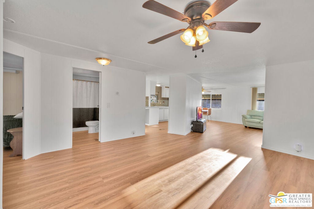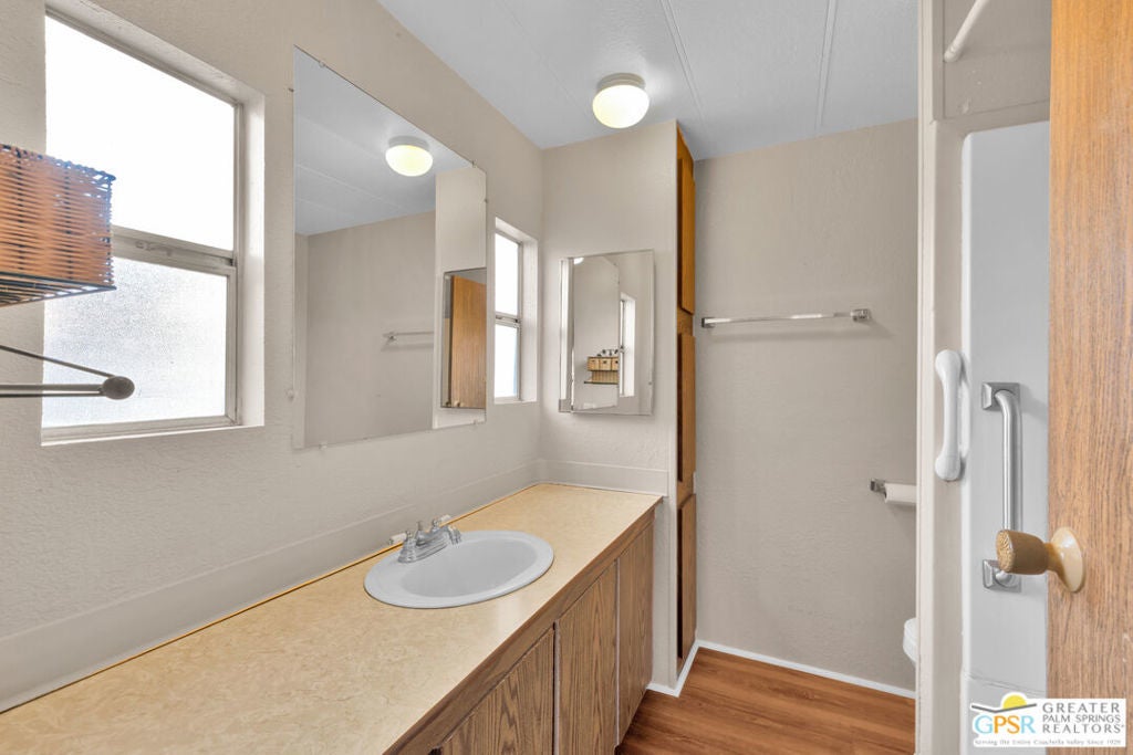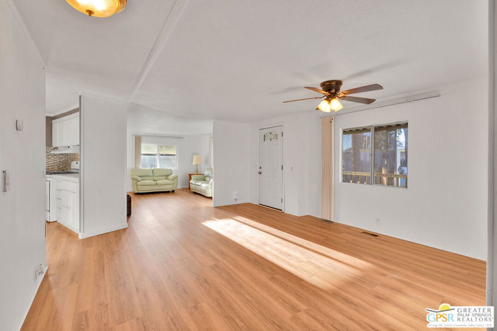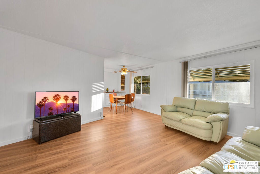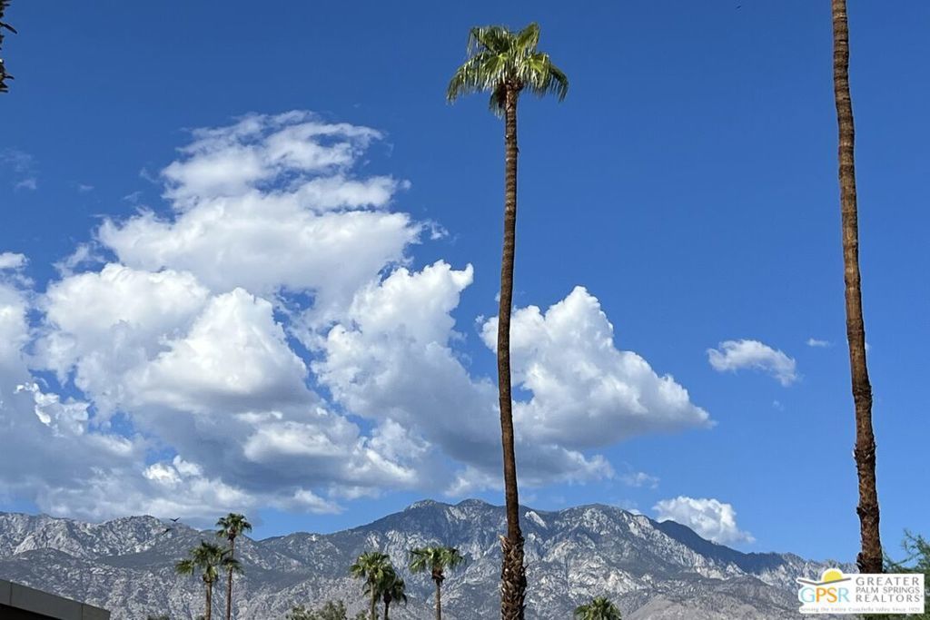 This 2-bedroom, 2-bathroom home with a mid-century vibe offers 1,248 square feet of comfortable desert living at an exceptional value. With large new west facing windows that fill the home with bright natural light and showcase the views of the San Jacinto Mountains. The home features new flooring throughout, a new HVAC system, and fresh paint. The covered front porch is perfect for relaxing, and a new awning adds extra shade. Both bedrooms include walk-in closets, and the primary bedroom features French doors that open to a private rear yard. Outside, you'll find a quaint garden area that's easy to enjoy and maintain. This home is move-in ready and ideal for anyone looking for a place to vacation or retire. Royal Palms is a vibrant 55+ gated community with resort like amenities including Planned Activities, Bingo, Social Events, Clubhouse, Heated Swimming Pool & Hot Tub, Fitness Center, Sauna, Putting Green, Miniature Golf, Pickleball, Bocce Ball, Billiards, Library, Dog Park, BBQ area, Laundry Facilities & much more! Centrally located in Cathedral City near public transportation, hiking trails, shopping, dining & entertainment venues and just minutes from the Palm Springs International Airport. Come see all this home and Royal Palms has to offer!