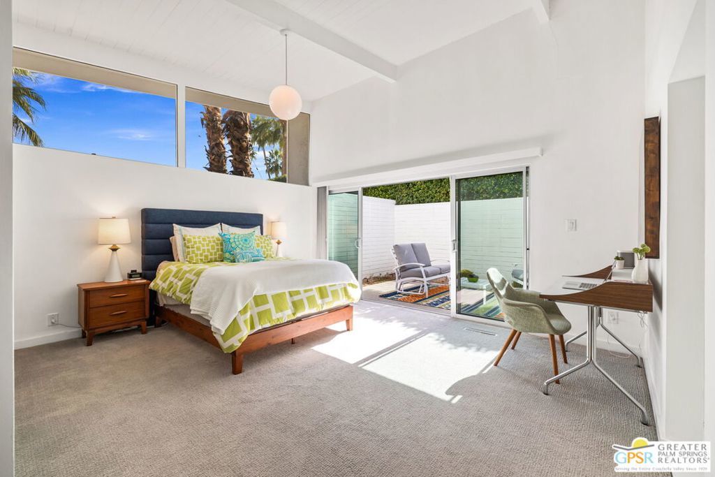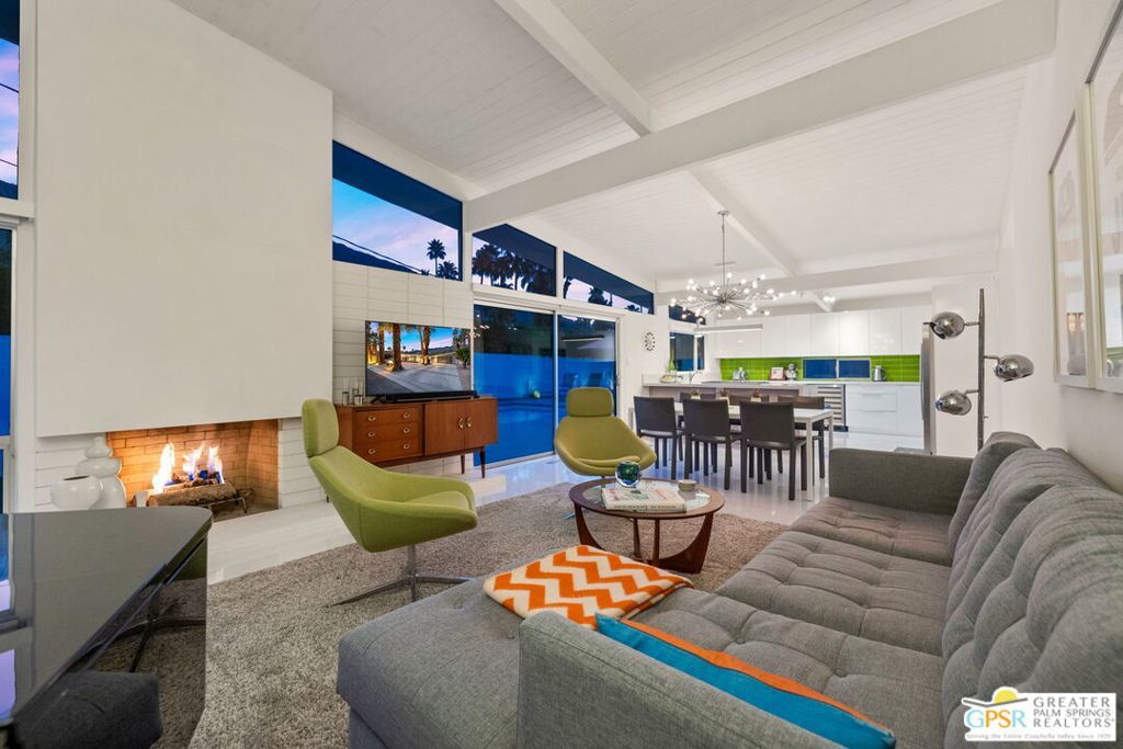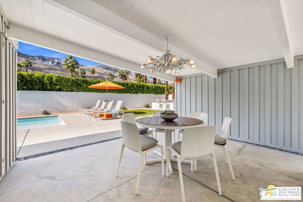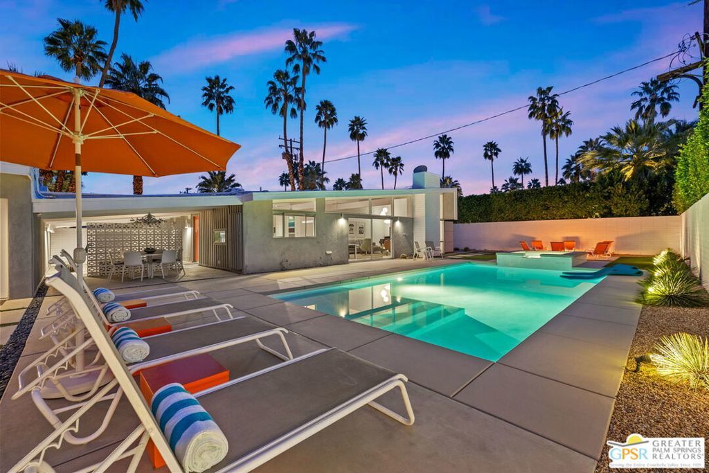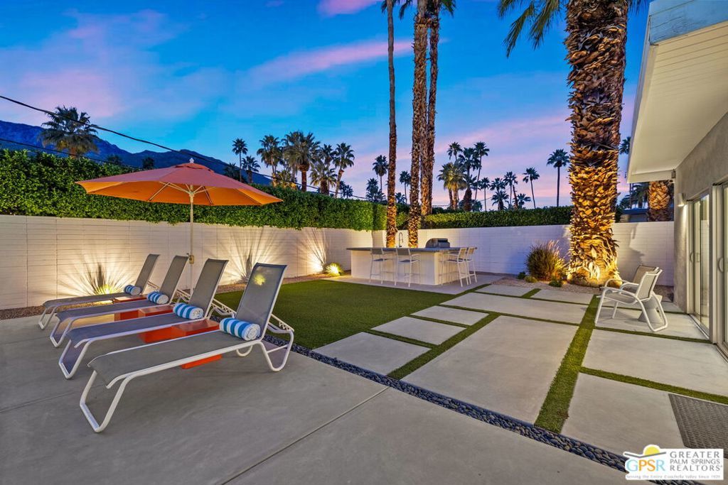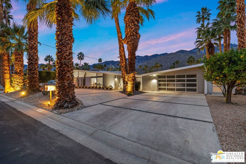 A rare convergence of architectural significance, exceptional condition, and prime location, this iconic William Krisel-designed, Alexander-built home is a standout offering in the highly coveted Twin Palms neighborhood of South Palm Springs. Defined by its classic butterfly roofline, this home embodies the very essence of timeless Palm Springs Mid-Century Modernism updated with modern-day comfort and conveniences. As Krisel intended, the home features a thoughtfully designed and open floor plan, expansive clerestory windows capturing stunning, west-facing, mountain views and filling the home with natural light, tongue and groove ceilings throughout, and a gas fireplace. This residence exudes pride of ownership, thoughtfully renovated with a deep respect for the home's original design while adding refined, contemporary updates such as porcelain tile flooring, built-in closet cabinetry, renovated bathrooms, and a modernized kitchen featuring custom cabinetry, stainless steel Bosch appliances, a built-in wine refrigerator, quartz countertops, and custom back splash with undercabinet pass thru to the covered outdoor dining area. In addition to the main house, a detached casita offers the flexibility of a spacious fourth bedroom which provides privacy and serenity for guests or acts as a detached workspace or retreat. The enclosed, secluded and secure backyard provides a resort-style sanctuary with an elevated spa spilling into the pool (replastered 2025), water feature, breeze brick wall, gas firepit, outdoor shower, built-in BBQ with counter and sink, private patio off the primary suite, and a combination of lush succulent landscaping and astroturf, all designed for effortless, conservation-friendly, desert living. Additional features include owned solar panels with Tesla Powerwall (home battery), upgraded electrical panel, new foam roof insulation (2018), Ring security system, four outdoor cameras, and covered garage. Exceptional curb appeal with a half-moon driveway on one of the neighborhood's most beautiful streets. This is a rare opportunity to own a true architectural gem and updated classic. A home that effortlessly balances history, design, comfort, and lifestyle resulting in something that is truly timeless, refined, and unmistakably Palm Springs.
