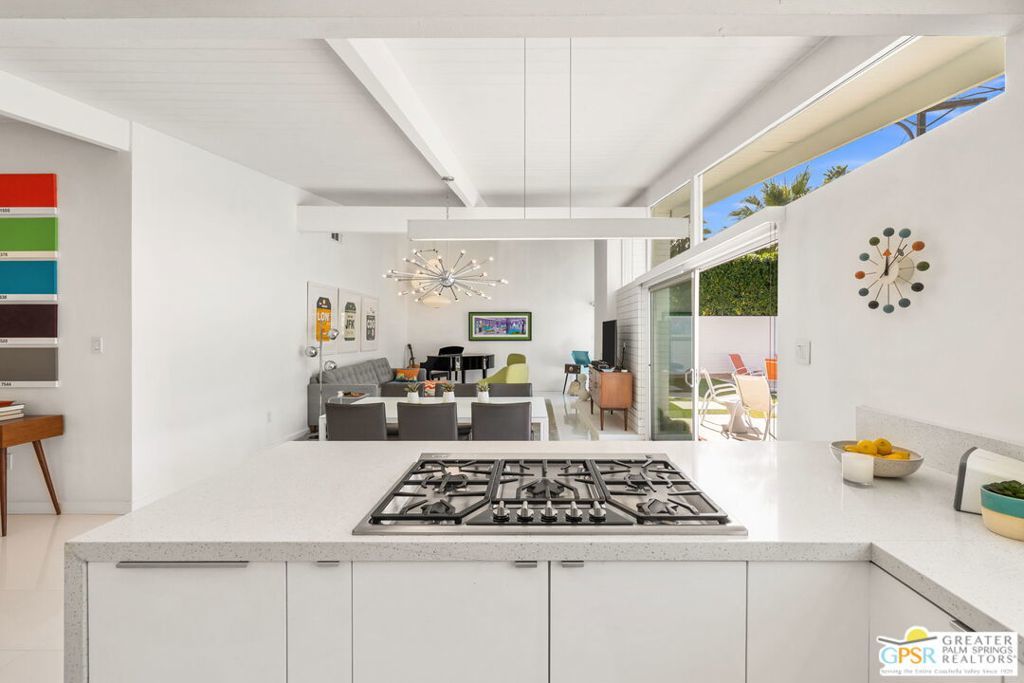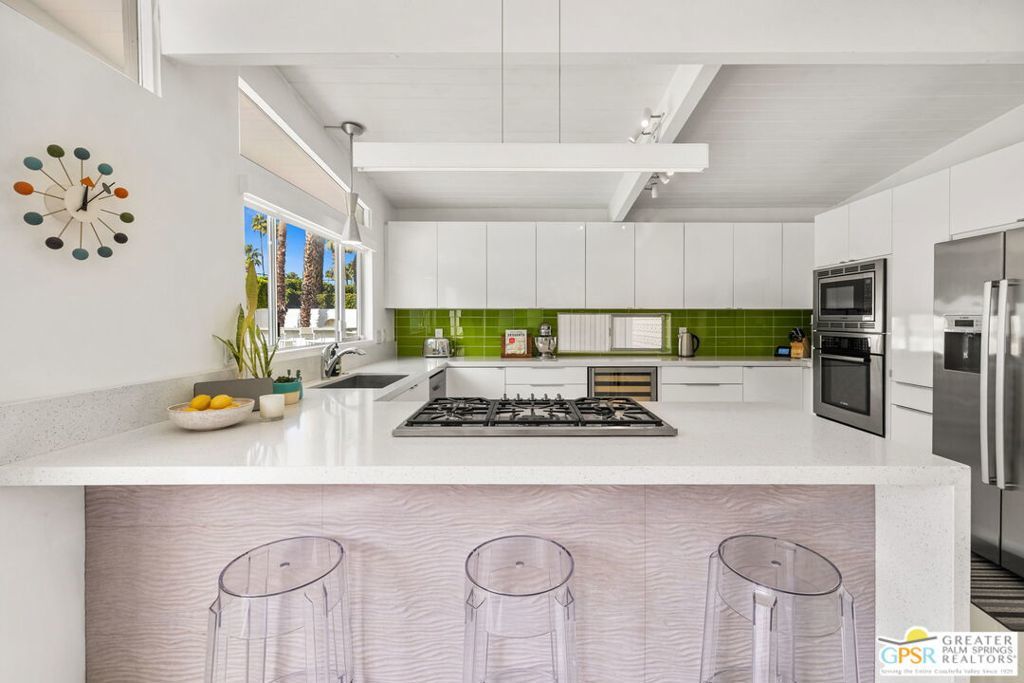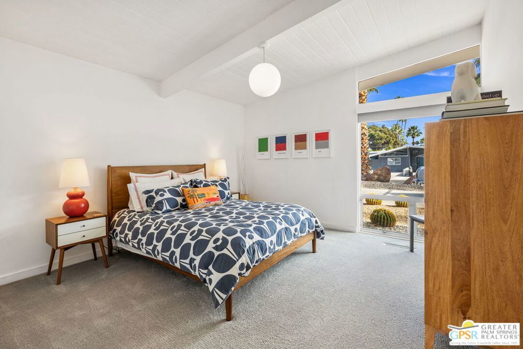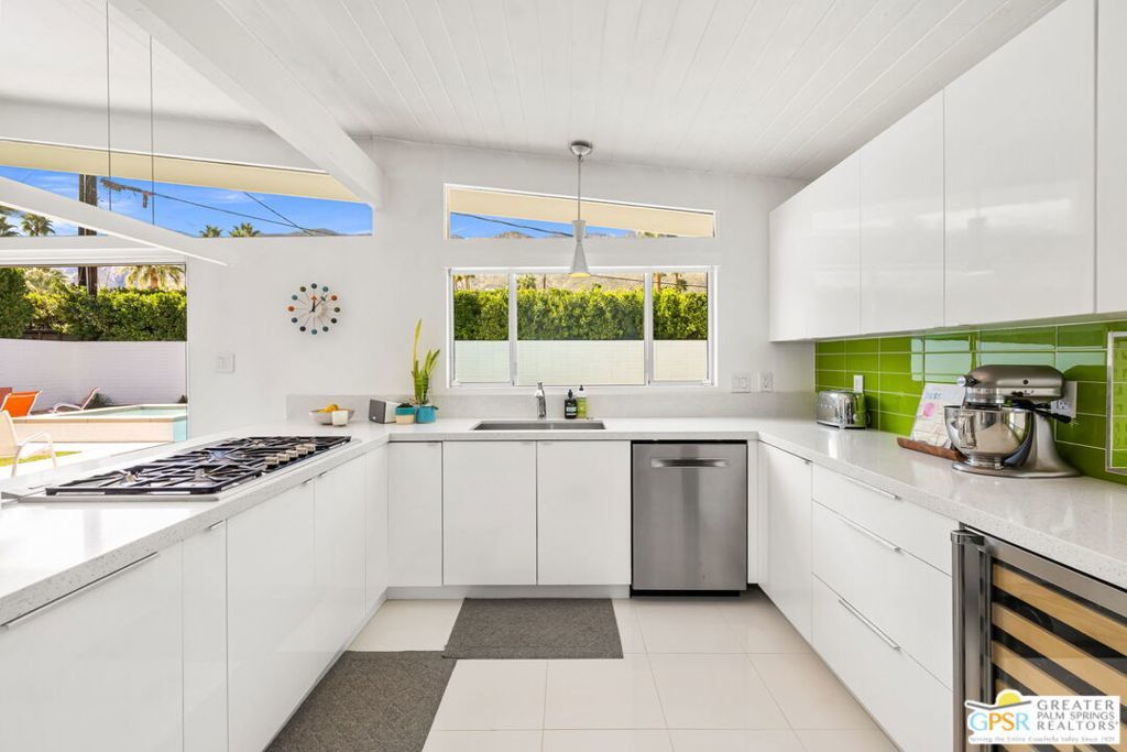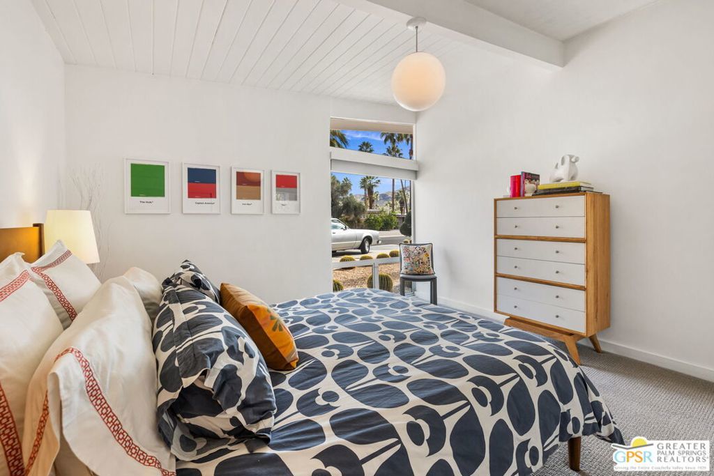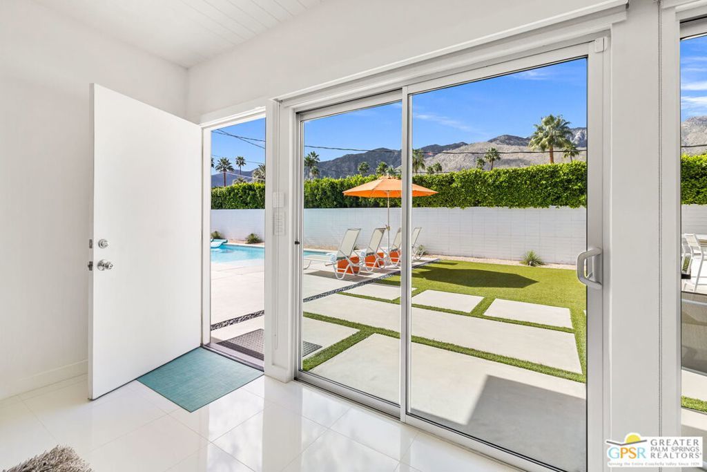 A rare convergence of architectural significance, exceptional condition, and prime location, this iconic William Krisel-designed, Alexander-built home is a standout offering in the highly coveted Twin Palms neighborhood of South Palm Springs. Defined by its classic butterfly roofline, this home embodies the very essence of timeless Palm Springs Mid-Century Modernism updated with modern-day comfort and conveniences. As Krisel intended, the home features a thoughtfully designed and open floor plan, expansive clerestory windows capturing stunning, west-facing, mountain views and filling the home with natural light, tongue and groove ceilings throughout, and a gas fireplace. This residence exudes pride of ownership, thoughtfully renovated with a deep respect for the home's original design while adding refined, contemporary updates such as porcelain tile flooring, built-in closet cabinetry, renovated bathrooms, and a modernized kitchen featuring custom cabinetry, stainless steel Bosch appliances, a built-in wine refrigerator, quartz countertops, and custom back splash with undercabinet pass thru to the covered outdoor dining area. In addition to the main house, a detached casita offers the flexibility of a spacious fourth bedroom which provides privacy and serenity for guests or acts as a detached workspace or retreat. The enclosed, secluded and secure backyard provides a resort-style sanctuary with an elevated spa spilling into the pool (replastered 2025), water feature, breeze brick wall, gas firepit, outdoor shower, built-in BBQ with counter and sink, private patio off the primary suite, and a combination of lush succulent landscaping and astroturf, all designed for effortless, conservation-friendly, desert living. Additional features include owned solar panels with Tesla Powerwall (home battery), upgraded electrical panel, new foam roof insulation (2018), Ring security system, four outdoor cameras, and covered garage. Exceptional curb appeal with a half-moon driveway on one of the neighborhood's most beautiful streets. This is a rare opportunity to own a true architectural gem and updated classic. A home that effortlessly balances history, design, comfort, and lifestyle resulting in something that is truly timeless, refined, and unmistakably Palm Springs.