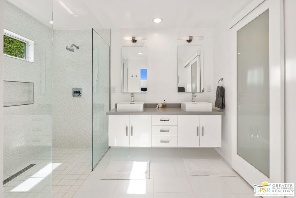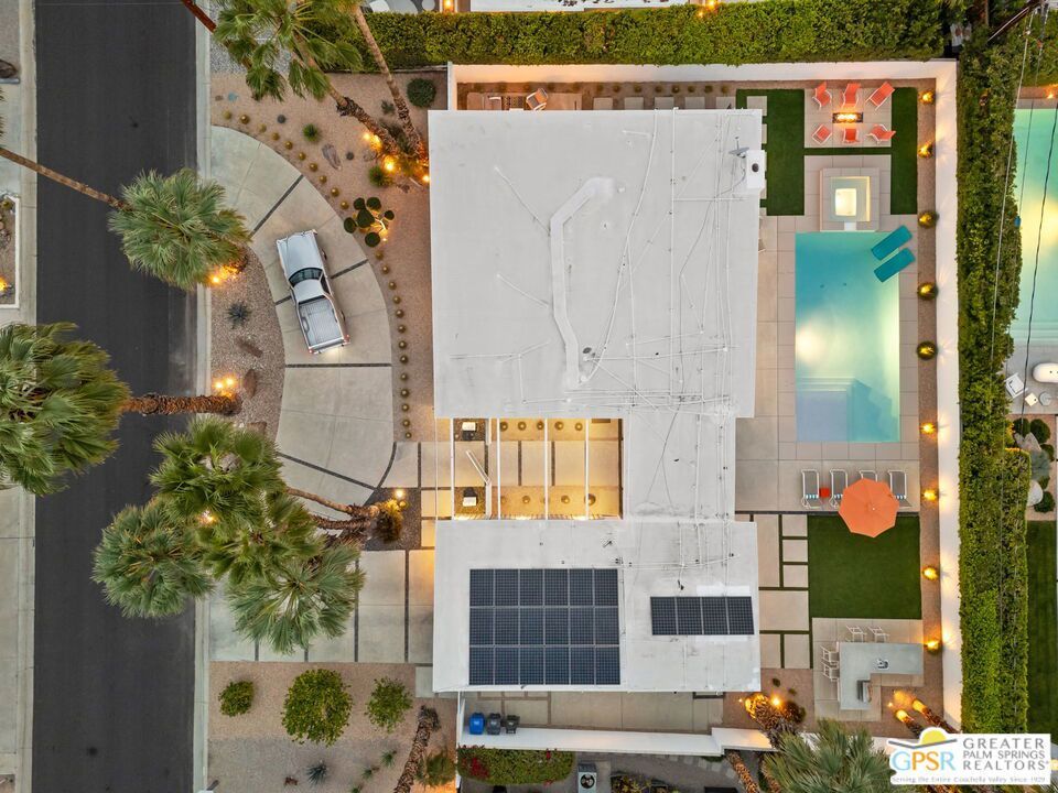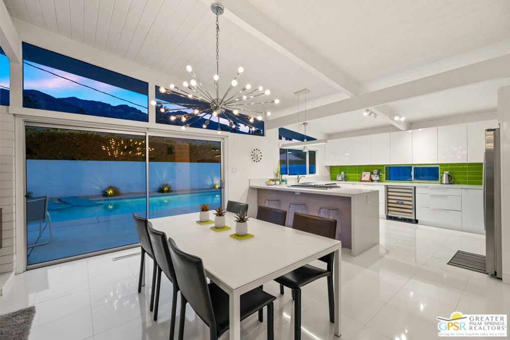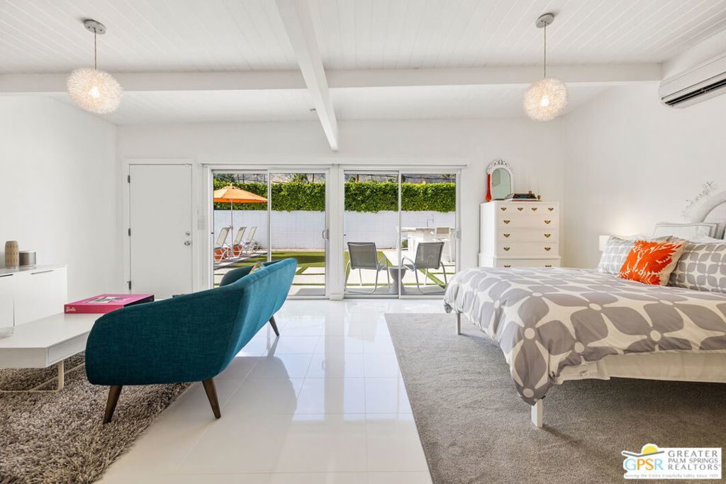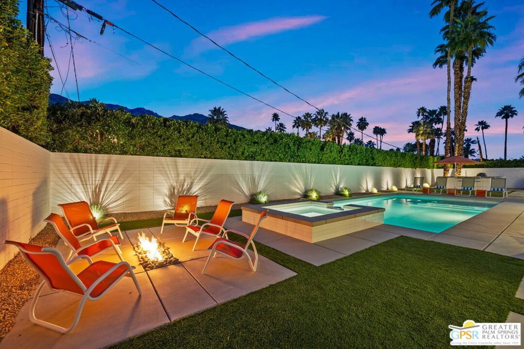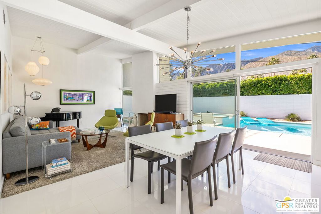 A rare convergence of architectural significance, exceptional condition, and prime location, this iconic William Krisel-designed, Alexander-built home is a standout offering in the highly coveted Twin Palms neighborhood of South Palm Springs. Defined by its classic butterfly roofline, this home embodies the very essence of timeless Palm Springs Mid-Century Modernism updated with modern-day comfort and conveniences. As Krisel intended, the home features a thoughtfully designed and open floor plan, expansive clerestory windows capturing stunning, west-facing, mountain views and filling the home with natural light, tongue and groove ceilings throughout, and a gas fireplace. This residence exudes pride of ownership, thoughtfully renovated with a deep respect for the home's original design while adding refined, contemporary updates such as porcelain tile flooring, built-in closet cabinetry, renovated bathrooms, and a modernized kitchen featuring custom cabinetry, stainless steel Bosch appliances, a built-in wine refrigerator, quartz countertops, and custom back splash with undercabinet pass thru to the covered outdoor dining area. In addition to the main house, a detached casita offers the flexibility of a spacious fourth bedroom which provides privacy and serenity for guests or acts as a detached workspace or retreat. The enclosed, secluded and secure backyard provides a resort-style sanctuary with an elevated spa spilling into the pool (replastered 2025), water feature, breeze brick wall, gas firepit, outdoor shower, built-in BBQ with counter and sink, private patio off the primary suite, and a combination of lush succulent landscaping and astroturf, all designed for effortless, conservation-friendly, desert living. Additional features include owned solar panels with Tesla Powerwall (home battery), upgraded electrical panel, new foam roof insulation (2018), Ring security system, four outdoor cameras, and covered garage. Exceptional curb appeal with a half-moon driveway on one of the neighborhood's most beautiful streets. This is a rare opportunity to own a true architectural gem and updated classic. A home that effortlessly balances history, design, comfort, and lifestyle resulting in something that is truly timeless, refined, and unmistakably Palm Springs.