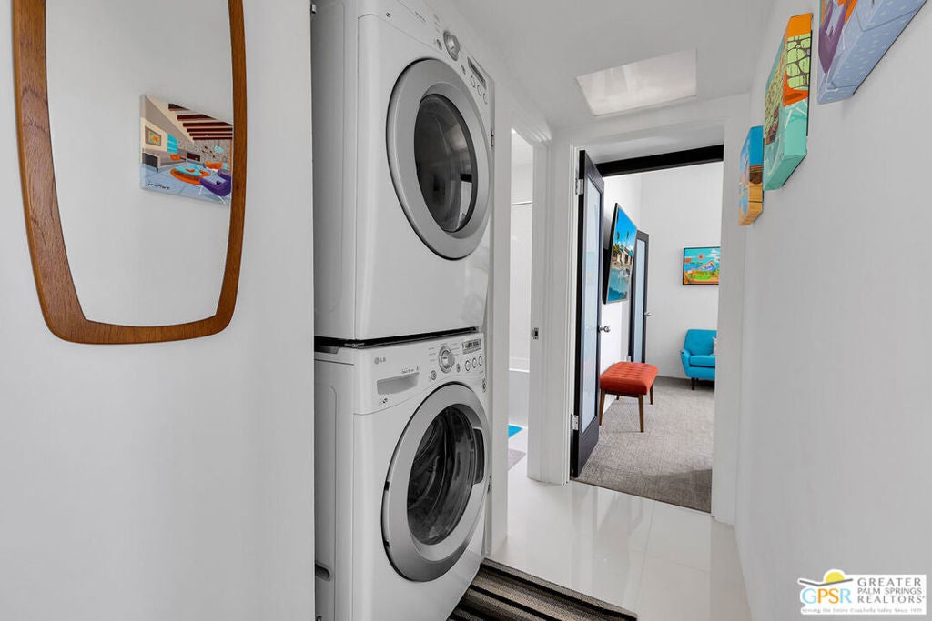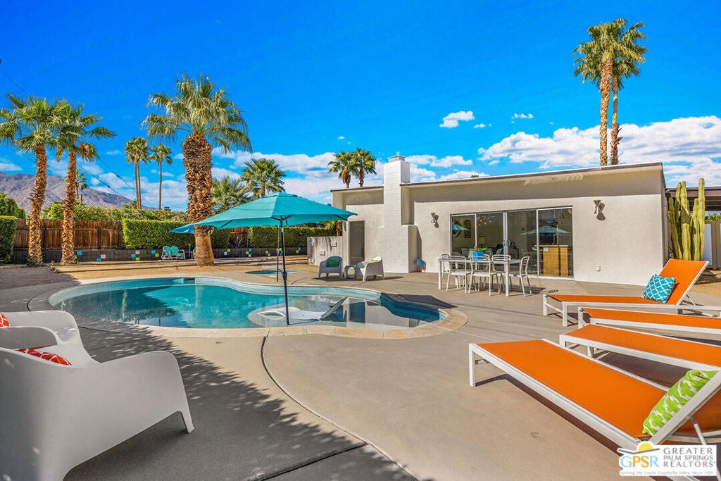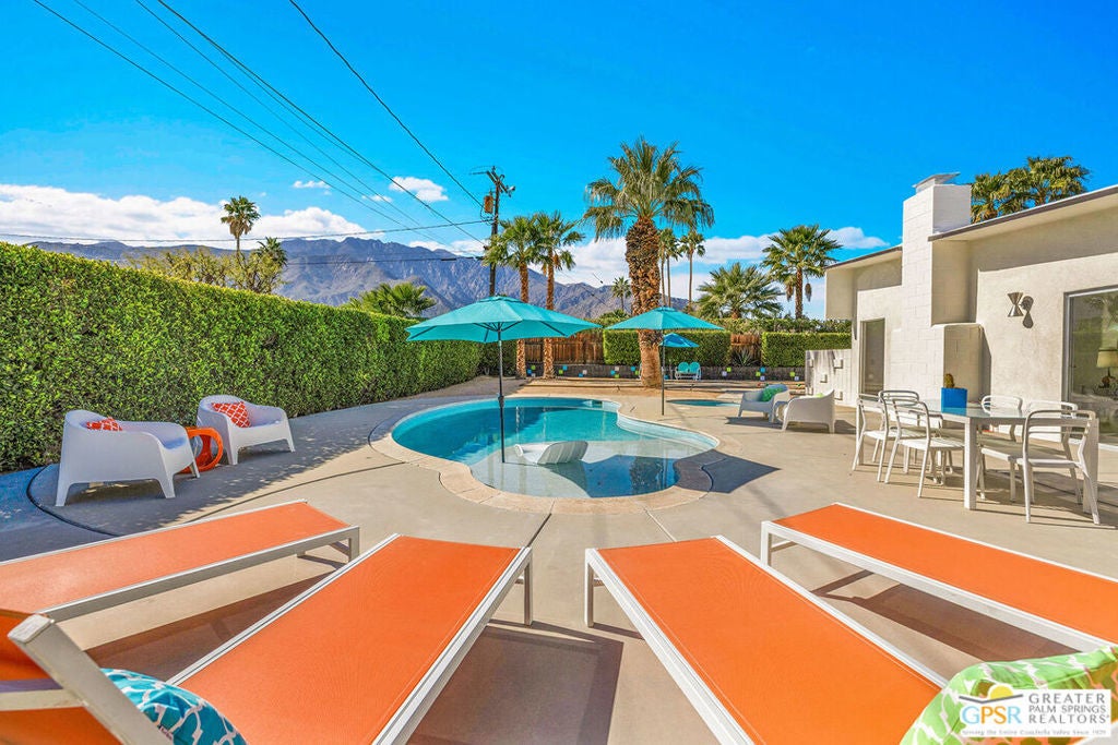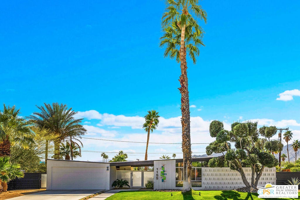 Believed to be one of the last Alexander-built butterfly roof homes constructed in Racquet Club Estates in 1962, this impeccably restored mid-century modern residence is a rare Palm Springs offering. Set on one of the largest lots in the neighborhood and enjoying coveted full southern exposure, the home delivers an exceptional modern desert lifestyle. Originally designed by Palmer & Krisel in the late 1950s, the iconic floor plan has been thoughtfully restored to honor its post-and-beam architecture, soaring clerestory windows, and clean modern lineswhile seamlessly adapting to today's living standards. The residence offers three bedrooms and two spa-inspired baths, complemented by a sleek European-style kitchen with quartz countertops and stainless steel appliances. Polished white porcelain floors and a striking block wall fireplace complete the refined interior aesthetic. Outdoors, the property truly shines. A sprawling resort-style pool and in-ground spa anchor the expansive grounds, joined by a bocce ball court, gazebo with fire pit, and meticulously designed desert landscaping. Wraparound mountain views and effortless indoor-outdoor flow create a setting ideal for both everyday living and entertaining. Recent upgrades include a newly coated foam roof, updated plumbing, refreshed pool systems, an on-demand water heater, and dual-pane windows throughout. Rare, iconic, and impeccably maintained, this is a home that must be experienced in person to be fully appreciated. Contact the listing agent to arrange a private showing.