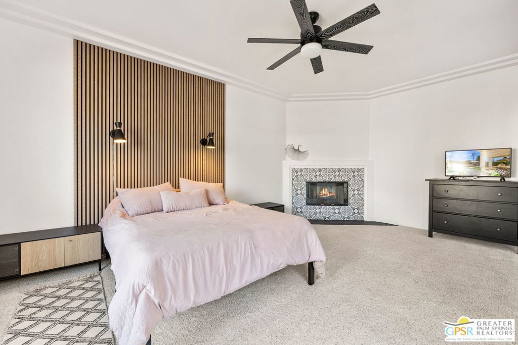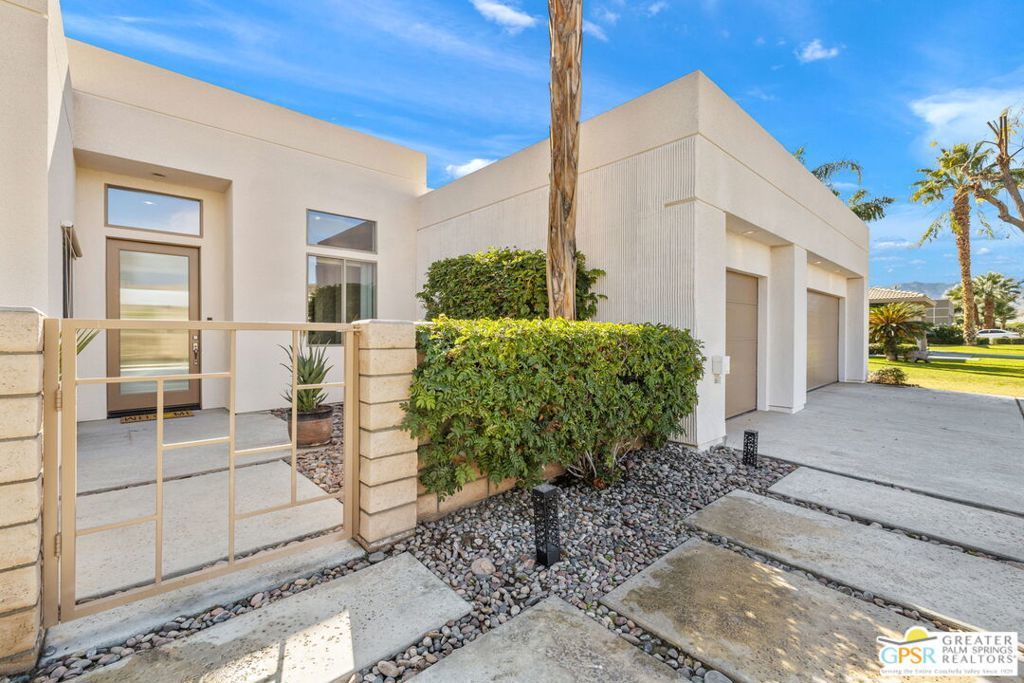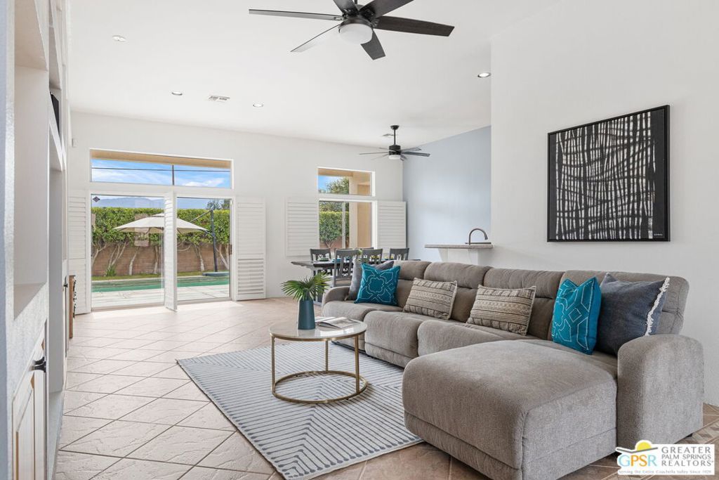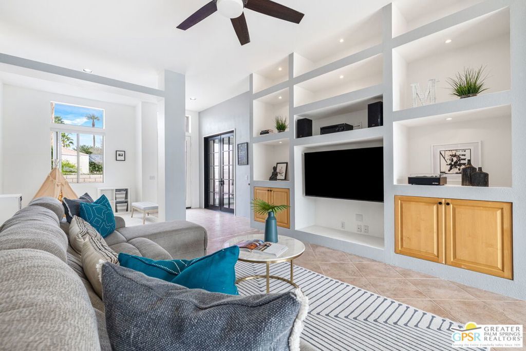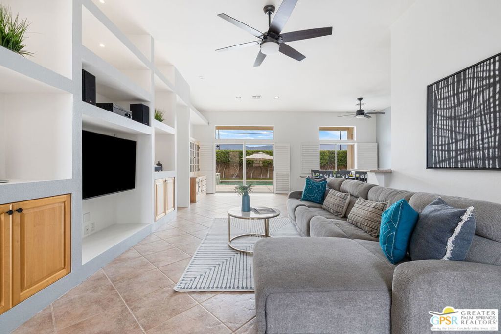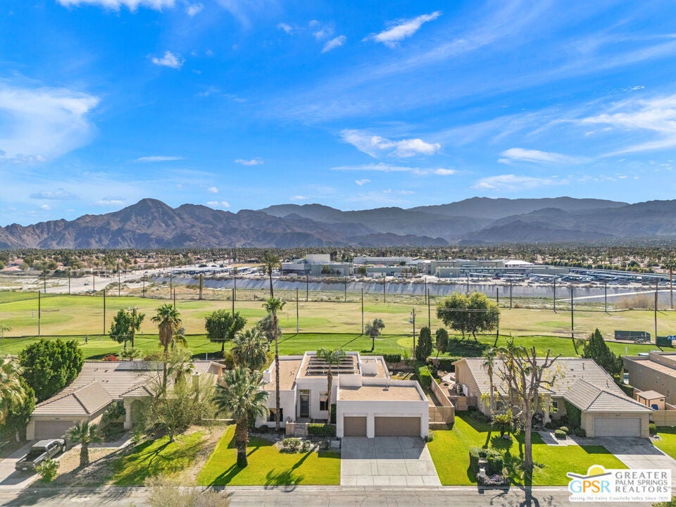 Positioned to capture breathtaking mountain views to the south and west, this contemporary Palm Desert residence features a thoughtful layout with strong sightlines to the pool and surrounding mountains. A courtyard entry opens to a light-filled, open-concept living room framed by clerestory windows and striking floor-to-ceiling built-ins, perfect for entertaining and everyday living, while the pool and mountains are visible from the main spaces with the option to expand sightlines by selectively lowering the hedge. The kitchen flows seamlessly to a breakfast area and flexible dining space, while bedrooms are well separated for privacy, including a primary suite that opens to the pool and spa with mountain views, dual vanities, and a walk-in closet, and guest bedrooms that share an updated bath on the opposite wing. A bonus family room with a fireplace near the front of the home is currently used as a fourth bedroom. Outdoors, a covered entertaining area includes a built-in barbecue, bar sink, refrigerator, and burner, complemented by RV parking behind a large side gate, a three-car garage with finished floors and built-in cabinetry, rooftop solar, and a newer 2023 HVAC system, all on fee simple land. Centrally located near the best of Palm Desert and Indian Wells with The Golf Center at Palm Desert next door and CV Link nearby for cyclists, this home offers privacy, flexibility, and stunning desert views.