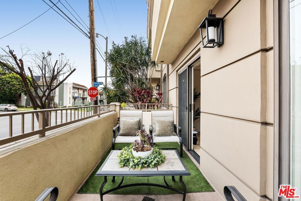 Ideally situated in the heart of Brentwood, just moments from the renowned shops, cafes, and restaurants along San Vicente Boulevard, this exceptional first-floor residence offers a rare combination of privacy, convenience, and indoor-outdoor living. Set within an intimate, secure 8-unit building, the home delivers the ease of condominium living with the comfort and feel of a single-family residence. The 2-bedroom, 2.5-bath home is uniquely distinguished as the only unit in the building with multiple private outdoor spaces. A charming side patio with street views, a front balcony, and an additional side outdoor area create an expansive and versatile setting that is ideal for entertaining, relaxing, or enjoying Brentwood's year-round sunshine. Inside, travertine flooring flows through the main living areas and is complemented by recessed lighting and plantation shutters, creating a refined yet welcoming ambiance. The open-concept living and dining areas offer seamless flow for both everyday living and hosting guests. The well-appointed kitchen features a Viking 6-burner range with double oven and stainless steel appliances, including a refrigerator, dishwasher, and microwave. A thoughtfully placed built-in desk area just across from the kitchen provides a convenient workspace for working from home or managing daily tasks. Both bedrooms are generously sized, with the primary suite offering an en-suite bath. The guest bathroom features a steam shower and sleek LED mirror for a spa-like experience, while a separate powder room adds convenience for guests. Additional highlights include in-unit laundry, secure building access, and two assigned side-by-side parking spaces in gated community parking. With its premier Brentwood location, low HOA fees, and rare private outdoor living, this residence presents a unique opportunity to enjoy West Los Angeles living at its finest, where walkability, comfort, and style come together seamlessly.