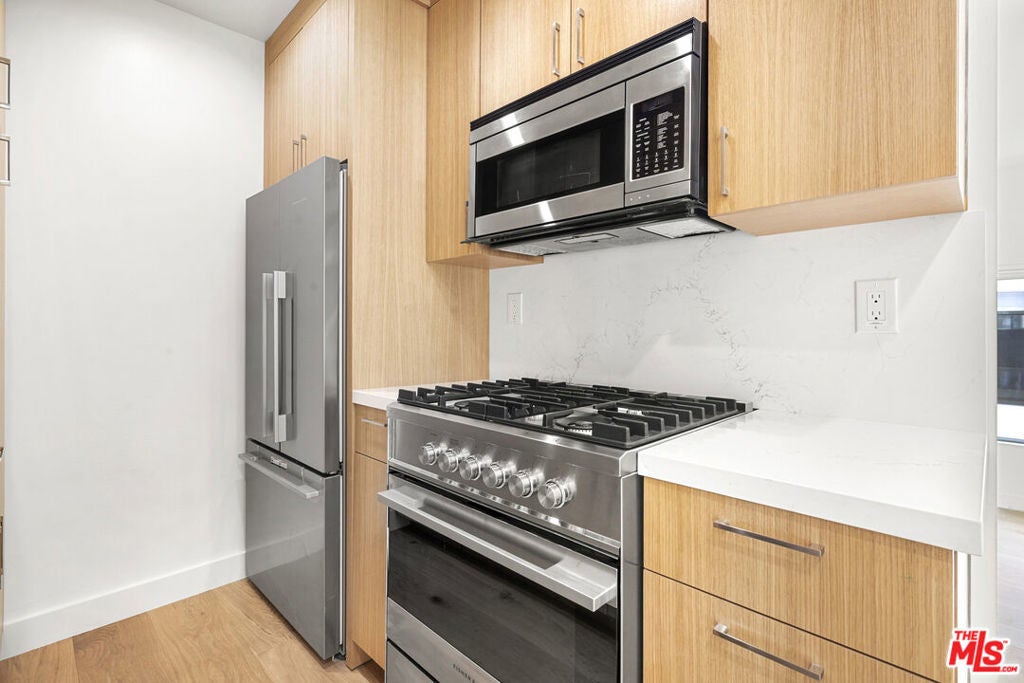 Meticulously remodeled Top floor condo in coveted pedestrian friendly Santa Monica, 1/2 Bock South of Montana Ave. No detail is overlooked!This impeccable modern residence offers 1 spacious bedroom and 1 bathroom with a carefully thought out open floor plan that is smart home ready and pre-wired for network cabling! The living room is drenched in natural sunlight with white oak hardwood floors that opens up to a chefs kitchen with brand new quartz countertops, high end stainless steel appliances, kitchen faucet and soft close oak custom cabinetry. Other features include custom window treatments a multi-zoned A/C cooling system,newly installed recessed lighting, fully built out bedroom closet, in unit laundry, tons of storage space and 1 covered parking space. One of the owners has a valid CA Real Estate license, Buyer to cooperate with sellers 1031 tax deferred exchange at no additional cost to buyer.