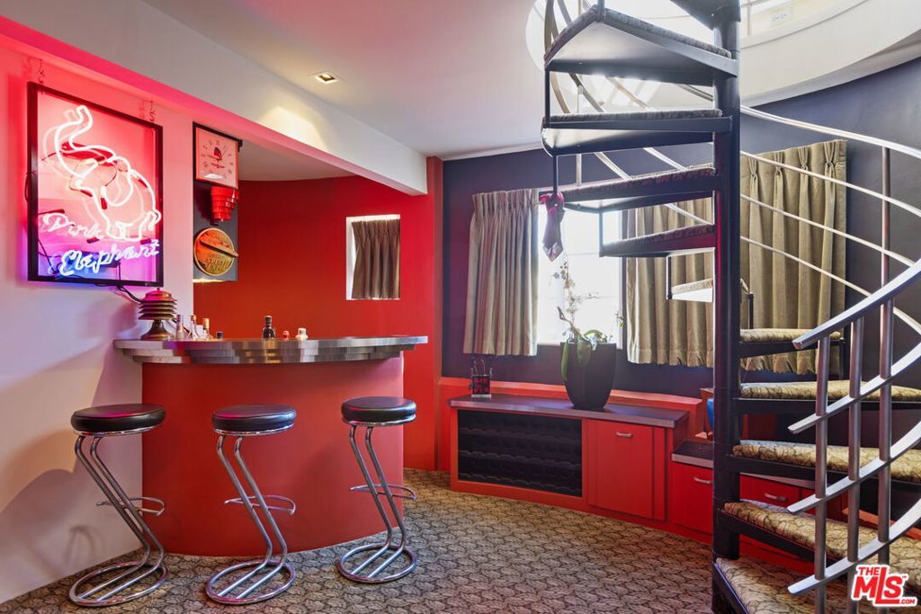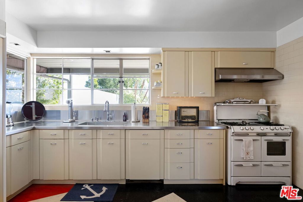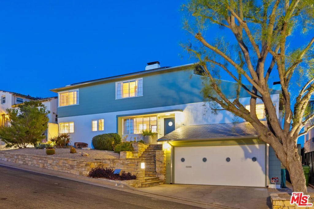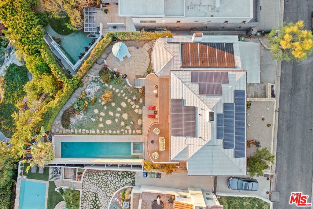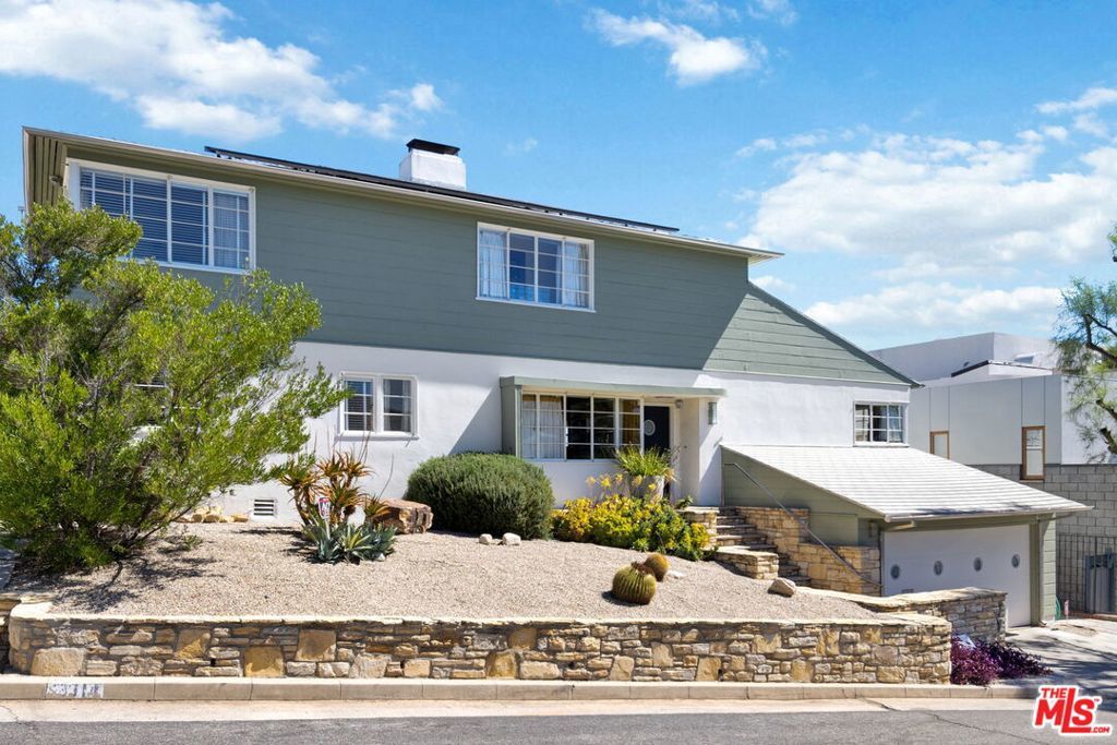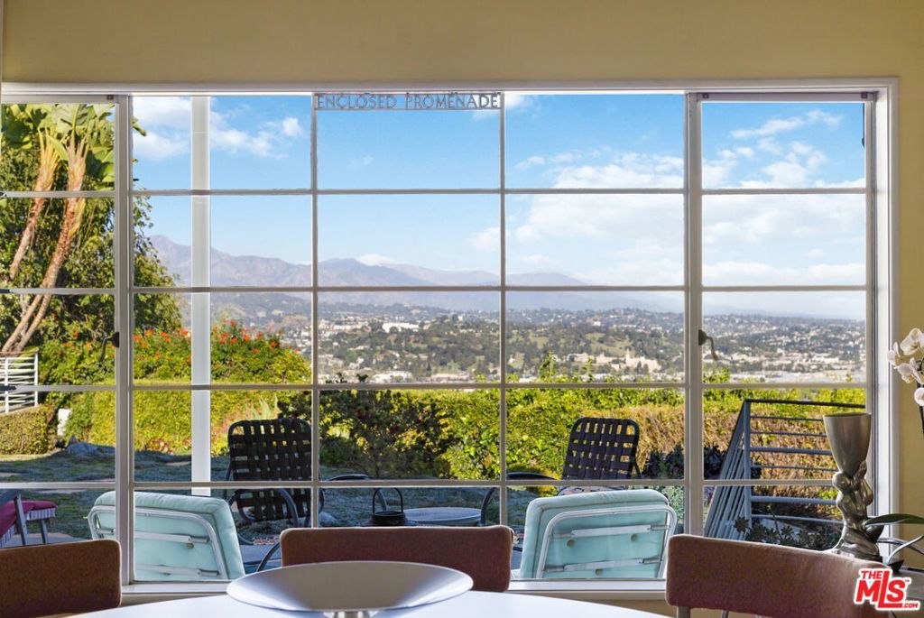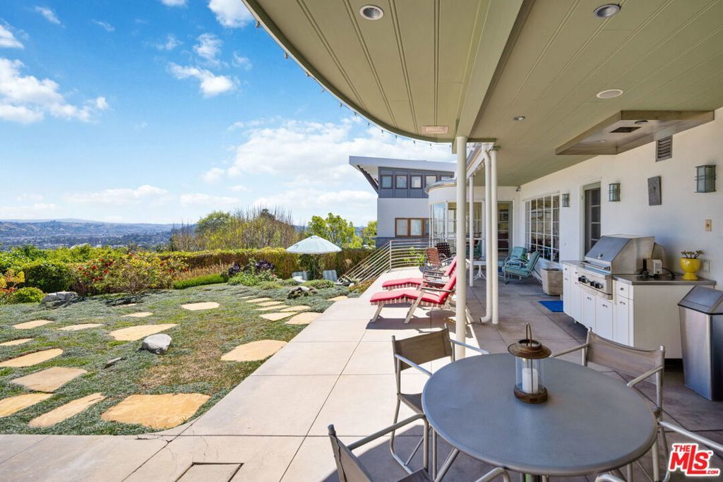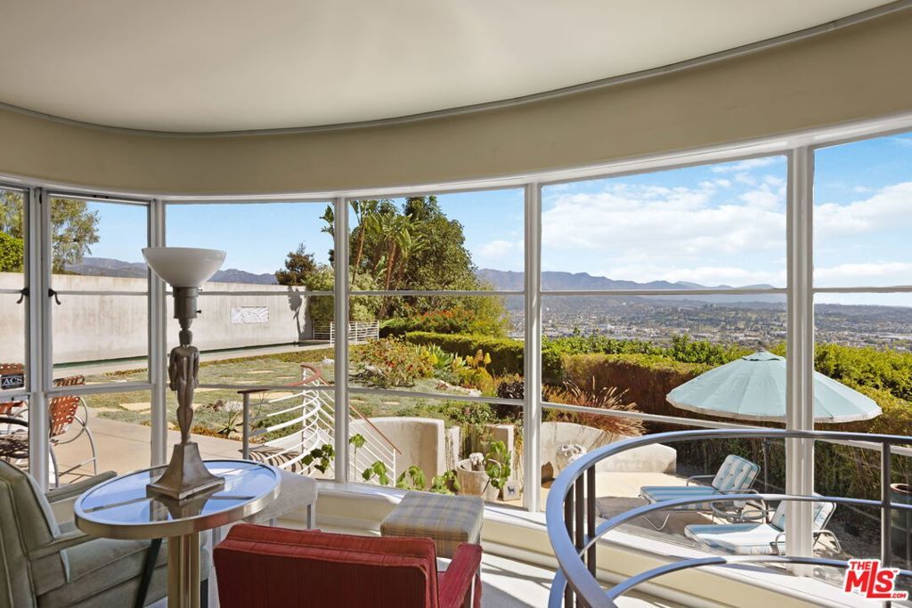 Set above the city with sweeping, panoramic views, this streamline moderne residence offers a rare blend of character, volume, timeless design, and classic Hollywood glamor. Spanning approximately 3,132 square feet, this 4-bedroom, 4-bathroom home is thoughtfully designed to embrace both comfortable daily living and exceptional entertaining. A dramatic living room welcomes you with soaring ceilings, expansive walls for art, and abundant natural light pouring through walls of glass that frame the stunning vistas beyond. A striking spiral staircase adds a sculptural focal point while leading to a private media/screening room complete with wet bar and powder room---an ideal retreat for entertainment and relaxation. The adjacent dining room is perfectly suited for both intimate gatherings and larger-scale entertaining, seamlessly connected to the home's open and airy layout. The kitchen retains its classic charm while offering generous workspace, an adjoining butler's pantry, and convenient access to the main living areas. A dedicated laundry area and additional service spaces enhance everyday functionality. The first floor also features a versatile den/office with bath, ideal for a home workspace, along with a separate guest or maid's bedroom and bath, offering flexibility for a variety of living arrangements. Upstairs, the primary suite serves as a private retreat, complete with its own luxurious bath and direct access to an expansive upper deck perfect for taking in morning light or evening sunsets. A second bedroom, currently configured as an office, also opens to the deck, creating a seamless indoor-outdoor connection. A third bedroom completes the upper level and shares a Jack-and-Jill bath. Outdoor living is equally compelling, featuring a covered patio overlooking a pool and spa, all set against breathtaking views. A step-down seating area with a fountain provides an additional intimate space for relaxation or entertaining, enhancing the home's tranquil and resort-like atmosphere. Throughout, unique streamline moderne architectural elements, curated interiors, and an undeniable sense of personality create a one-of-a-kind living experience. Only the second time on the market, this residence was featured in the L.A. Times Home Section in November 2006---offering a rare opportunity to own a home that combines architectural interest, functional design, and an exceptional setting.