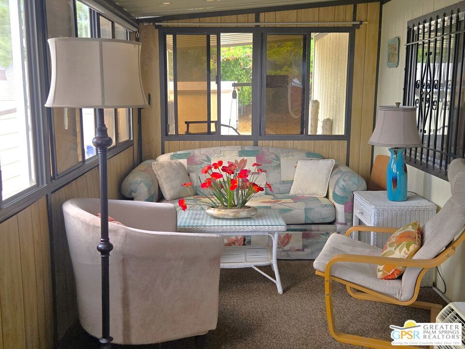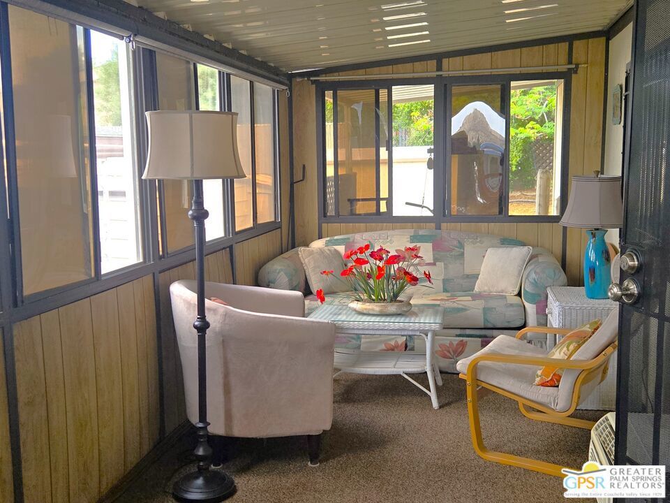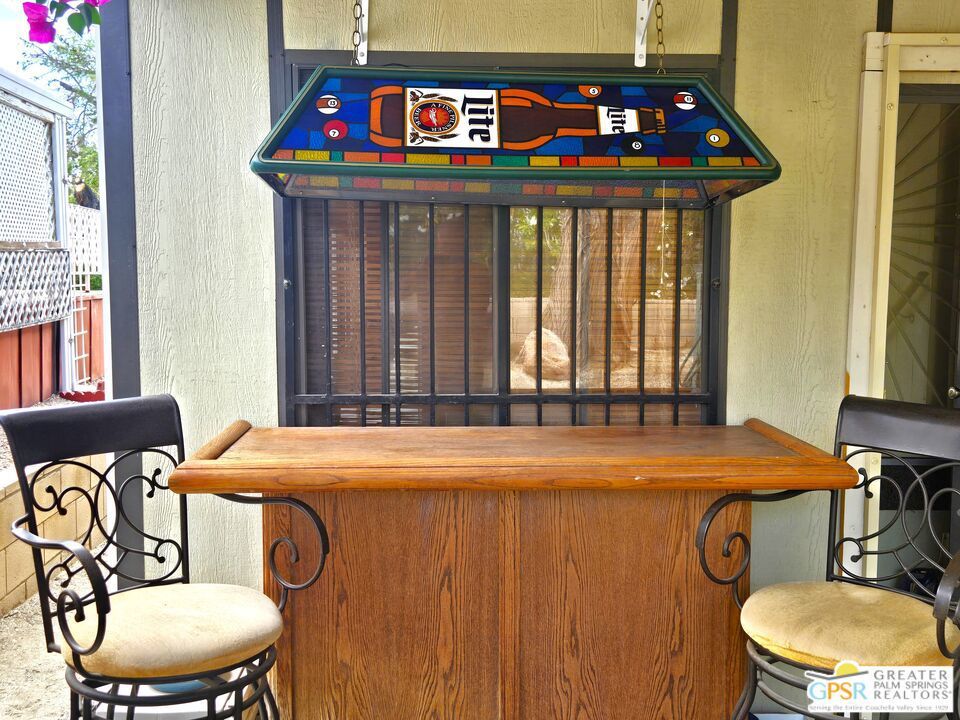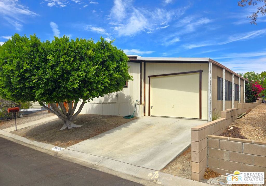 Experience the ultimate 55+ lifestyle in this beautifully renovated, fully-furnished retreat. Situated on a quiet cul-de-sac within the serene Desert Crest Country Club, this 1,240 SF, 2 Bedroom and 2 Bath residence offers a rare blend of modern comfort and active community living. Best of all? You own the land (Fee Simple), ensuring long-term stability and value. Upon arrival, you'll notice the practicality of the home's exterior, designed not only for curb appeal but also for convenience. With the Southeast-facing covered patio, you have the tranquil outdoor space that is perfect for enjoying the sunshine while surrounded by palm tree decorated screening. Through the front door, you'll enter the Sunroom that is comfortably carpeted, and then accessing another door you enter the immense Living Room that has an attached Dining Area. Heavily remodeled, the newer laminate wood flooring and tile offers fresh and elegant aesthetics that flow all the way throughout the interior, while a central divider wall gives you multiple seating in the Living Room and a designer Kitchen armoire. The Kitchen has exactly what you need to entertain friends and family. The thoughtfully designed layout features expansive laminate countertops, a newer modern composite sink, a sleek Kenmore gas range, a stainless-steel Kenmore dishwasher and LG refrigerator, all designed to make meal preparation enjoyable rather than a mere necessity. The seamless transition between spaces allows for effortless entertaining and relaxation, while the more privatized Bedrooms provide warm and inviting retreats that ensure restful nights in a cozy atmosphere. Before you arrive there, you find the separate Laundry Room with a matching set of LG Washer & Dryer, and direct Garage access from the interior of the home. The one vehicle Garage provides ample oversized space for parking your vehicle, and has plenty of storage capability as well. Along the hall, the Master Bedroom serves as your personal sanctuary, designed for ultimate relaxation and ease. With a wall of mirror clad closet space providing generous storage and an ensuite Master Bath with sink area and garden tub allowing for convenience, this room embodies thoughtful design, catering to both comfort and practicality. The second Bedroom is spacious and inviting, while the separate second Bath has a newer granite counter topped vanity with built-in white under sink, giving a sleek look to the room. Outside, the Rear Yard offers areas to lounge, barbecue and relax, including a fully covered patio area to enjoy the outside with shade & calm. Beyond the home itself, Desert Crest Country Club boasts a wealth of amenities that elevate everyday living. Enjoy a bright morning or afternoon on the par-3 golf course with ponds, challenging friends or honing your skills in a scenic setting. Afterward, unwind in the natural mineral water spas and pools, where relaxation takes center stage. For year-round enjoyment, a covered shuffleboard court offers an engaging pastime no matter the season and keeps you healthy. The community's impressive clubhouse stands as a testament to its commitment to luxury and social engagement, providing a welcoming space for events, gatherings, and activities. With gym facilities, banquet room, reading room, billiards table and meeting areas for you and your fellow Owners with an extremely low monthly fee. You even have a wonderful daytime Diner, Real Estate office, and animal groomer at the entry to the community. This beautifully maintained and renovated residence is more than just a home; it's an opportunity to embrace a lifestyle of tranquility, leisure, and refined living. With fee simple land ownership included, this is a rare find that ensures long-term stability and value. Don't miss the chance to experience the charm and sophistication of Desert Crest Country Club firsthand. Contact us today to schedule a viewing, and step into the elegant and active lifestyle you deserve. Welcome Home!