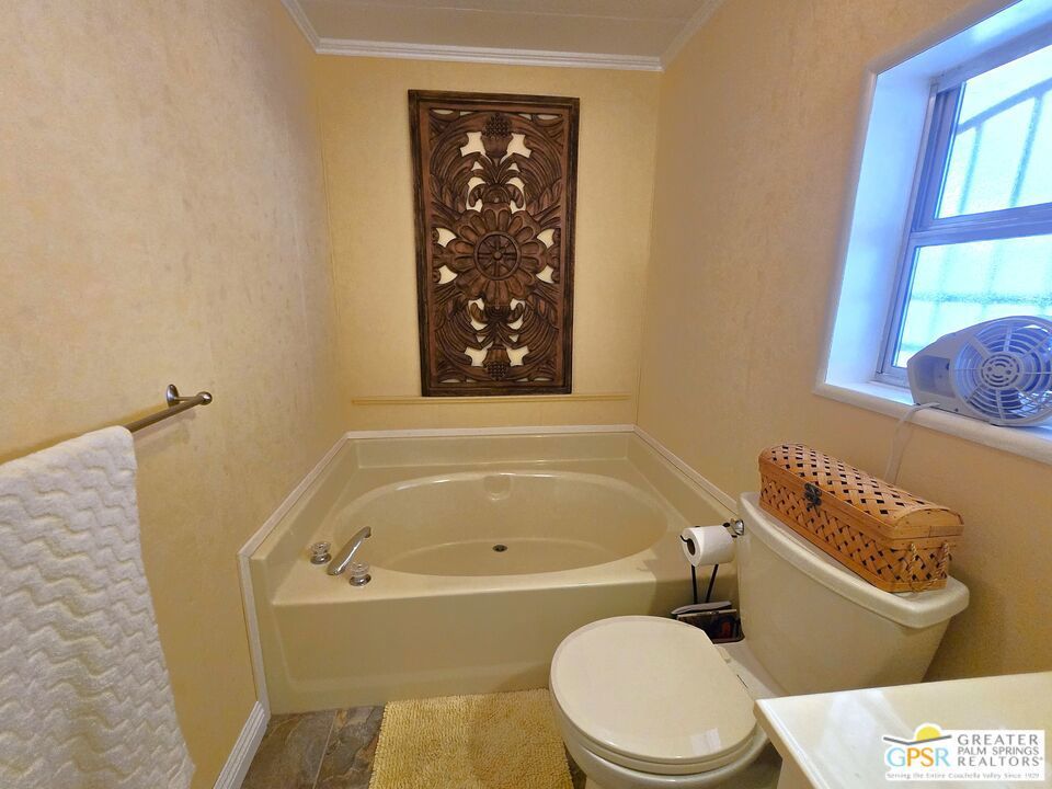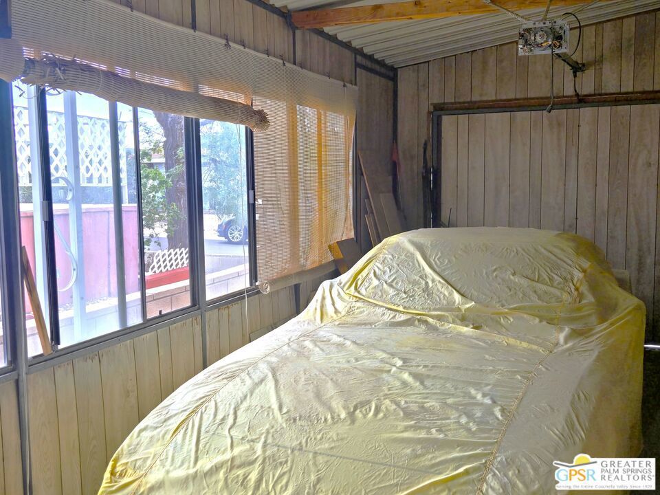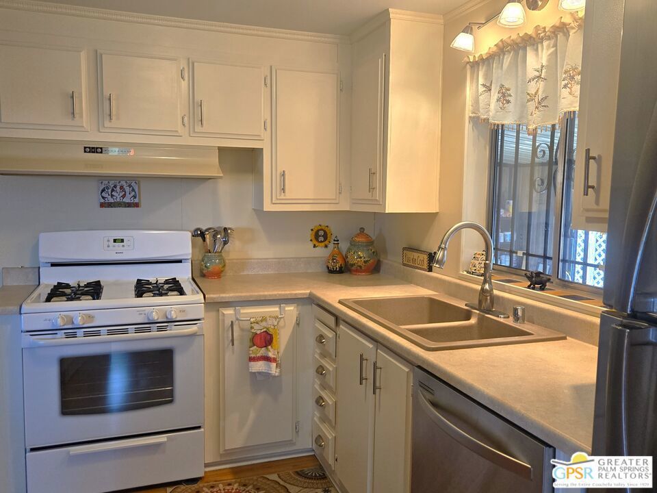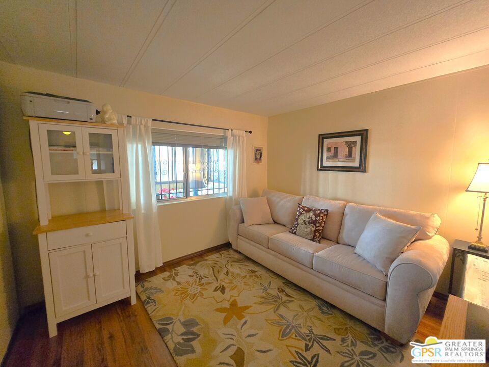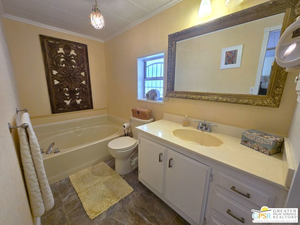 Experience the ultimate 55+ lifestyle in this beautifully renovated, fully-furnished retreat. Situated on a quiet cul-de-sac within the serene Desert Crest Country Club, this 1,240 SF, 2 Bedroom and 2 Bath residence offers a rare blend of modern comfort and active community living. Best of all? You own the land (Fee Simple), ensuring long-term stability and value. Upon arrival, you'll notice the practicality of the home's exterior, designed not only for curb appeal but also for convenience. With the Southeast-facing covered patio, you have the tranquil outdoor space that is perfect for enjoying the sunshine while surrounded by palm tree decorated screening. Through the front door, you'll enter the Sunroom that is comfortably carpeted, and then accessing another door you enter the immense Living Room that has an attached Dining Area. Heavily remodeled, the newer laminate wood flooring and tile offers fresh and elegant aesthetics that flow all the way throughout the interior, while a central divider wall gives you multiple seating in the Living Room and a designer Kitchen armoire. The Kitchen has exactly what you need to entertain friends and family. The thoughtfully designed layout features expansive laminate countertops, a newer modern composite sink, a sleek Kenmore gas range, a stainless-steel Kenmore dishwasher and LG refrigerator, all designed to make meal preparation enjoyable rather than a mere necessity. The seamless transition between spaces allows for effortless entertaining and relaxation, while the more privatized Bedrooms provide warm and inviting retreats that ensure restful nights in a cozy atmosphere. Before you arrive there, you find the separate Laundry Room with a matching set of LG Washer & Dryer, and direct Garage access from the interior of the home. The one vehicle Garage provides ample oversized space for parking your vehicle, and has plenty of storage capability as well. Along the hall, the Master Bedroom serves as your personal sanctuary, designed for ultimate relaxation and ease. With a wall of mirror clad closet space providing generous storage and an ensuite Master Bath with sink area and garden tub allowing for convenience, this room embodies thoughtful design, catering to both comfort and practicality. The second Bedroom is spacious and inviting, while the separate second Bath has a newer granite counter topped vanity with built-in white under sink, giving a sleek look to the room. Outside, the Rear Yard offers areas to lounge, barbecue and relax, including a fully covered patio area to enjoy the outside with shade & calm. Beyond the home itself, Desert Crest Country Club boasts a wealth of amenities that elevate everyday living. Enjoy a bright morning or afternoon on the par-3 golf course with ponds, challenging friends or honing your skills in a scenic setting. Afterward, unwind in the natural mineral water spas and pools, where relaxation takes center stage. For year-round enjoyment, a covered shuffleboard court offers an engaging pastime no matter the season and keeps you healthy. The community's impressive clubhouse stands as a testament to its commitment to luxury and social engagement, providing a welcoming space for events, gatherings, and activities. With gym facilities, banquet room, reading room, billiards table and meeting areas for you and your fellow Owners with an extremely low monthly fee. You even have a wonderful daytime Diner, Real Estate office, and animal groomer at the entry to the community. This beautifully maintained and renovated residence is more than just a home; it's an opportunity to embrace a lifestyle of tranquility, leisure, and refined living. With fee simple land ownership included, this is a rare find that ensures long-term stability and value. Don't miss the chance to experience the charm and sophistication of Desert Crest Country Club firsthand. Contact us today to schedule a viewing, and step into the elegant and active lifestyle you deserve. Welcome Home!