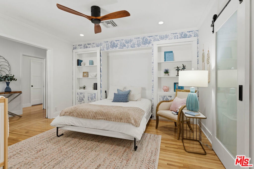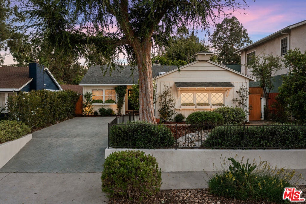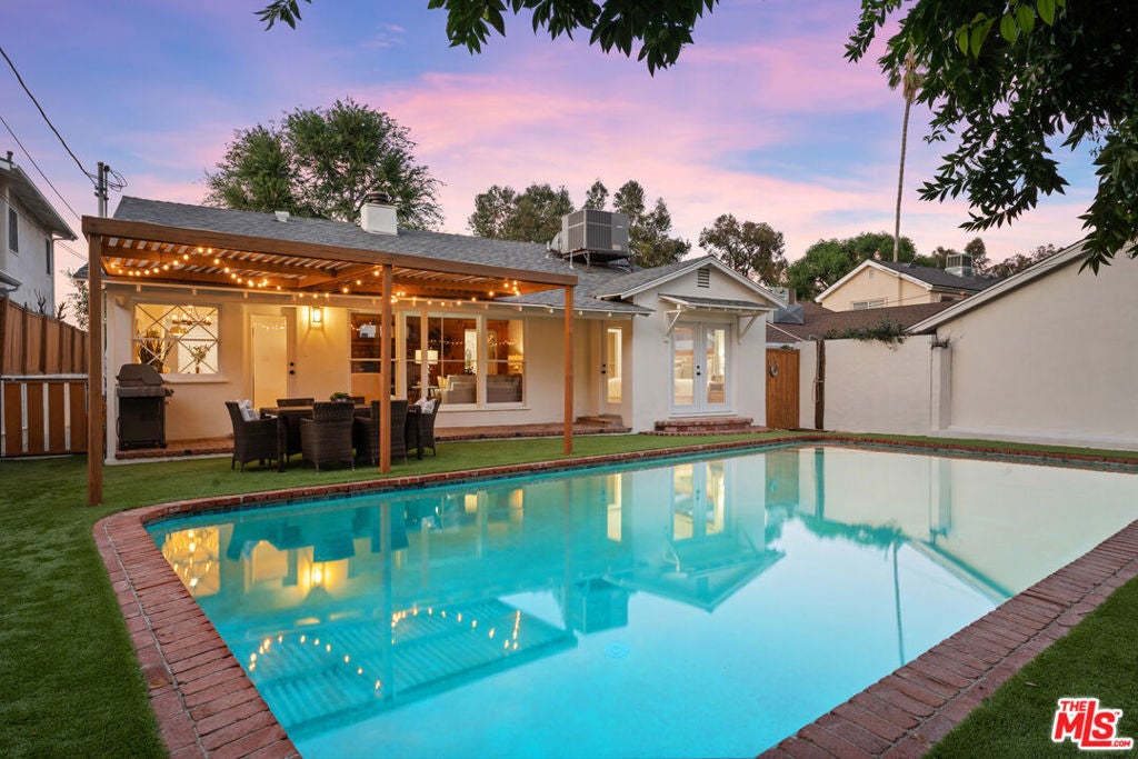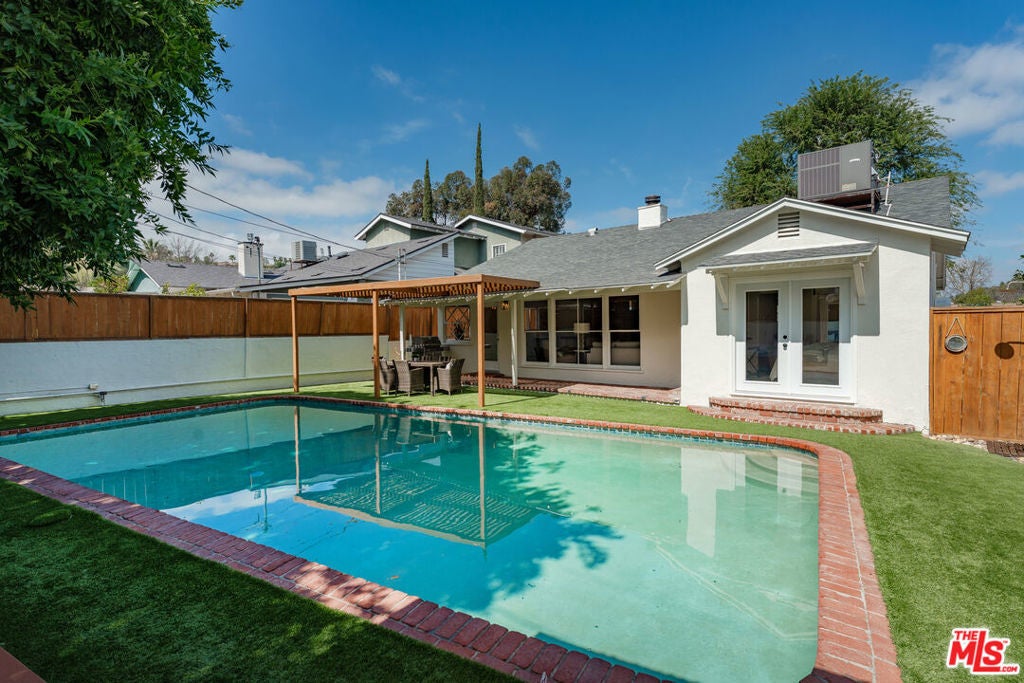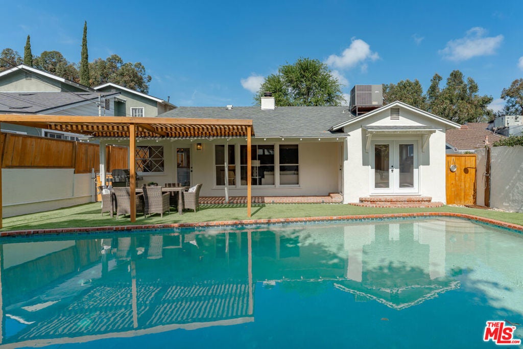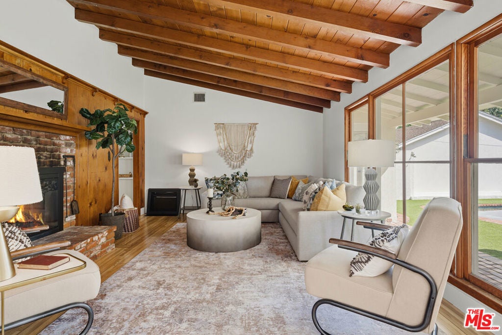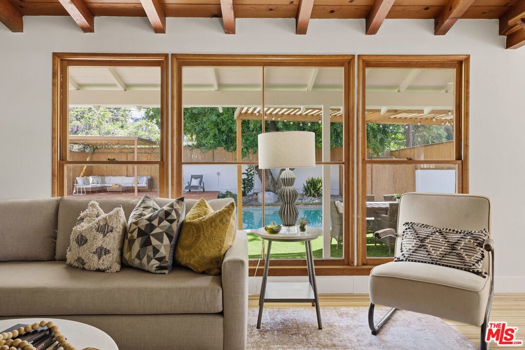 Simply stunning single story home in prime Woodland Hills location. This home has been remodeled with discerning taste, combining contemporary style with charming warmth. With wood floors throughout the main areas, the home exudes clean lines and modern amenities while maintaining its mid century charm. The spacious family room features a beamed vaulted ceiling, fireplace and original bookcase. It opens to the light and bright dining area that leads out to the backyard and patio. The kitchen has quartz countertops and stainless steel appliances with a breakfast bar that is connected to the dining area. The primary suite opens out to the yard and patio, and boasts a built-in closet that lead to the gorgeous modern bath with shower and dual vanity. The large secondary bedroom is assigned to another beautiful bathroom with a freestanding tub/shower enclosure. The third bedroom/den is equipped with hidden closets and a murphy bed so it can function as either a bedroom or office depending upon your needs. The private backyard is an entertainer's delight and has a large pool flanked by turf. There is a patio and overhang for al fresco dining just off the back of the house, which is also perfect for a coffee break. Behind the pool is a pool cabana covered in wisteria and built for relaxation. With a two car garage and fenced front yard area, this home has everything!
