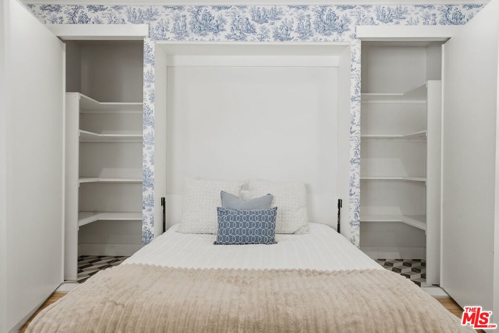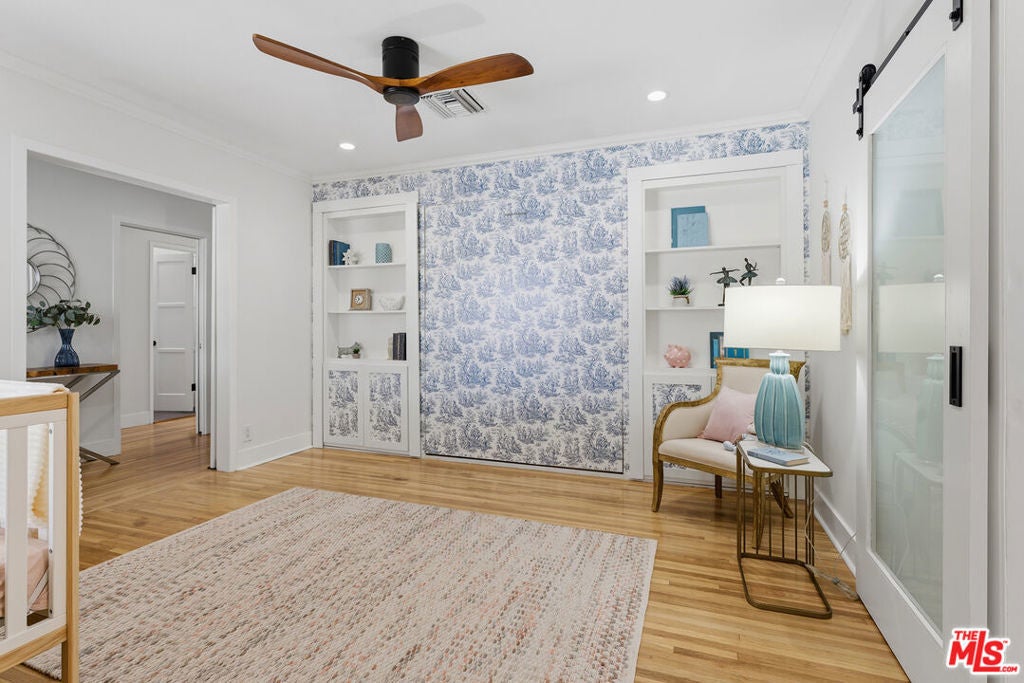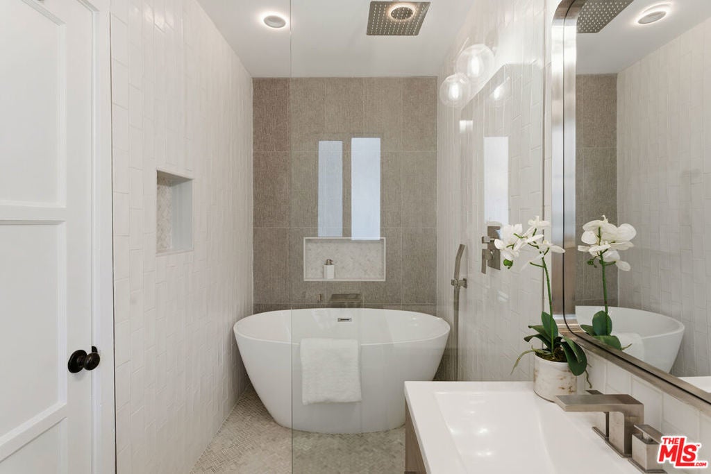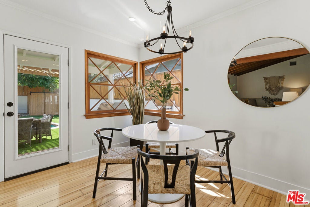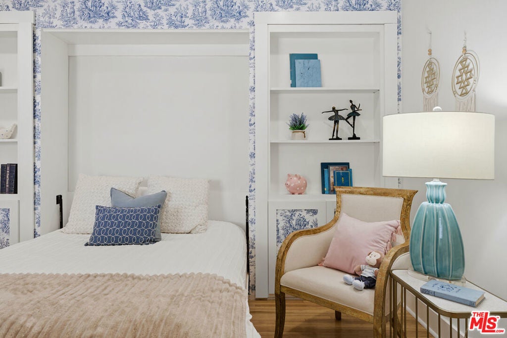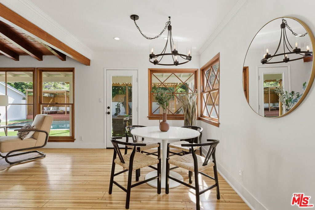 Simply stunning single story home in prime Woodland Hills location. This home has been remodeled with discerning taste, combining contemporary style with charming warmth. With wood floors throughout the main areas, the home exudes clean lines and modern amenities while maintaining its mid century charm. The spacious family room features a beamed vaulted ceiling, fireplace and original bookcase. It opens to the light and bright dining area that leads out to the backyard and patio. The kitchen has quartz countertops and stainless steel appliances with a breakfast bar that is connected to the dining area. The primary suite opens out to the yard and patio, and boasts a built-in closet that lead to the gorgeous modern bath with shower and dual vanity. The large secondary bedroom is assigned to another beautiful bathroom with a freestanding tub/shower enclosure. The third bedroom/den is equipped with hidden closets and a murphy bed so it can function as either a bedroom or office depending upon your needs. The private backyard is an entertainer's delight and has a large pool flanked by turf. There is a patio and overhang for al fresco dining just off the back of the house, which is also perfect for a coffee break. Behind the pool is a pool cabana covered in wisteria and built for relaxation. With a two car garage and fenced front yard area, this home has everything!