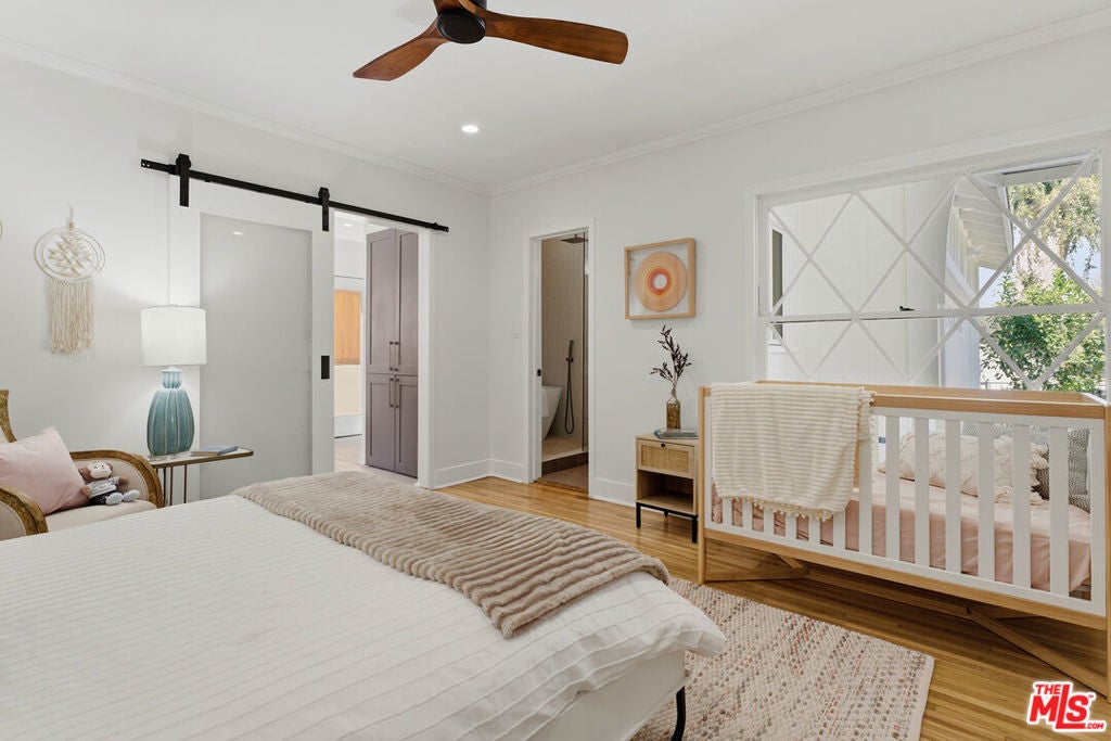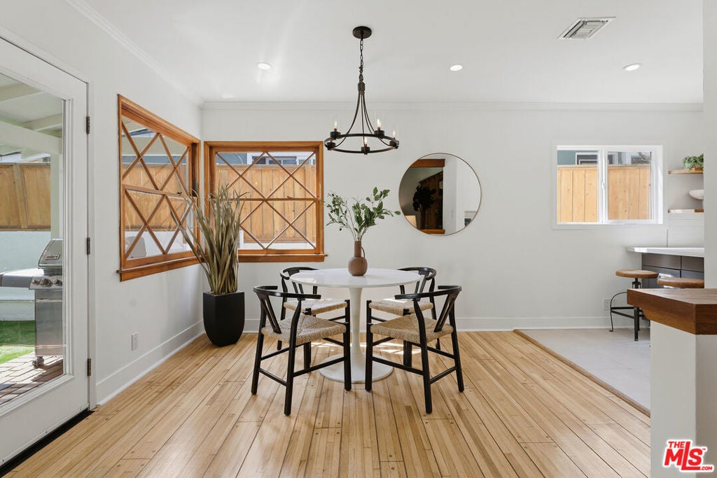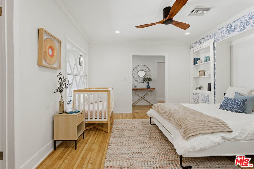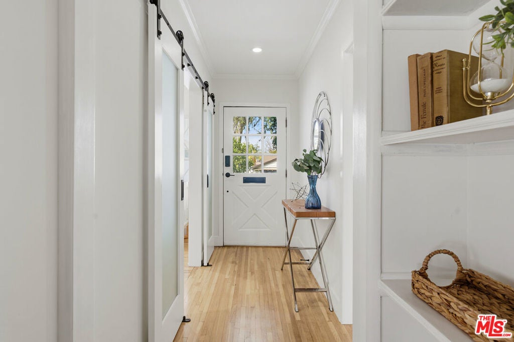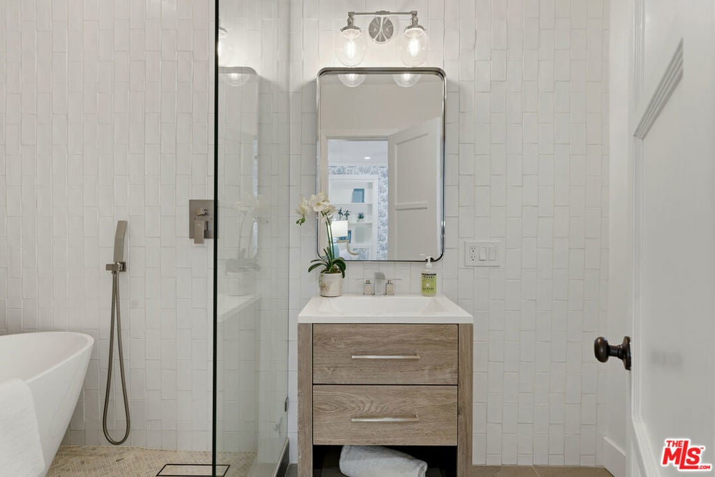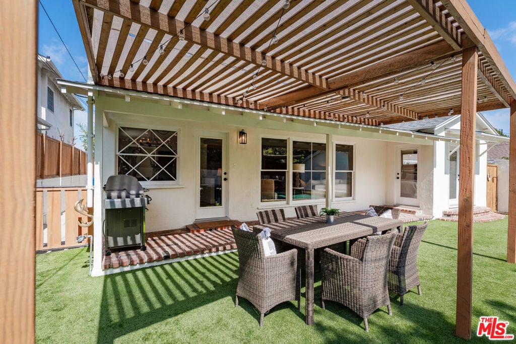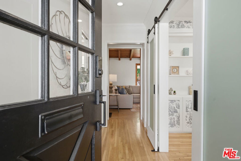 Simply stunning single story home in prime Woodland Hills location. This home has been remodeled with discerning taste, combining contemporary style with charming warmth. With wood floors throughout the main areas, the home exudes clean lines and modern amenities while maintaining its mid century charm. The spacious family room features a beamed vaulted ceiling, fireplace and original bookcase. It opens to the light and bright dining area that leads out to the backyard and patio. The kitchen has quartz countertops and stainless steel appliances with a breakfast bar that is connected to the dining area. The primary suite opens out to the yard and patio, and boasts a built-in closet that lead to the gorgeous modern bath with shower and dual vanity. The large secondary bedroom is assigned to another beautiful bathroom with a freestanding tub/shower enclosure. The third bedroom/den is equipped with hidden closets and a murphy bed so it can function as either a bedroom or office depending upon your needs. The private backyard is an entertainer's delight and has a large pool flanked by turf. There is a patio and overhang for al fresco dining just off the back of the house, which is also perfect for a coffee break. Behind the pool is a pool cabana covered in wisteria and built for relaxation. With a two car garage and fenced front yard area, this home has everything!