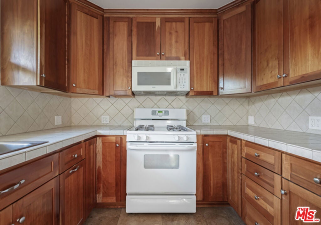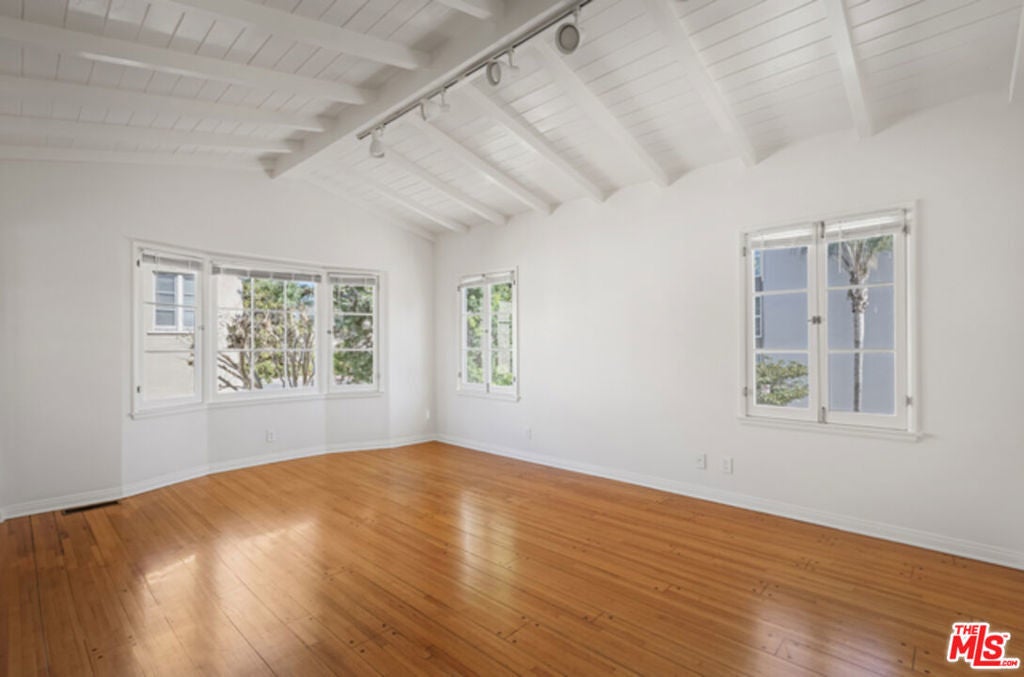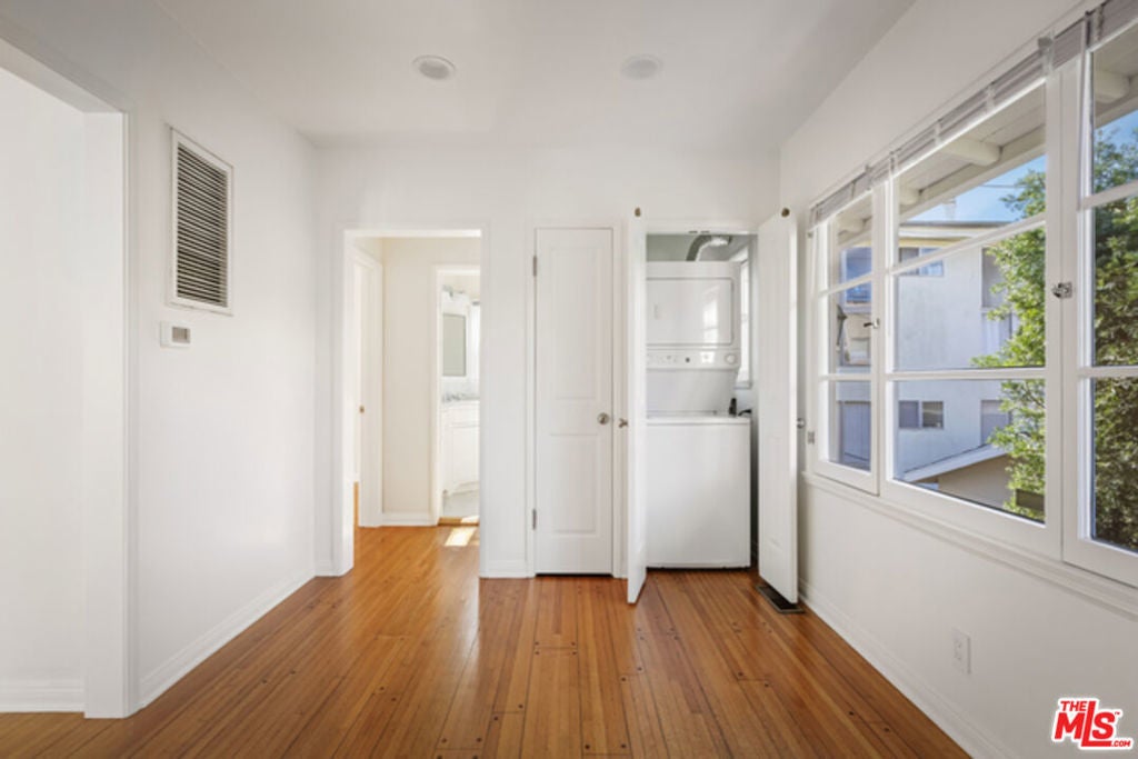 Gorgeous, Renovated, Private, Stand-Alone Upper 1 bd/1 bath Unit Over Garages in Spanish Triplex. Incredibly cozy gated home that stands on its own; no shared walls with any neighbors. Sunny throughout with vaulted beam ceilings and bay window in living room. New kitchen has cherry cabinets, travertine tile floor with dishwasher, refrigerator, stove, and microwave. Separate dining area adjacent to kitchen. New washer and dryer in unit. Central A/C and heating. Recessed lighting and custom fixtures. Electric remote entry for one car garage. Beautiful property. Must see!